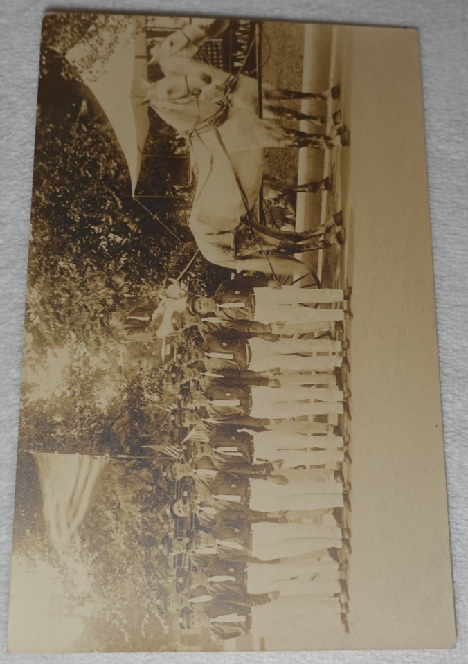 Group of Men in Uniform Horses Parade Historical Unknown Original RPPC Postcard Measures approximately 3 1/2" x 5 3/8". Item has writing and marks on the reverse side. Postcard is in antique condition with dinged edges and corners, surface scratches, creasing, age discoloration and marks. There is some chipping along the top edge. Please see photos for more information on condition and ask any questions you may have.
