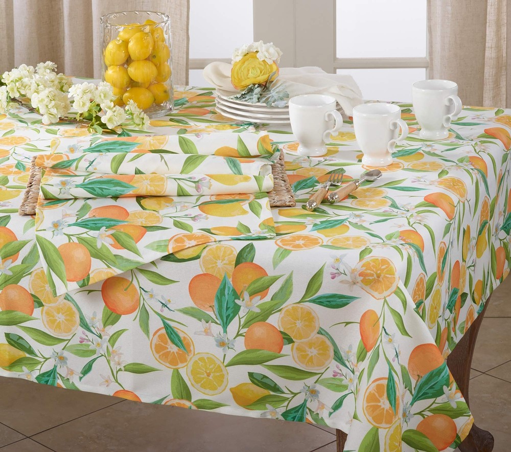 Transform your everyday dining experience with this beautiful, vibrant and downright fun Lemon & Orange Print Table Runner. While it is certain to brighten up your family meals, it's also a stylish touch for casual entertaining. Can be used for both indoor and outdoor dining. Size: 16" x 72" Oblong Runner is unlined Material: 100% polyester + Care: machine wash Vivid colors and print brings Summer vibes into your door. Fresh and fun fruit design adds a lively touch to the table.