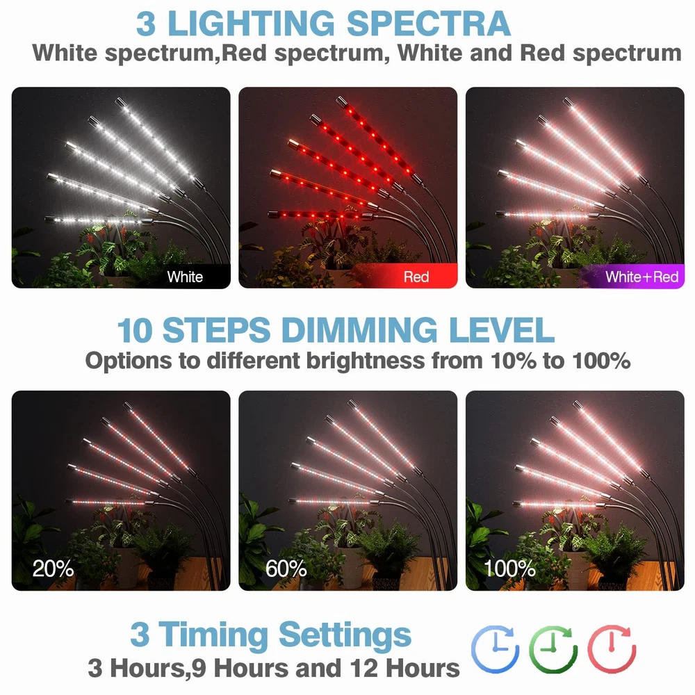 5 Head 150 LEDs Plant Light for Indoor Plants: This plant growing lamp consists of 150 effective growing LEDs, divided into 120 white LEDs and 30 red LEDs. The 5 heads grow light for indoor plants supplies a broader lighting range than the traditional 2, 3, and 4 heads indoor plants lights, and increases the intensity of the light by up to 50%, allowing your plants to receive better and extra light energy. 3 Spectrum Modes & 10 Brightness Levels: The full spectrum led grow light has 3 spectrum modes, which are Red, Full, and Mixed Spectrum. It has ten brightness settings, starting from 10% to 100%, that can be switched as per your requirements, so you are able to choose the more proper spectrum and brightness for your plant to grow in the best way. The indoor plant lights make your plants develop a rapid response to grow, five times faster than plants with natural light only. Auto Timer Function & On/Off Cycle: Designed with a function for autocycle memory timing, there are different three timer settings for you to choose from, between 3H, 9H, and 12H of lighting time. Following your setting, the plant grow light will switch on/off automatically every day. Even when you are away from home, these grow light lamps will take good care of your plants every day. Flexible Gooseneck Neck & Strong Clip: You can place and clamp the 5 head grow light anywhere as it has a strong clip and bracket support for it to be stable. The indoor grow lights have a 360 rotation design that can be independently adjustable, so each can be rotated to any angle to adapt to your requirements, which supplies a wider and more flexible range of light, and different growing directions. Designed for Indoor Plants to Growth: These plant lights for indoor growing is perfect for the different sunlight needs of your plants depending on their growing stage, from seeds to every growing phase. The lamps have an excellent performance of fast heat dissipation, which ensures that these lamps provide you with a long-lasting and durable service life of up to 80,000 hours. mounting type: Inside Mount