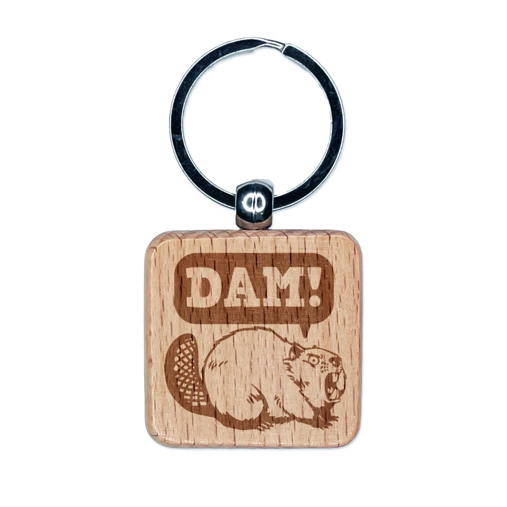 Grumpy Beaver Yelling Dam Engraved Wood Square Keychain Tag Charm