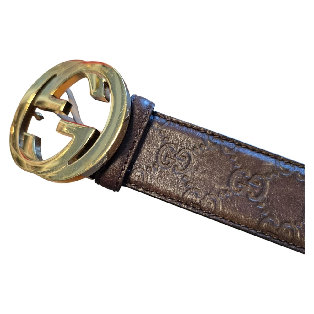 Gucci Women's Brown Leather Belt With Gold Logo Buckle Authentic and Stamped Elevate your wardrobe with an authentic timeless Gucci brown leather belt, impeccably crafted in Italy and stamped for guaranteed quality and authenticity. This classic accessory features a gold-plated buckle that adds a touch of luxury to any outfit, complemented by the iconic Gucci logo accent. Designed for women, this belt boasts a versatile brown hue and a solid pattern that pairs effortlessly with both casual and formal attire. The belt measures 30 inches to the middle hole, providing a snug fit for a waist size of 29-30 inches, and is of a normal width for comfortable wear. It's an essential addition to your accessory collection, embodying the timeless style and prestige synonymous with the Gucci brand. Whether it's for everyday use or special occasions, this belt brings an element of sophistication to your look. Measurements: 30 inches from end of leather (where belt buckle starts) to middle hole on belt 37 inches from tip to tip of leather only 39 inches from tip of leather to end of buckle Buckle is 2.75 inches in circumference