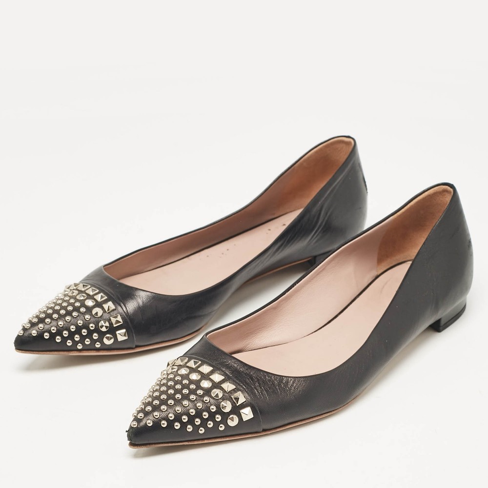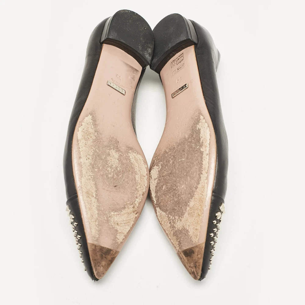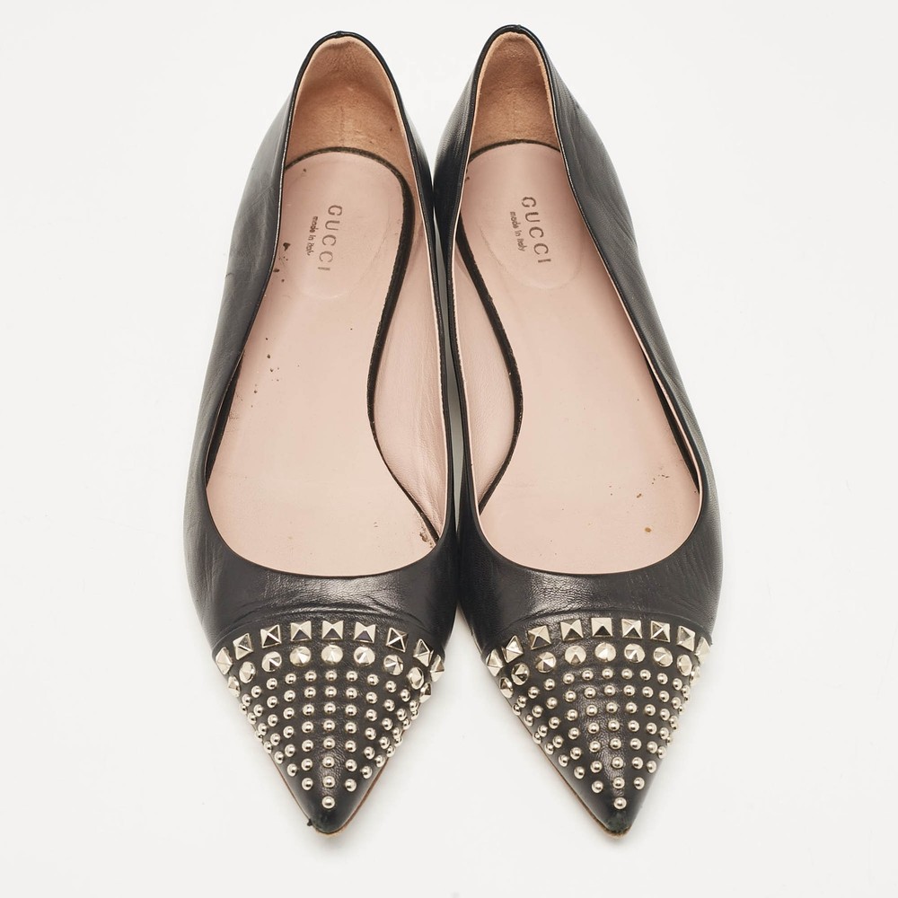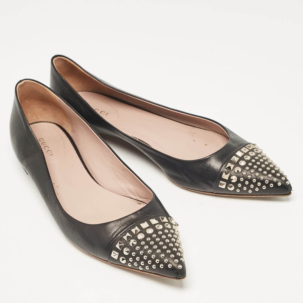 Defined by comfort and effortless style, no wardrobe is ever complete without a pair of chic ballet flats. This pair is lovely to look at and is equipped with elements like a comfortable insole and a durable sole.Certified by The Luxury Closet - This item has gone through a detailed authentication process overseen by our experts. We offer a lifetime guarantee of authenticity on all our items. Import duties, taxes and charges are not included in the item price. These charges are the buyers responsibility. Please check with your country’s customs office to determine what these additional cost will be prior to buying. Our eBay Store About Us Contact Us Add to Favorite Sellers Gucci Black Leather Studded Cap Toe Ballet Flats Size 39 $151.8 Defined by comfort and effortless style, no wardrobe is ever complete without a pair of chic ballet flats. This pair is lovely to look at and is equipped with elements like a comfortable insole and a durable sole. Product Details Brand Color Black Dimensions Material Leather Size 39 Outsole Width 8.5 cm Outsole Length 27 cm Heel Height Includes The Luxury Closet Packaging Certified by The Luxury Closet This item has gone through a detailed authentication process overseen by our experts. We offer a lifetime guarantee of authenticity on all our items. How We Check The in-house team of experts at The Luxury Closet is highly trained to verify the authenticity and the condition of the luxury products. They ensure that only 100% authentic items are put on sale.The evaluation process is unique with its own mix of assessment criteria and differs according to the category. Each item is evaluated based on the following combination of hallmarks, hardware, stitching, symmetry, material, craftsmanship, stamping, codes, hologram stickers, and packaging. Our authenticators also check if the items have been modified or amended (e.g., aftermarket diamonds, replaced batteries, repaired bags, etc.) International Buyers Import duties, taxes and charges are not included in the item price. These charges are the buyers responsibility. Please check with your country’s customs office to determine what these additional cost will be prior to buying.