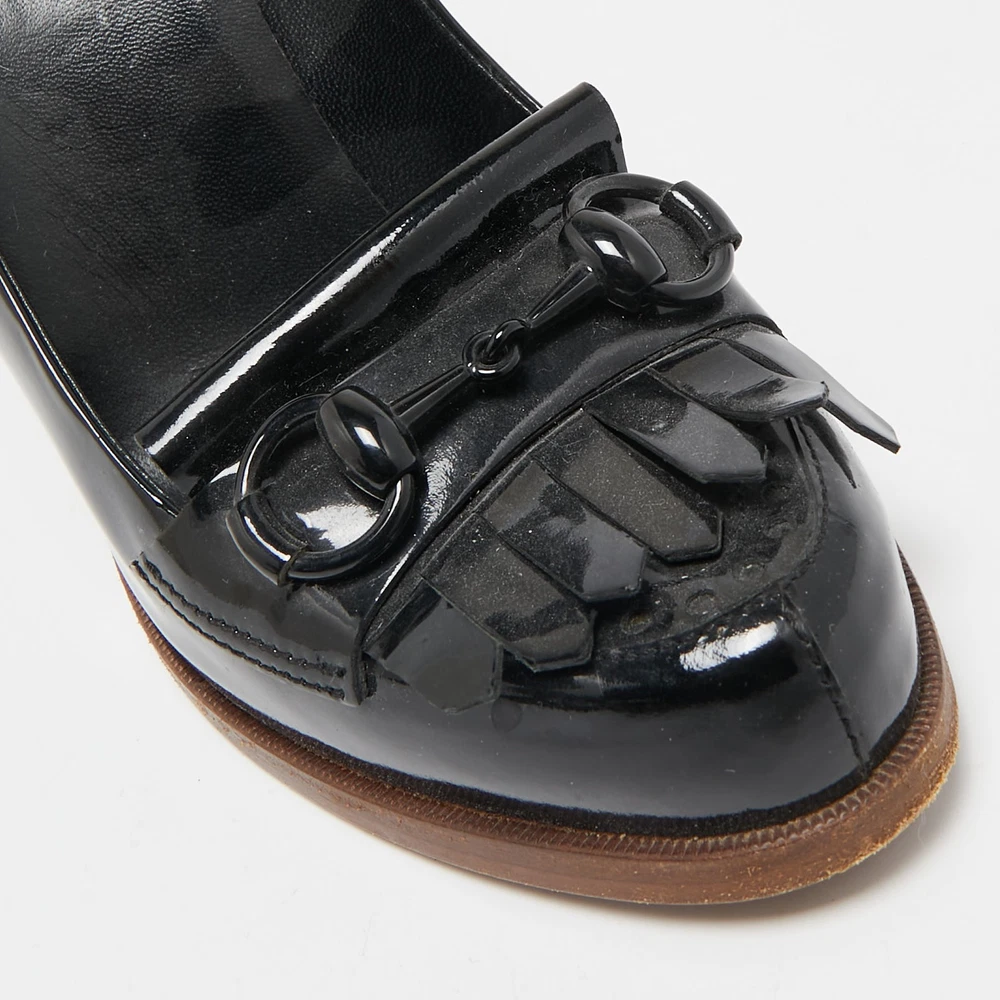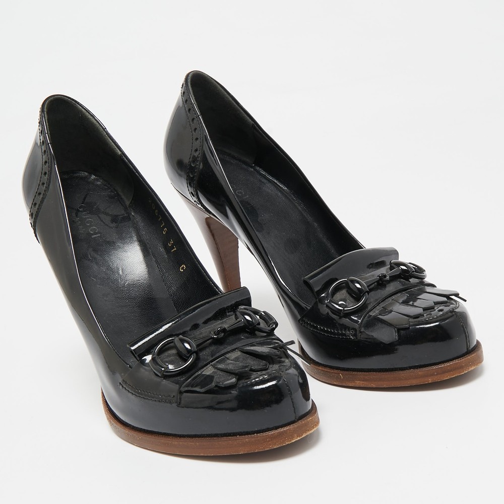 Make a statement with these designer pumps for women. Impeccably crafted, these chic heels offer both fashion and comfort, elevating your look with each graceful step.Certified by The Luxury Closet - This item has gone through a detailed authentication process overseen by our experts. We offer a lifetime guarantee of authenticity on all our items. Import duties, taxes and charges are not included in the item price. These charges are the buyers responsibility. Please check with your country’s customs office to determine what these additional cost will be prior to buying. Our eBay Store About Us Contact Us Add to Favorite Sellers Gucci Black Patent Leather Horsebit Fringe Loafer Pumps Size 37 $145.2 Make a statement with these designer pumps for women. Impeccably crafted, these chic heels offer both fashion and comfort, elevating your look with each graceful step. Product Details Brand Color Black Dimensions Material Patent Leather Size 37 Outsole Width 8 cm Outsole Length 20 cm Heel Height 11 cm Includes The Luxury Closet Packaging Certified by The Luxury Closet This item has gone through a detailed authentication process overseen by our experts. We offer a lifetime guarantee of authenticity on all our items. How We Check The in-house team of experts at The Luxury Closet is highly trained to verify the authenticity and the condition of the luxury products. They ensure that only 100% authentic items are put on sale.The evaluation process is unique with its own mix of assessment criteria and differs according to the category. Each item is evaluated based on the following combination of hallmarks, hardware, stitching, symmetry, material, craftsmanship, stamping, codes, hologram stickers, and packaging. Our authenticators also check if the items have been modified or amended (e.g., aftermarket diamonds, replaced batteries, repaired bags, etc.) International Buyers Import duties, taxes and charges are not included in the item price. These charges are the buyers responsibility. Please check with your country’s customs office to determine what these additional cost will be prior to buying.