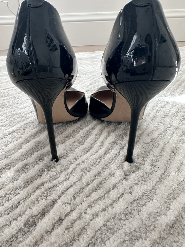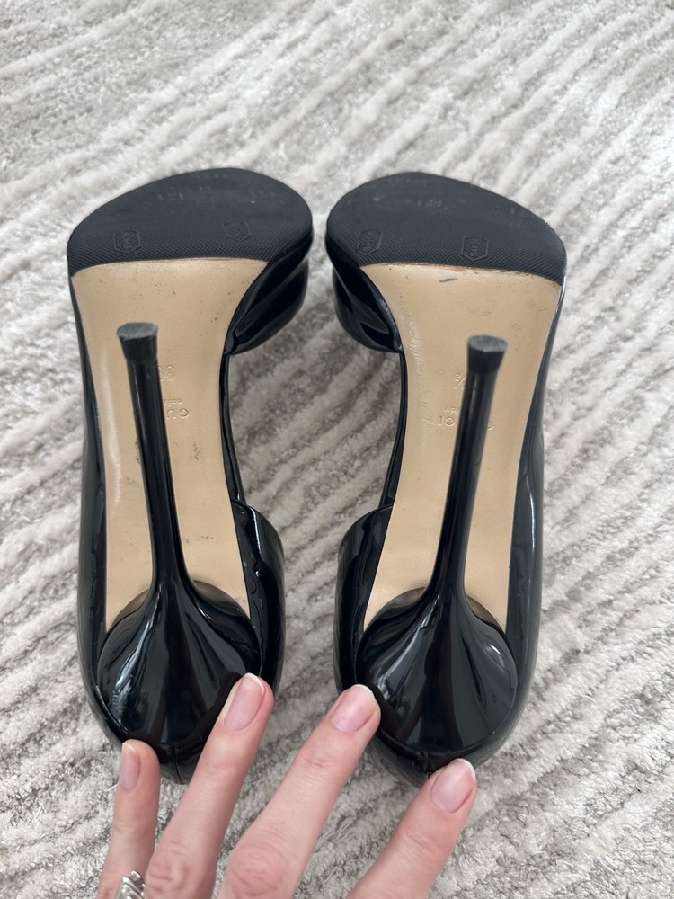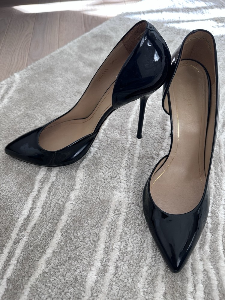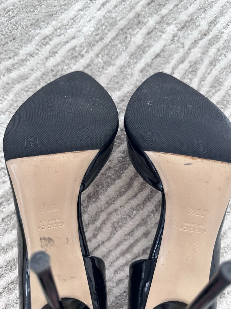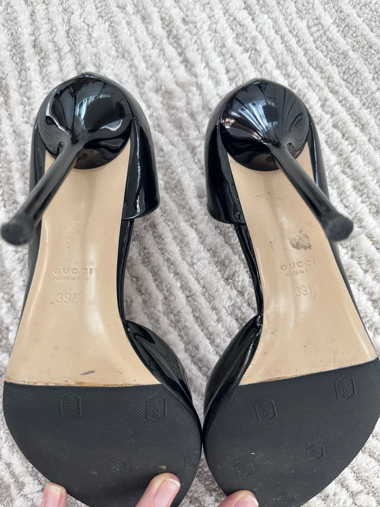 Occasion: Party/Cocktail Style: Pump Insole Material: Leather Customized: No Department: Women Lining Material: Leather Closure: Slip On Color: Black Vintage: Yes Toe Shape: Pointed Toe Type: Heel US Shoe Size: 10 Upper Material: Patent Leather Heel Height: High (3-3.9 in) Heel Style: Stiletto Country/Region of Manufacture: Italy Brand: Gucci Pattern: Solid EU Shoe Size: 38.5