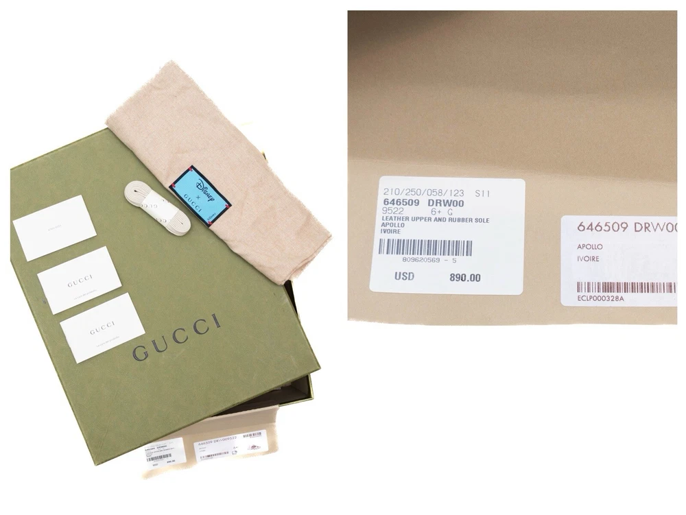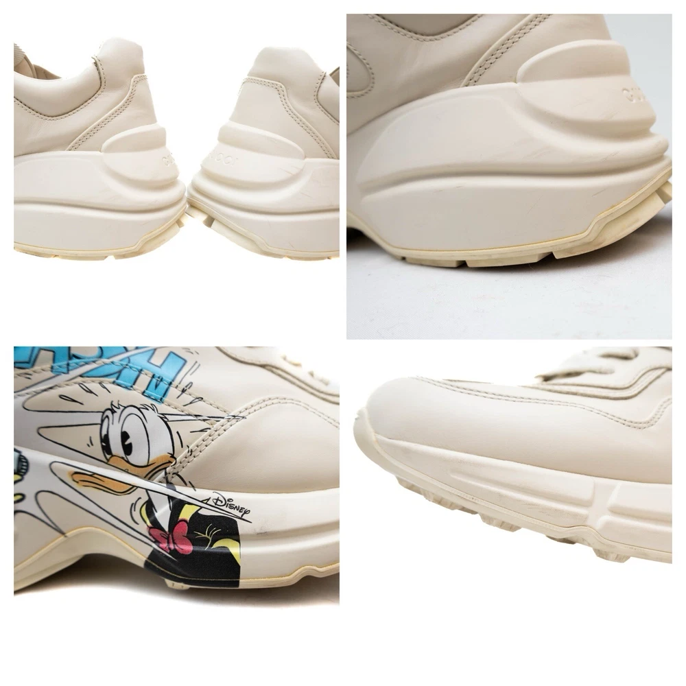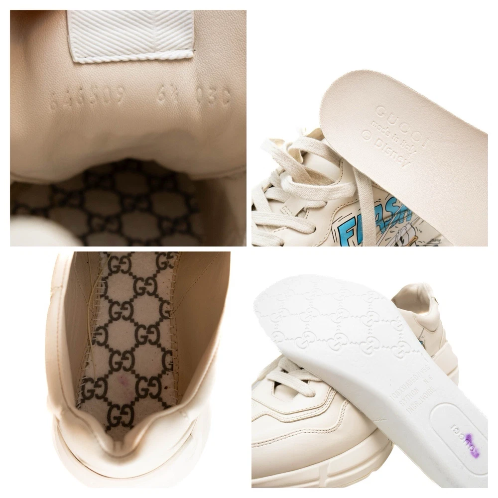 Gucci Rython X Disney Donald Duck Ivory Leather Sneakers Men’s Size US 11.5 Has a few stains as shown on pictures and the back heels have some stains )!!! Please Dbl check pictures before purchasing. - Size:(C) UK6.5 US7 ; EU 40; 24.4cm - Very Good Preowned Condition, check photos carefully (8.5/10) - 100% Authentic - Made in Italy - ART : 646509 - Gucci label at tongue - Upper: 100% Leather - Sole : 100% Rubber - Lining & Insole:leather - 45 mm height - Cool Pair Of Sneakers - Great Styling - Branded Sole - Donald Duck on the side - Premium Quality - Box and Dust Bag Included - Classic Styling - Famous Brand - Very Comfortable - Premium Quality - Minimalistic Design - Beast for Casual Looks