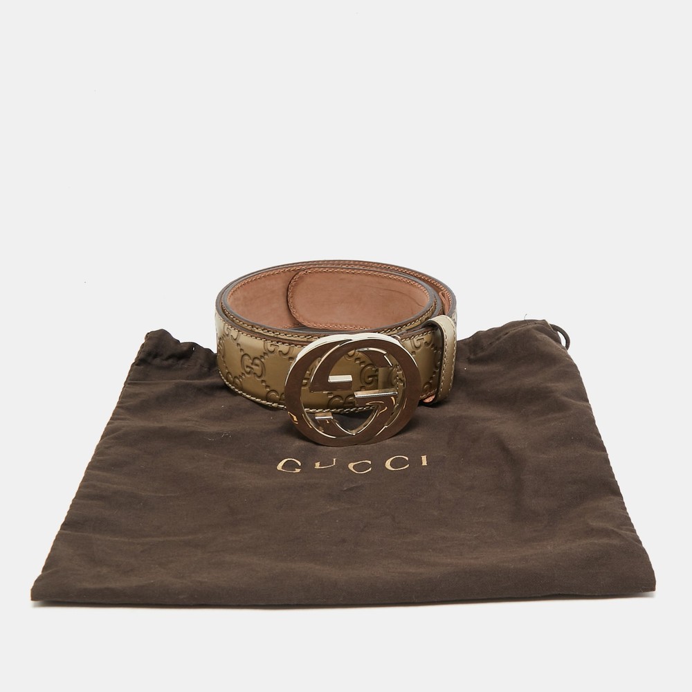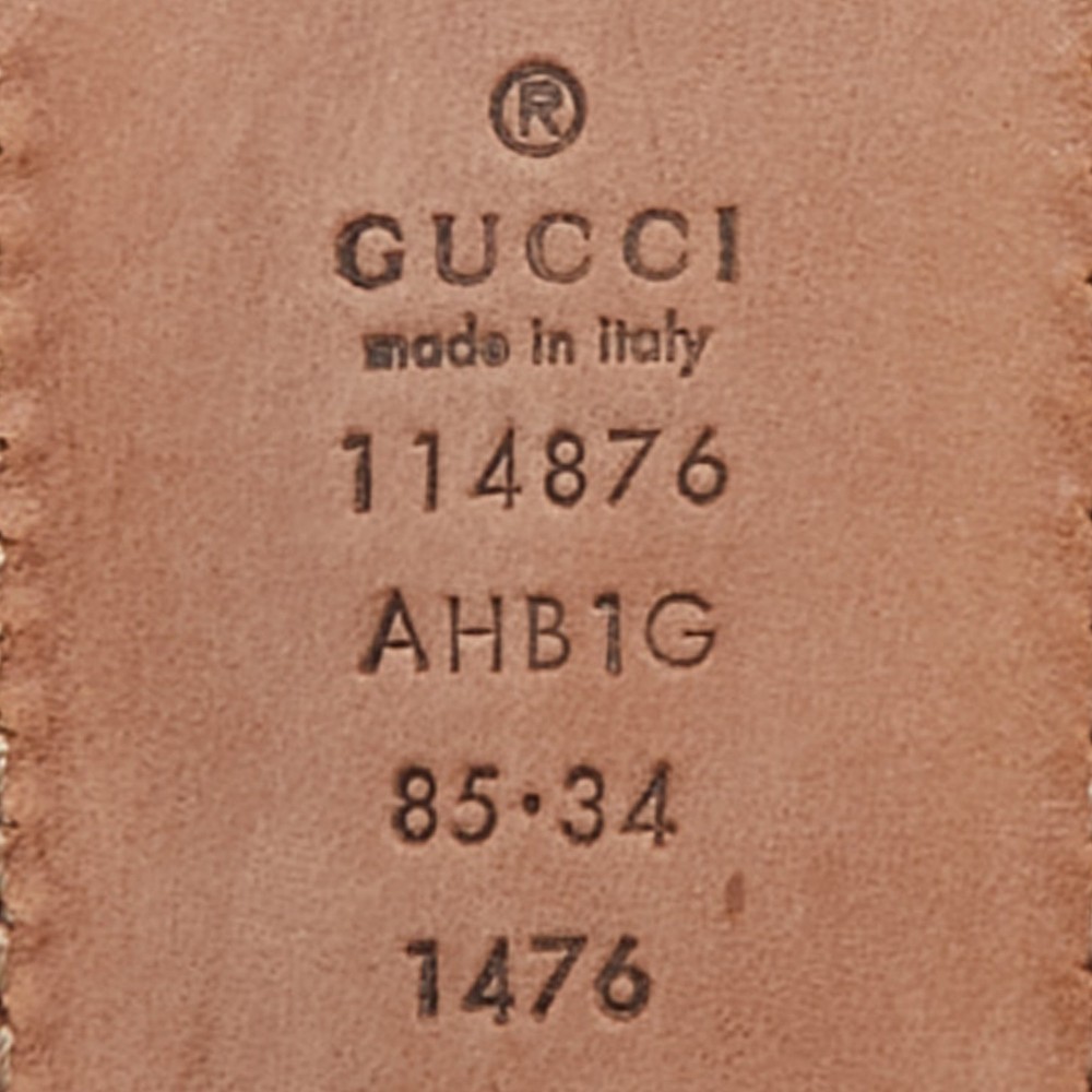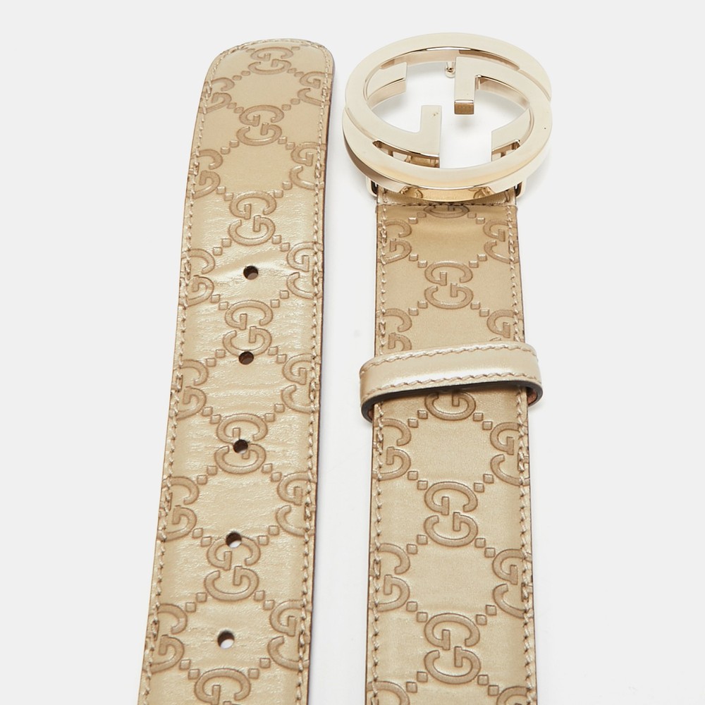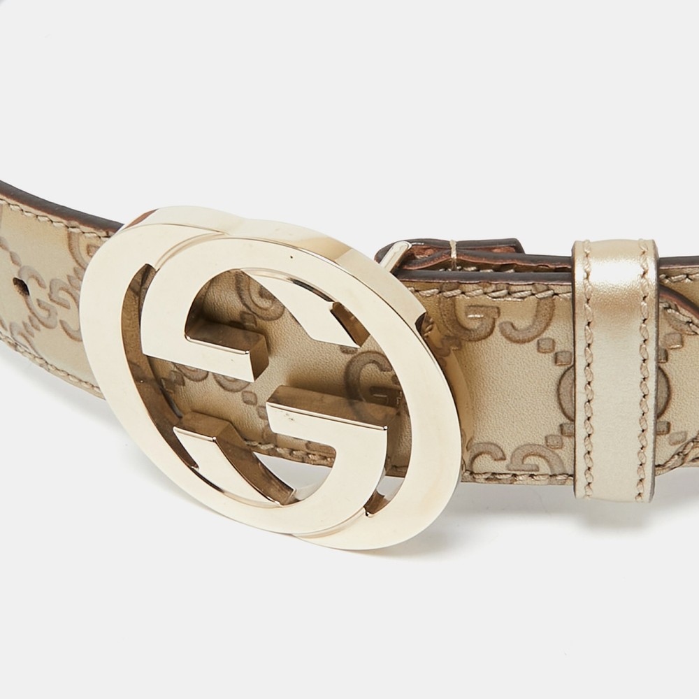 A classic add on to your collection of belts is this designer piece from Gucci. Cut to a convenient length, the belt has a smooth finish and a sturdy built. It will continually complement your style.Certified by The Luxury Closet - This item has gone through a detailed authentication process overseen by our experts. We offer a lifetime guarantee of authenticity on all our items. Import duties, taxes and charges are not included in the item price. These charges are the buyers responsibility. Please check with your country’s customs office to determine what these additional cost will be prior to buying. Our eBay Store About Us Contact Us Add to Favorite Sellers Gucci Gold Guccissima Leather Interlocking G Buckle Belt 85 CM $290.4 A classic add on to your collection of belts is this designer piece from Gucci. Cut to a convenient length, the belt has a smooth finish and a sturdy built. It will continually complement your style. Product Details Brand Color Gold Dimensions Width: 4 cm, Length: 85 cm Material Leather Size 85 CM Outsole Width Outsole Length Heel Height Includes Original Dustbag Certified by The Luxury Closet This item has gone through a detailed authentication process overseen by our experts. We offer a lifetime guarantee of authenticity on all our items. How We Check The in-house team of experts at The Luxury Closet is highly trained to verify the authenticity and the condition of the luxury products. They ensure that only 100% authentic items are put on sale.The evaluation process is unique with its own mix of assessment criteria and differs according to the category. Each item is evaluated based on the following combination of hallmarks, hardware, stitching, symmetry, material, craftsmanship, stamping, codes, hologram stickers, and packaging. Our authenticators also check if the items have been modified or amended (e.g., aftermarket diamonds, replaced batteries, repaired bags, etc.) International Buyers Import duties, taxes and charges are not included in the item price. These charges are the buyers responsibility. Please check with your country’s customs office to determine what these additional cost will be prior to buying.