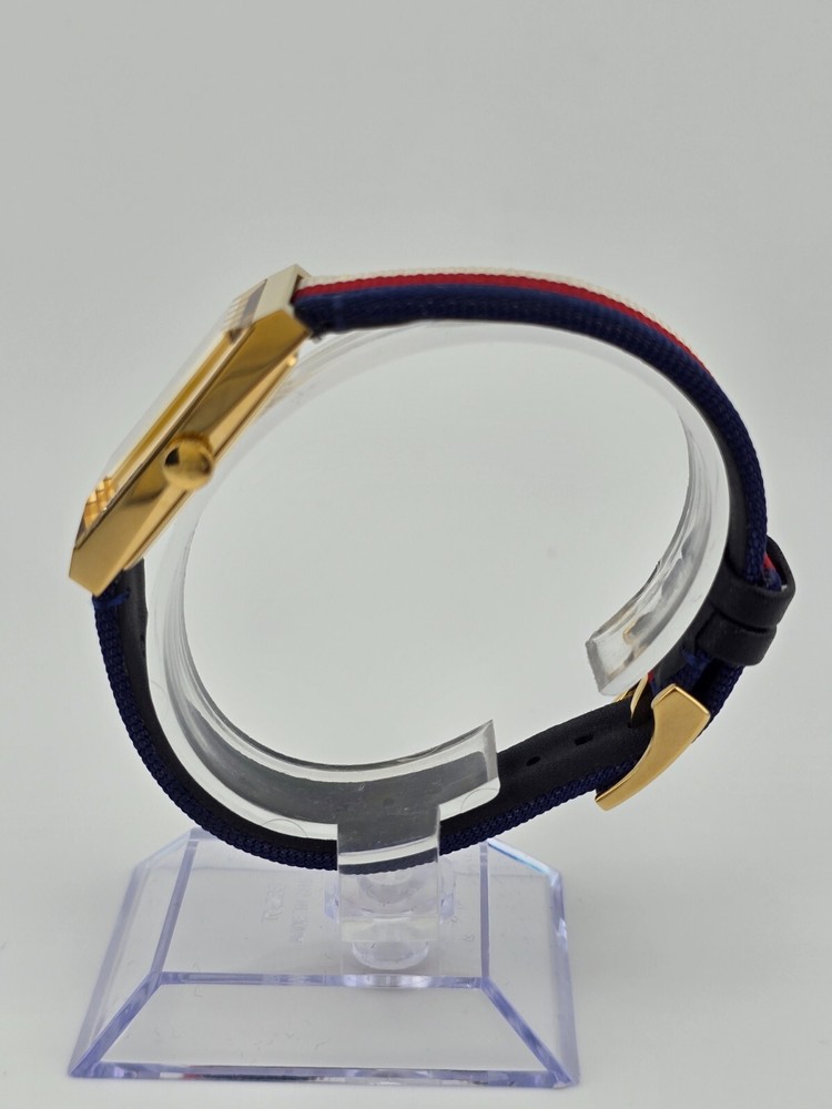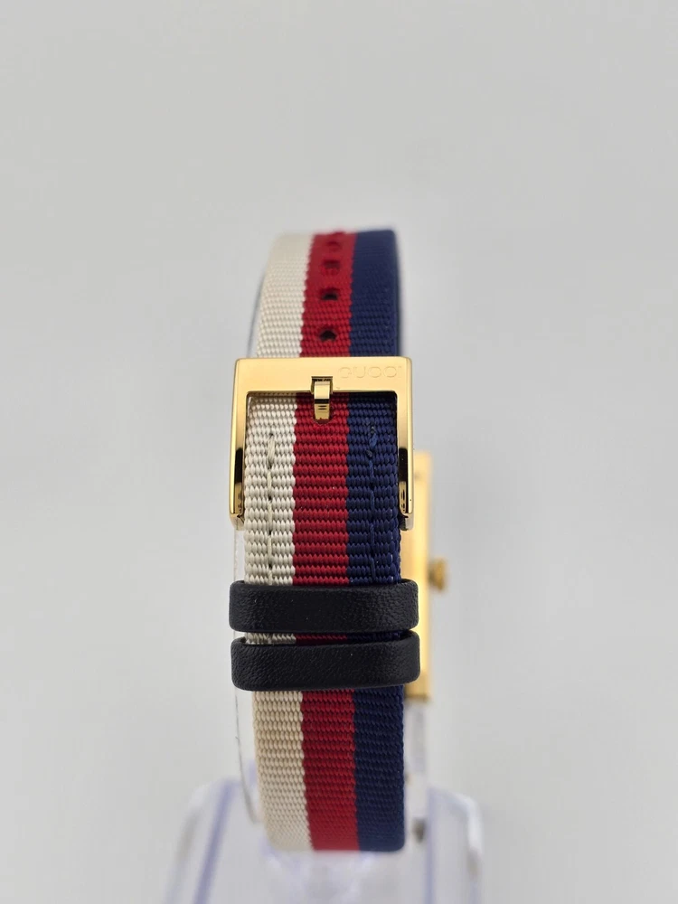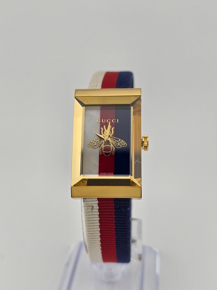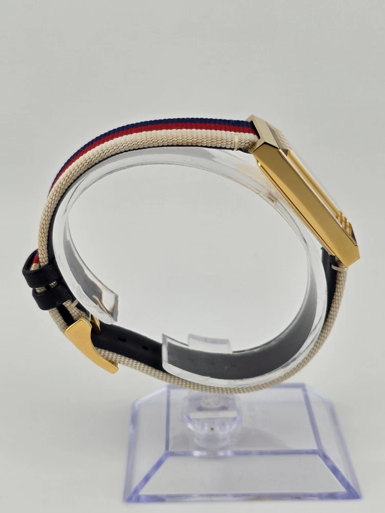 Gucci Women's G-Frame Mother of Pearl Dial Nylon Watch - ($1150 MSRP) With Original Box! This watch is a Shelf Pull from one of the Major Department Stores. Watch has micro scratches on the watch case/band, visible under direct light. Established in 1921 by Guccio Gucci, the Italian fashion brand Gucci not only offers luxury bags, clothes, footwear, accessories, perfume, and beauty products but also provides some of the world’s finest watches. Offering exquisite Italian craftsmanship fused with Swiss technology — from delicate dress watches for women to robust dive watches for men, Gucci earns the trust not only of fashion aficionados but also serious watch enthusiasts. Features Yellow gold PVD stainless steel case with a nylon strap. Fixed bezel. Mother of pearl dial with gold-tone hands. Dial Type: Analog. Quartz movement. Pull / push crown. Solid case back. Rectangle case shape. Case size: 21 mm x 34 mm. Buckle clasp. Water resistant at 50 meters / 165 feet. Functions: hour, minute. Dress watch style. Watch label: Swiss Made. Fast and Free Shipping You're already purchasing the item. Why pay additional for shipping, especially slow shipping? We get your order shipped out within 1-business day and delivered to your doorstep as quickly as possible. Competitive Pricing With our dynamic pricing model, our prices are always competitive. Our prices are some of the lowest that you will find on the internet. Rest assured that you're getting a good deal when purchasing with us. 30-day Money Back Guarantee We are committed to making sure that you leave this transaction satisfied. If you're unhappy with the product for any reason, you may return it back for your money-back or a replacement within 30 days. No questions asked!