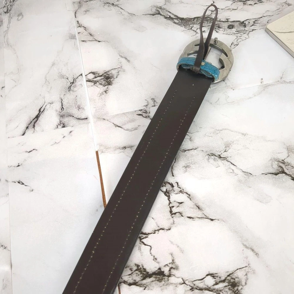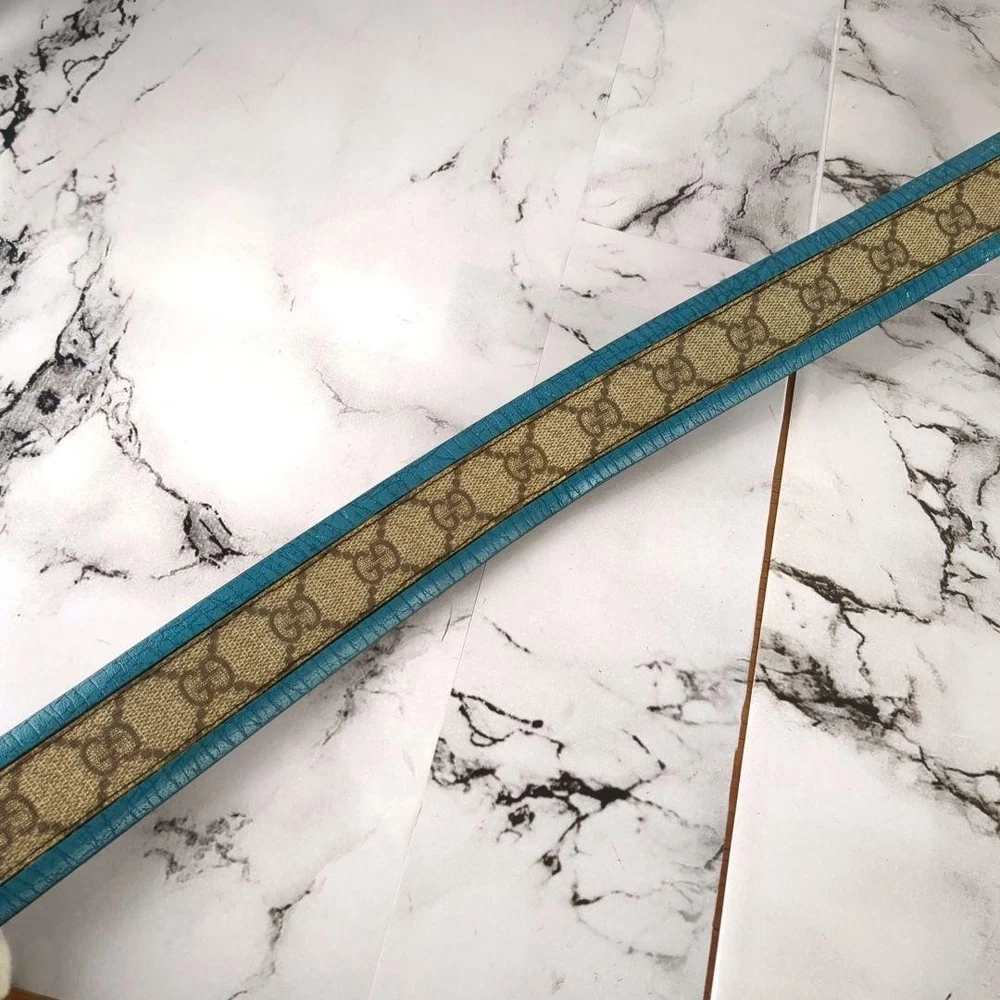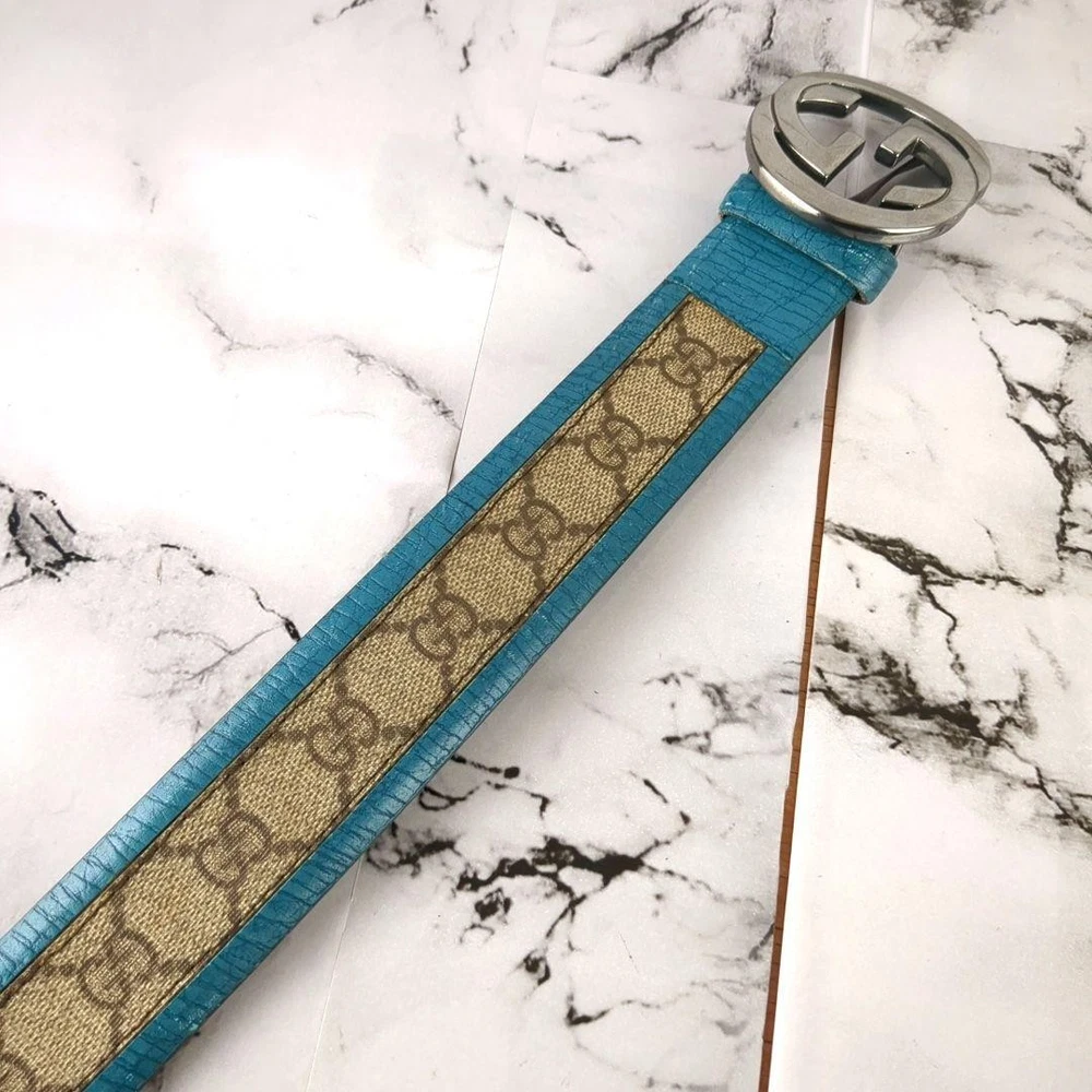 Absolutely love this Gucci belt! The rare turquoise blue color is stunning and makes a bold statement. The interlocking GG pattern is classic yet unique in this shade. The leather and PVC material feels high-quality, and the belt fits perfectly as described. No noticeable wear—looks almost new! Shipping from Japan was smooth and faster than expected. A must-have for any luxury accessory collection!