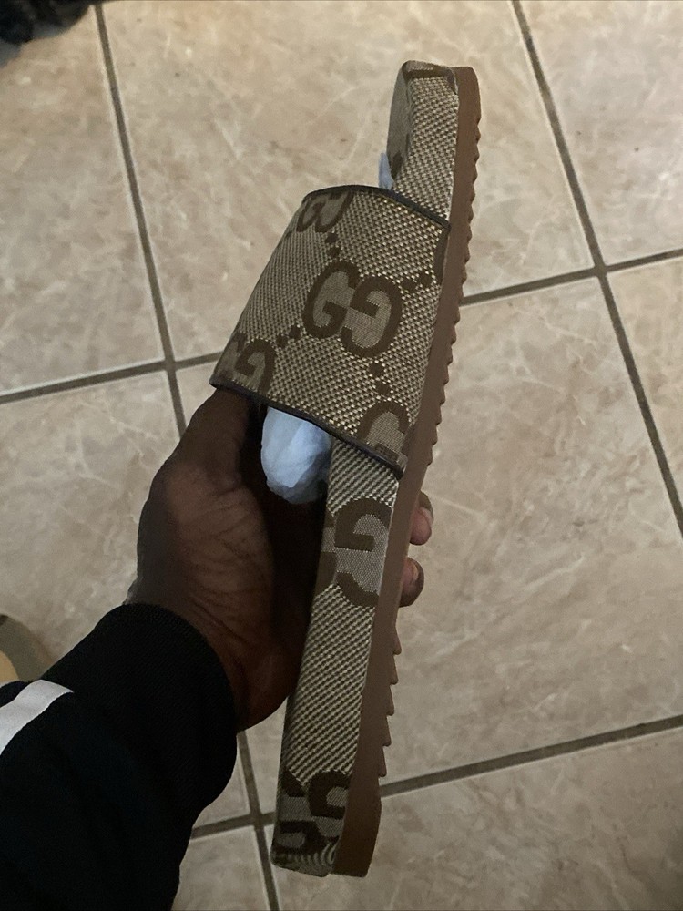 The Gucci GG Canvas Beige Slides Sandals are authentic, brand new, and come with a dust bag. These slip-on sandals feature a designer logo accent, moderate cushioning, rubber outsole, and canvas lining. Made in Italy, these stylish sandals are perfect for casual occasions in the summer or spring seasons. With a classic monogram pattern and a focus on luxury and fashion, these Gucci slides are a must-have for any designer shoe collection.