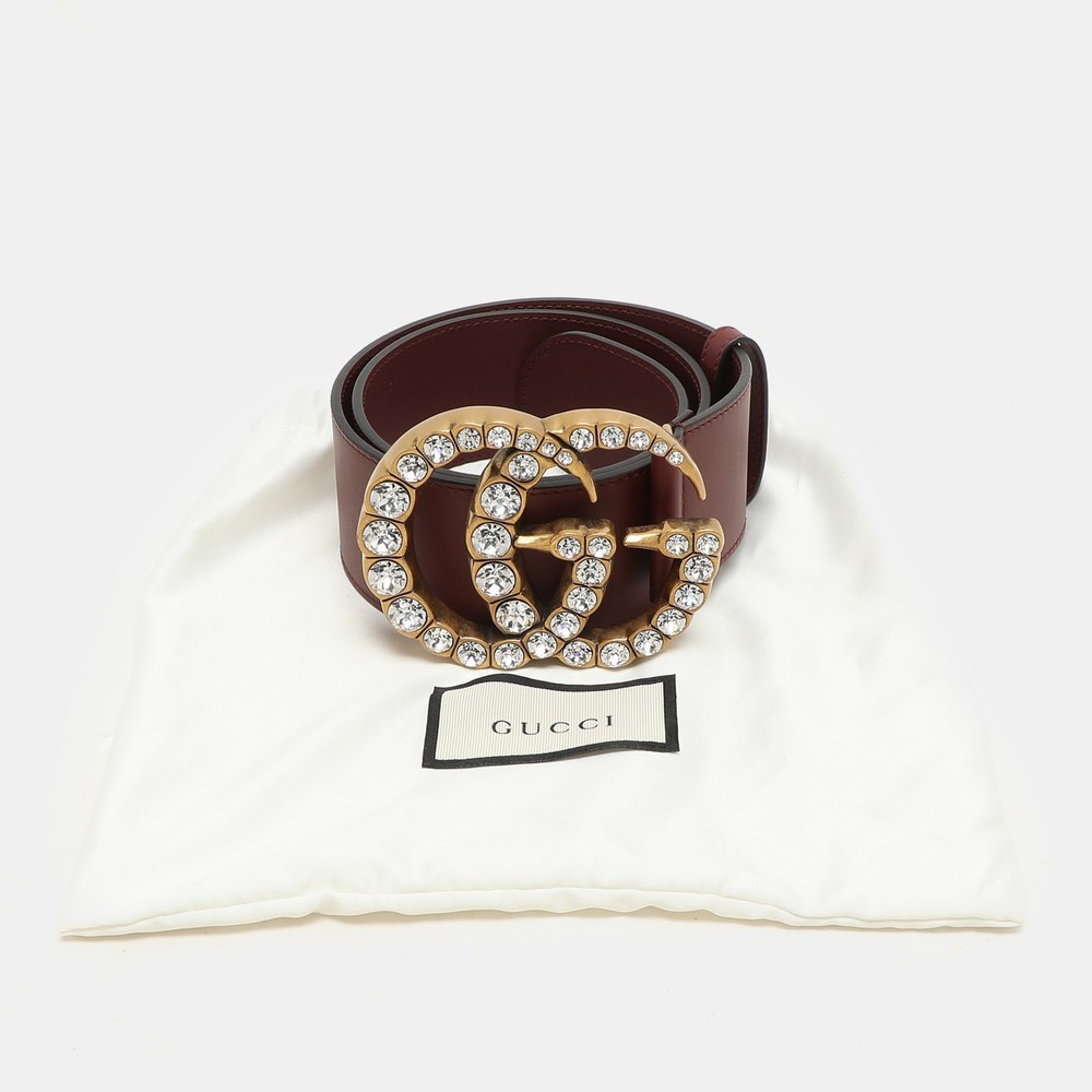 This wide Gucci belt in burgundy leather is punctuated with a crystal embellished GG buckle, delivering bold glamour in a rich hue. Let it anchor flowing maxi dresses or bring luxe detail to tonal separates.Certified by The Luxury Closet - This item has gone through a detailed authentication process overseen by our experts. We offer a lifetime guarantee of authenticity on all our items. Import duties, taxes and charges are not included in the item price. These charges are the buyers responsibility. Please check with your country’s customs office to determine what these additional cost will be prior to buying. Our eBay Store About Us Contact Us Add to Favorite Sellers Gucci Burgundy Leather GG Crystals Wide Belt 75CM $392.7 This wide Gucci belt in burgundy leather is punctuated with a crystal embellished GG buckle, delivering bold glamour in a rich hue. Let it anchor flowing maxi dresses or bring luxe detail to tonal separates. Product Details Brand Color Burgundy Dimensions Material Leather Size 75CM Outsole Width Outsole Length Heel Height Includes Certified by The Luxury Closet This item has gone through a detailed authentication process overseen by our experts. We offer a lifetime guarantee of authenticity on all our items. How We Check The in-house team of experts at The Luxury Closet is highly trained to verify the authenticity and the condition of the luxury products. They ensure that only 100% authentic items are put on sale.The evaluation process is unique with its own mix of assessment criteria and differs according to the category. Each item is evaluated based on the following combination of hallmarks, hardware, stitching, symmetry, material, craftsmanship, stamping, codes, hologram stickers, and packaging. Our authenticators also check if the items have been modified or amended (e.g., aftermarket diamonds, replaced batteries, repaired bags, etc.) International Buyers Import duties, taxes and charges are not included in the item price. These charges are the buyers responsibility. Please check with your country’s customs office to determine what these additional cost will be prior to buying.