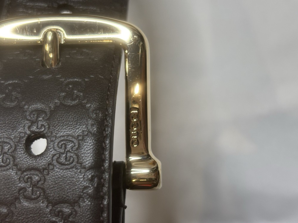 Gucci GG Guccissima Brown Leather Belt SZ 70/28 Authentic Gucci Guccissima Belt in dark brown embossed leather featuring the iconic interlocking GG monogram throughout. Finished with a sleek gold-tone buckle engraved with “Gucci,” this belt is both luxurious and understated. A classic piece made in Italy, perfect for everyday wear or elevating high-waisted looks. • Brand: Gucci • Size: 70/28 (Fits approx. US 24–25” waist) • Color: Dark Brown • Material: Leather • Hardware: Gold-tone • Condition: Very good pre-owned condition with minimal signs of wear. One extra hole has been added. Dust bag included. • Made in: Italy • Retail Price (est.): $395 – $495