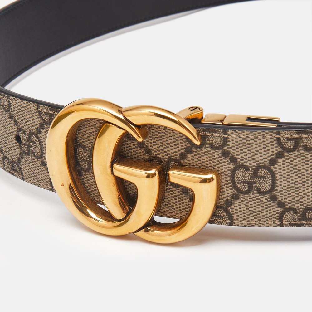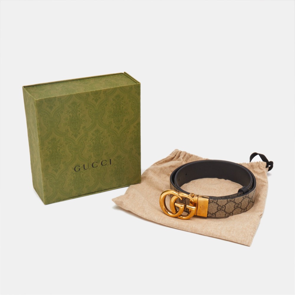 Designed with versatility in mind, this authentic Gucci Marmont belt features GG Supreme canvas on one side and leather on the other, finished with the iconic double G buckle.Certified by The Luxury Closet - This item has gone through a detailed authentication process overseen by our experts. We offer a lifetime guarantee of authenticity on all our items. Import duties, taxes and charges are not included in the item price. These charges are the buyers responsibility. Please check with your country’s customs office to determine what these additional cost will be prior to buying. Our eBay Store About Us Contact Us Add to Favorite Sellers Gucci Beige GG Supreme Canvas and Leather GG Marmont Reversible Belt 85CM $421.3 Designed with versatility in mind, this authentic Gucci Marmont belt features GG Supreme canvas on one side and leather on the other, finished with the iconic double G buckle. Product Details Brand Color Beige Dimensions Material Coated Canvas, Leather Size 85CM Outsole Width Outsole Length Heel Height Includes Certified by The Luxury Closet This item has gone through a detailed authentication process overseen by our experts. We offer a lifetime guarantee of authenticity on all our items. How We Check The in-house team of experts at The Luxury Closet is highly trained to verify the authenticity and the condition of the luxury products. They ensure that only 100% authentic items are put on sale.The evaluation process is unique with its own mix of assessment criteria and differs according to the category. Each item is evaluated based on the following combination of hallmarks, hardware, stitching, symmetry, material, craftsmanship, stamping, codes, hologram stickers, and packaging. Our authenticators also check if the items have been modified or amended (e.g., aftermarket diamonds, replaced batteries, repaired bags, etc.) International Buyers Import duties, taxes and charges are not included in the item price. These charges are the buyers responsibility. Please check with your country’s customs office to determine what these additional cost will be prior to buying.