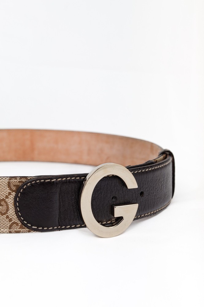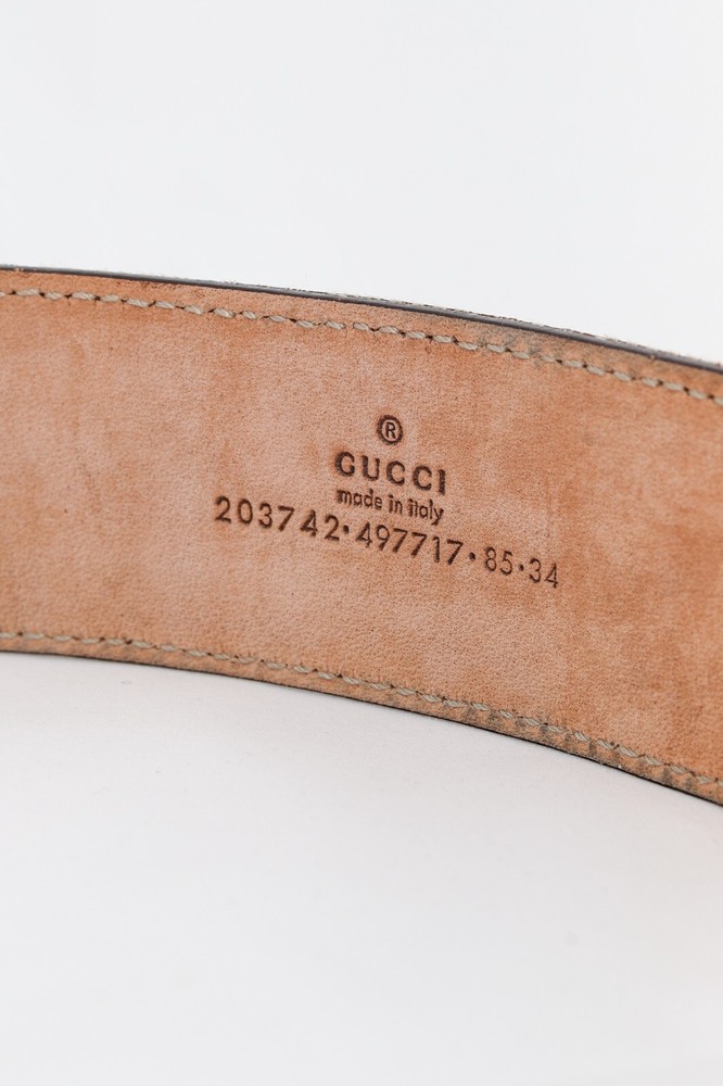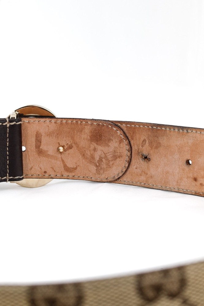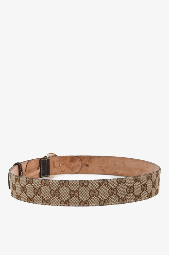 Made in Italy, this belt from Gucci is crafted with the designer's beige monogram canvas, and features dark brown leather trim, and is fixed with a gold-tone "G" motif buckle. Size: 85/34 (M) Condition: Excellent; self-opened hole, some scratching on hardware, some marking on lining, very minimal to no signs of wear on exterior. Approximate measurements: Circumference: 28.5” - 33.75" (72 cm - 86 cm) Width: 1.5" (4 cm) Composition: Canvas, leather, metal hardware.