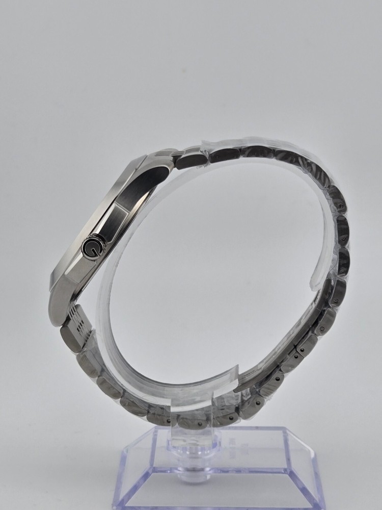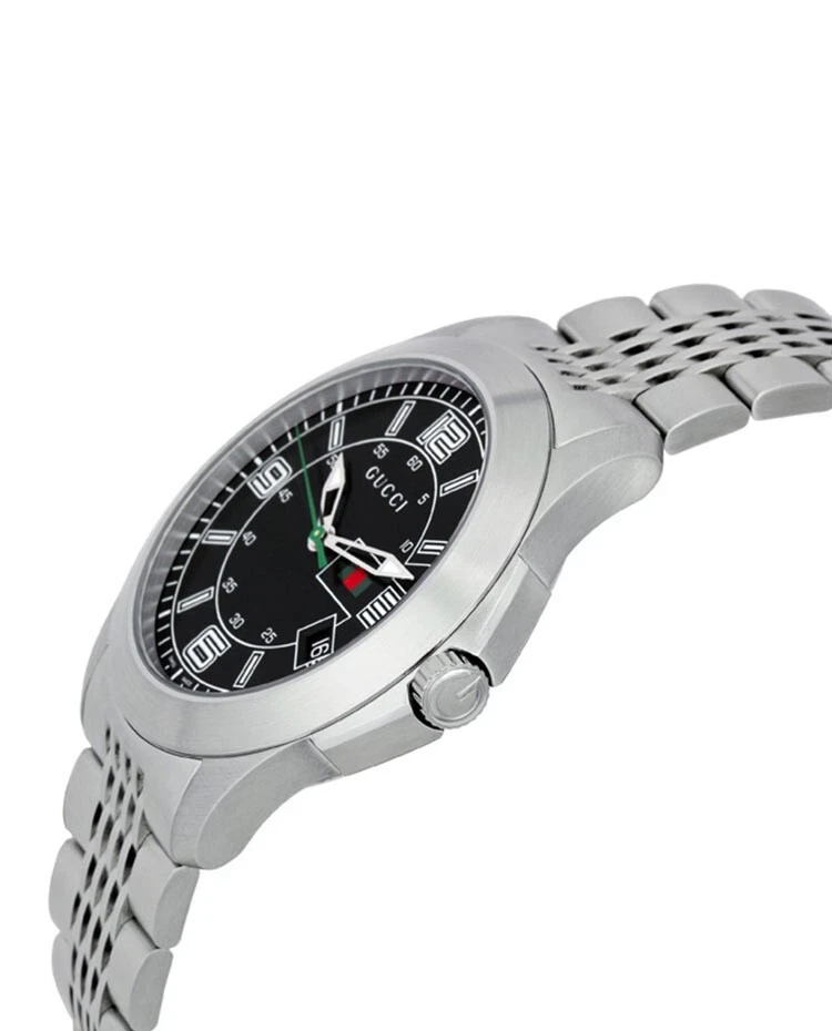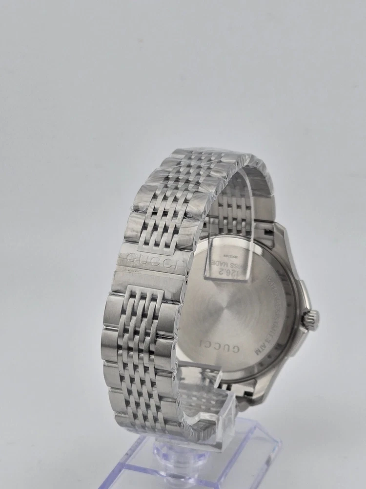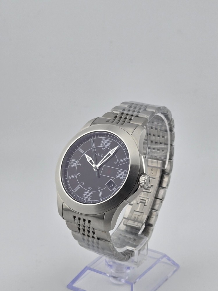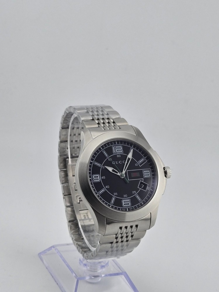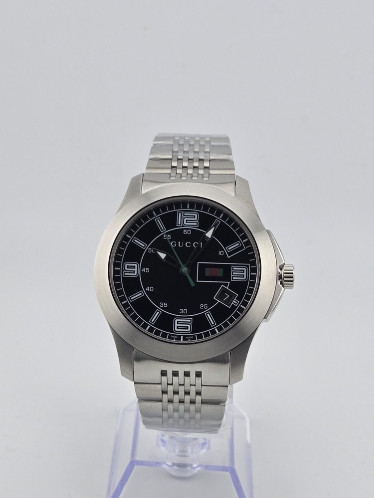Gucci G-Timeless Men's Black Dial Stainless Steel Watch - YA126201 ($825 MSRP) New with Original Box and Tags! This watch is a Shelf Pull from one of the Major Department Stores. May find few micro scratches on the watch case/band, visible under a direct and strong light. The Gucci G-Timeless Men's Black Dial Stainless Steel Watch - YA126201 combines sleek design with practical functionality, making it a versatile accessory for everyday wear. Encased in durable stainless steel, the watch features a matching link bracelet and fixed stainless steel bezel, adding to its contemporary appeal. Its striking black dial is accented with luminous hands and stick hour markers, ensuring visibility even in low-light conditions. Arabic numerals mark the 3, 6, 9, and 12 o'clock positions, adding a touch of sophistication to the overall design. Minute markers encircle the outer rim for enhanced timekeeping precision. With a convenient date display positioned at the 4 o'clock position, this watch offers practical functionality for keeping track of the date alongside the time. Powered by a reliable quartz movement, the watch ensures accurate timekeeping with minimal maintenance required. Protected by scratch-resistant synthetic sapphire crystal, the dial remains shielded from everyday wear and tear, maintaining its pristine appearance for years to come. With a case diameter of 44.5 mm and a thickness of 9.3 mm, the watch strikes the perfect balance between style and comfort. The 23 mm band width complements the case size, while the hidden deployment clasp provides a secure and seamless closure. Water-resistant up to 30 meters (100 feet), this watch is suitable for everyday wear and can withstand splashes and brief immersion in water, but it is not suitable for swimming or showering. With its timeless design and reliable performance, the Gucci G-Timeless Men's Black Dial Stainless Steel Watch - YA126201 is an ideal choice for the modern man looking to make a statement with his accessories. Features Stainless steel case with a stainless steel link bracelet. Fixed stainless steel bezel. Black dial with luminous hands and stick hour markers. Arabic numerals mark the 3, 6, 9 and 12 o'clock positions. Minute markers around the outer rim. Dial Type: analog. Luminescent hands and markers. Date displays at the 4 o'clock position. Quartz movement. Scratch resistant synthetic sapphire crystal. Solid case back. Case diameter: 44.5 mm. Case thickness: 9.3 mm. Band width: 23 mm. Hidden deployment clasp. Water resistant at 30 meters/ 100 feet. Functions: hours, minutes, seconds, date Fast and Free Shipping You're already purchasing the item. Why pay additional for shipping, especially slow shipping? We get your order shipped out within 1-business day and delivered to your doorstep as quickly as possible. Competitive Pricing With our dynamic pricing model, our prices are always competitive. Our prices are some of the lowest that you will find on the internet. Rest assured that you're getting a good deal when purchasing with us. 30-day Money Back Guarantee We are committed to making sure that you leave this transaction satisfied. If you're unhappy with the product for any reason, you may return it back for your money-back or a replacement within 30 days. No questions asked!