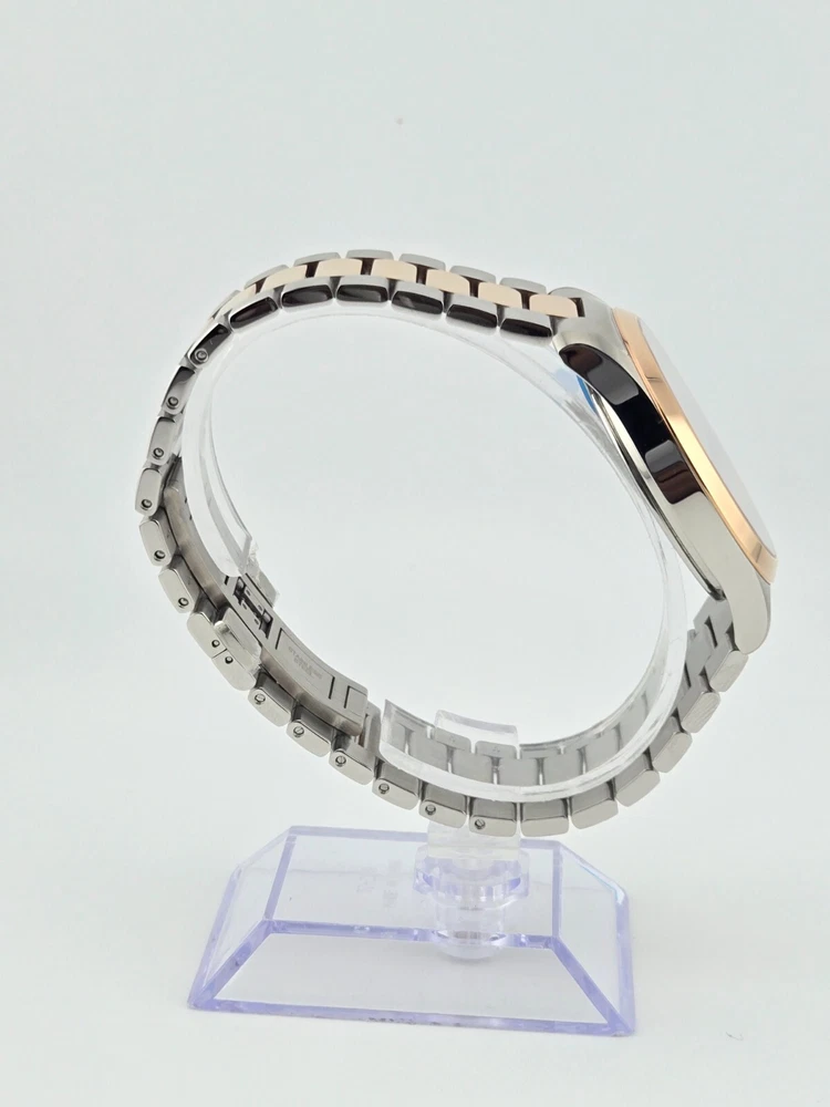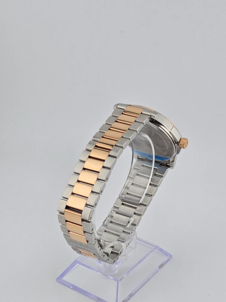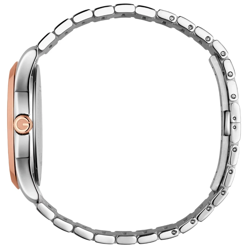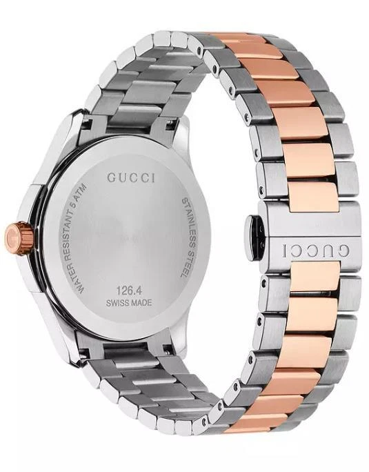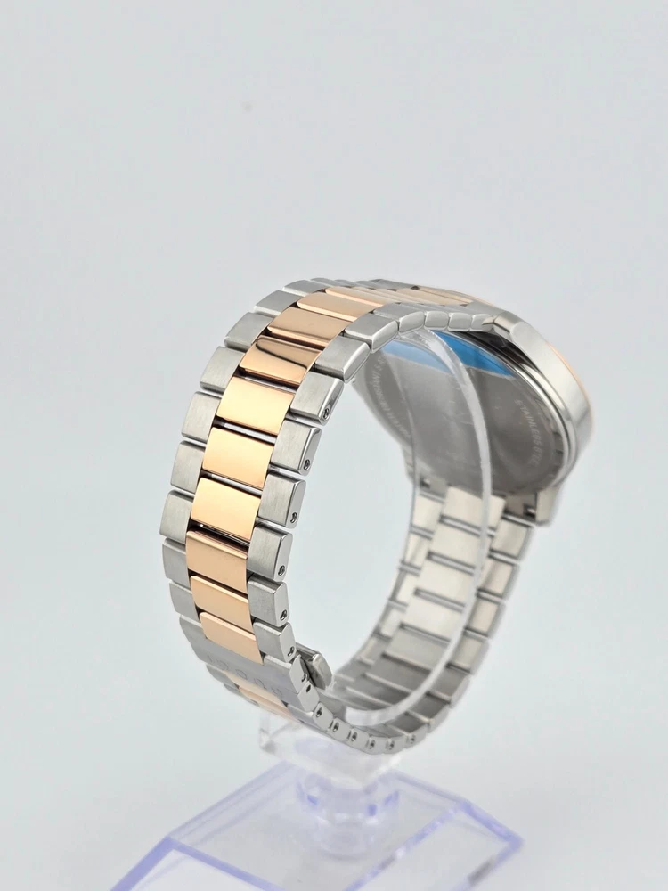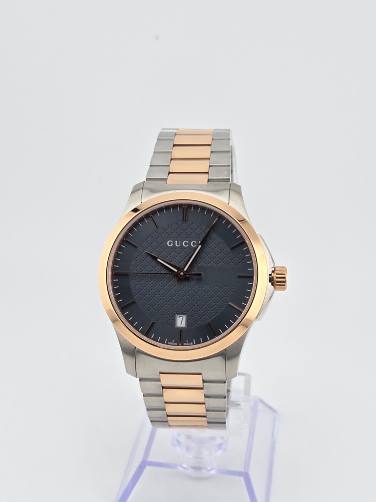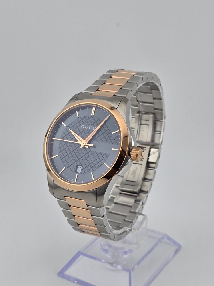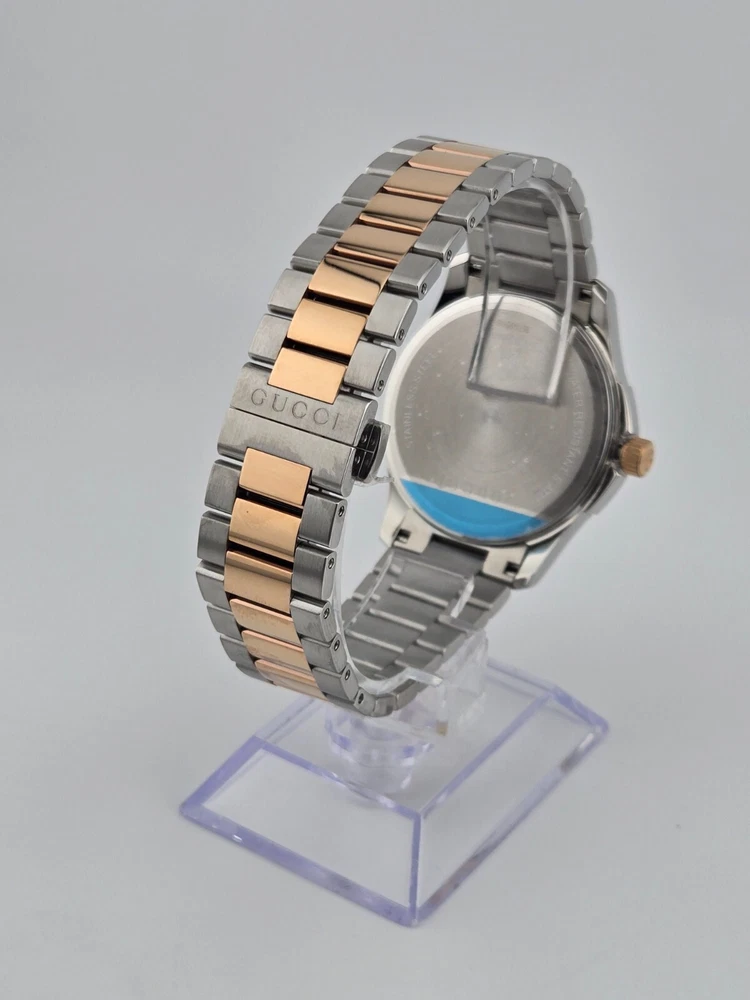 $1170 MSRP | Gucci Men's G-Timeless Two-Tone Grey Dial Watch - YA126446 The Gucci Men’s G-Timeless Grey Dial Two-Tone Watch (YA126446) offers a sophisticated and elegant look that effortlessly combines luxury and functionality. Featuring a stainless steel case with a striking two-tone design—silver and rose gold PVD—this watch exudes modern style. The fixed rose gold PVD bezel further enhances the watch's refined aesthetic, while the slim 7mm case thickness adds to its sleek profile. With a 38mm round case, it’s the perfect size for a classic and timeless appearance. The grey dial of this timepiece is complemented by luminous rose gold-tone hands and index hour markers, ensuring readability in any light. Minute markers around the outer rim add extra precision to the design. A date display is positioned just above the 6 o'clock mark, making it both practical and stylish. Powered by reliable quartz movement, this watch provides accurate timekeeping with the functions of hour, minute, second, and date. Built to last, the Gucci G-Timeless Watch features a scratch-resistant sapphire crystal, offering durability and long-lasting clarity. The watch is equipped with a pull/push crown for ease of use and a solid case back for enhanced durability. With water resistance up to 50 meters (165 feet), this timepiece is versatile enough for everyday wear. The 20mm band width and deployment clasp ensure a secure and comfortable fit. Whether for casual or formal occasions, this watch brings a refined touch to any outfit. Features Stainless steel case with a two-tone (silver and rose gold PVD) bracelet. Fixed rose gold PVD bezel. Grey dial with luminous rose gold-tone hands and index hour markers. Minute markers around the outer rim. Dial Type: Analog. Date display above the 6 o'clock position. Quartz movement. Scratch resistant sapphire crystal. Pull / push crown. Solid case back. Case size: 38 mm. Case thickness: 7 mm. Round case shape. Band width: 20 mm. Deployment clasp. Water resistant at 50 meters / 165 feet. Functions: date, hour, minute, second Fast and Free Shipping You're already purchasing the item. Why pay additional for shipping, especially slow shipping? We get your order shipped out within 1-business day and delivered to your doorstep as quickly as possible. Competitive Pricing With our dynamic pricing model, our prices are always competitive. Our prices are some of the lowest that you will find on the internet. Rest assured that you're getting a good deal when purchasing with us. 30-day Money Back Guarantee We are committed to making sure that you leave this transaction satisfied. If you're unhappy with the product for any reason, you may return it back for your money-back or a replacement within 30 days. No questions asked!