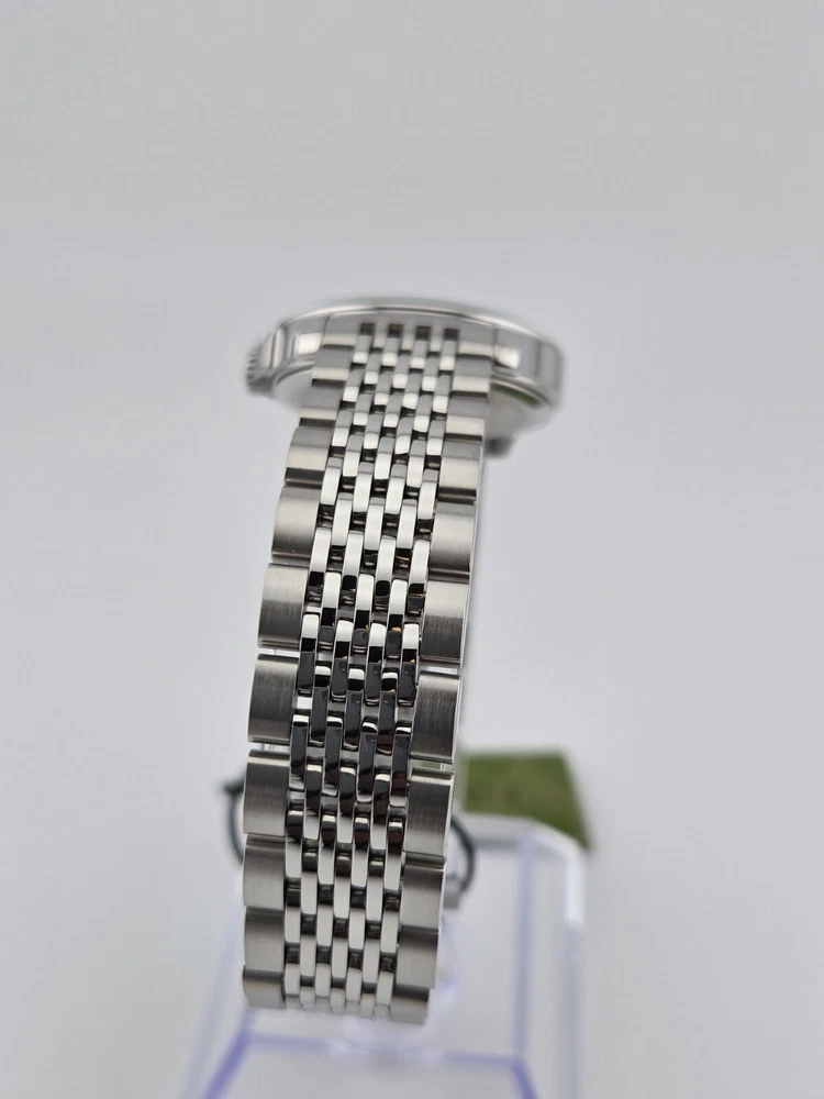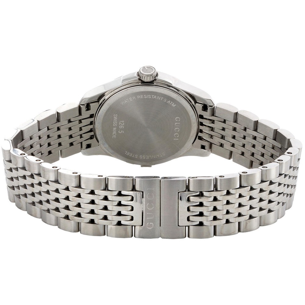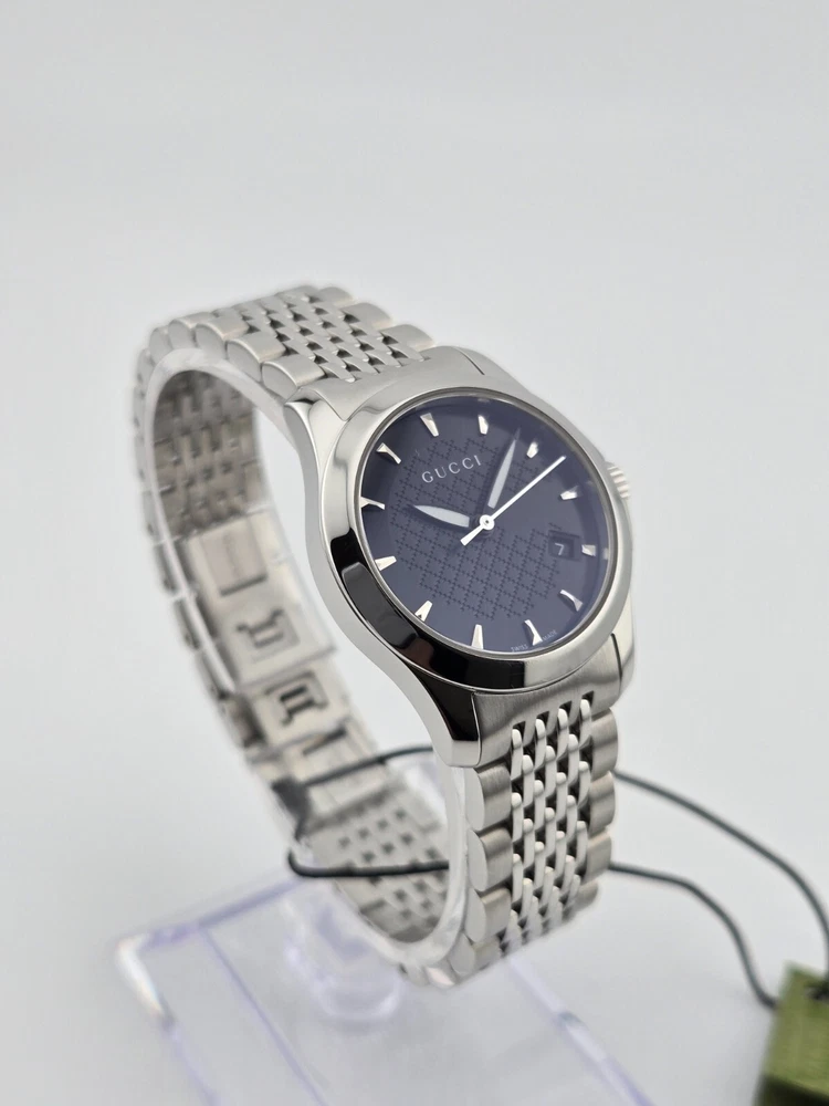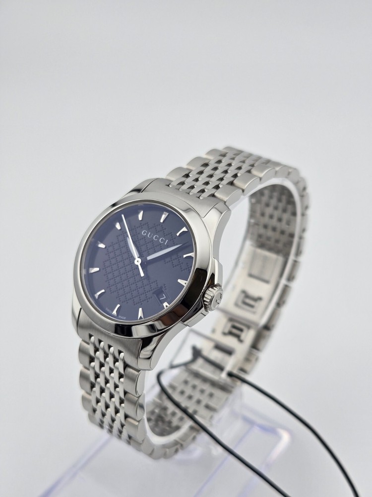 Gucci Women’s G-Timeless Stainless Steel Black Dial Watch – YA126502 ($790 MSRP) With Original Box and Tags! This watch is a Shelf Pull from one of the Major Department Stores. Watch has micro scratches on the watch case/band, visible under direct light. The Gucci Women’s G-Timeless Stainless Steel Black Dial Watch – YA126502 embodies the essence of luxury and sophistication. It features a sleek stainless steel case complemented by a matching stainless steel link bracelet, offering both durability and elegance. The fixed stainless steel bezel frames a distinctive black diamond-pattern dial with the iconic Gucci 'G', adorned with luminous silver-tone hands and index hour markers, ensuring both style and readability. Minute markers around the outer rim add to the precise timekeeping of this exquisite timepiece. This analog watch is powered by a reliable quartz movement, providing accurate timekeeping. A scratch-resistant sapphire crystal protects the dial, maintaining its pristine appearance over time. The date display is discreetly positioned at the 4 o'clock mark, adding a practical function without compromising the watch's aesthetic. The textured steel crown and stainless steel case back complete the sophisticated design. With a case diameter of 27 mm and a case thickness of 7 mm, it is a perfect size for a woman's wrist, offering a refined yet substantial presence. Designed for both style and functionality, the watch features a hidden deployment clasp that ensures a secure and comfortable fit. Water-resistant up to 30 meters (100 feet), this timepiece can withstand everyday splashes and brief immersion in water. The Gucci Women’s G-Timeless Stainless Steel Black Dial Watch is a luxury dress watch that seamlessly combines timeless elegance with modern design elements, making it a perfect accessory for any occasion. Features Stainless steel case with a stainless steel link bracelet. Fixed stainless steel bezel. Black diamond-pattern with black Gucci 'G' dial with luminous silver-tone hands and index hour markers. Minute markers around the outer rim. Dial Type: analog. Date display at the 4 o'clock position. Quartz movement. Scratch resistant sapphire crystal. Textured steel crown. S tainless steel case back. Case diameter: 27 mm. Case thickness: 7 mm. Band width: 14 mm. Hidden deployment clasp. Water resistant at 30 meters / 100 feet. Functions: hours, minutes, seconds, date. Fast and Free Shipping You're already purchasing the item. Why pay additional for shipping, especially slow shipping? We get your order shipped out within 1-business day and delivered to your doorstep as quickly as possible. Competitive Pricing With our dynamic pricing model, our prices are always competitive. Our prices are some of the lowest that you will find on the internet. Rest assured that you're getting a good deal when purchasing with us. 30-day Money Back Guarantee We are committed to making sure that you leave this transaction satisfied. If you're unhappy with the product for any reason, you may return it back for your money-back or a replacement within 30 days. No questions asked!