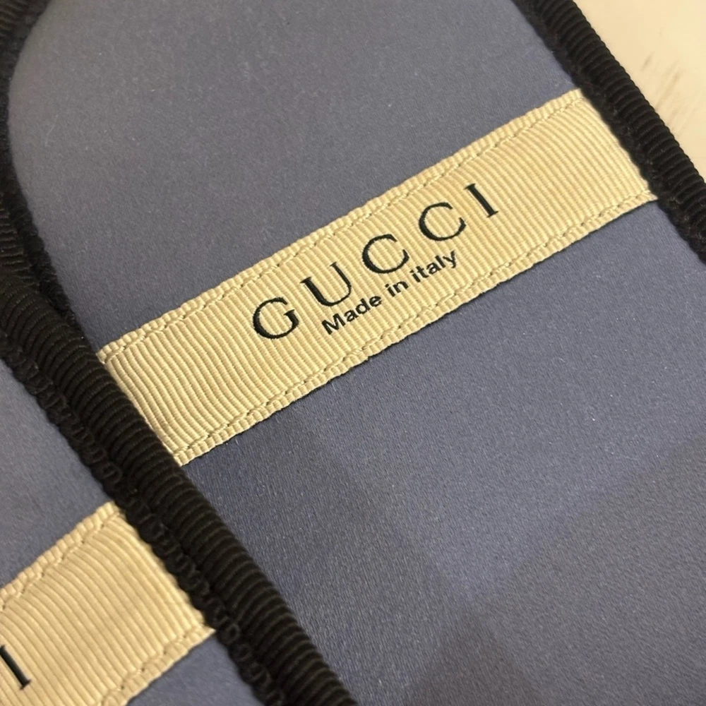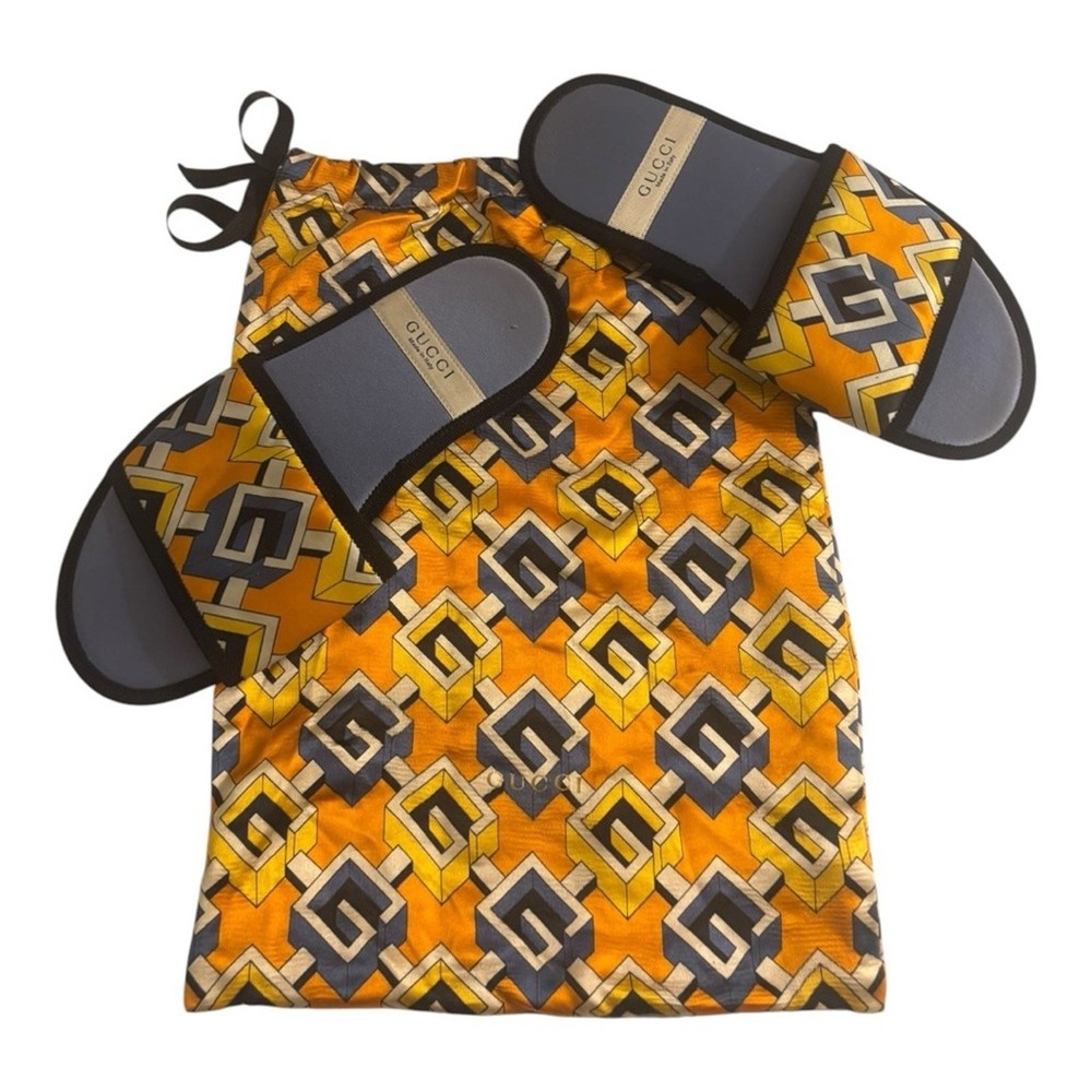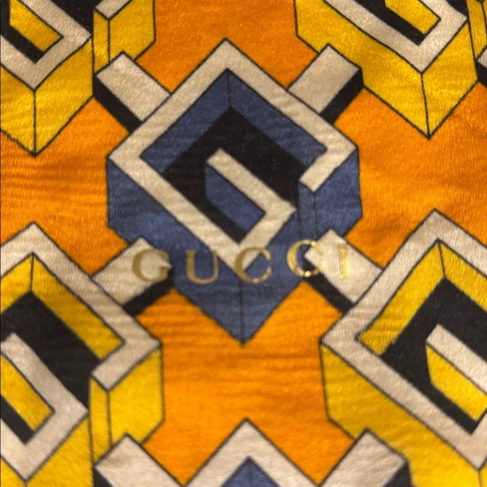 Elegant Designer Lightweight Luxurious Gucci Geometric G Print Satin Silk Blend Slippers and dust bag. These luxury house slippers feature a vibrant orange, yellow, and blue silk-satin blend with a repeating geometric "G" pattern. Material: Silk-satin blend with grosgrain ribbon trim and soft cloth soles for indoor use Design: A bold, multi-colored geometric interpretation of the classic Gucci "G" logo. Full Travel Set: The slippers come with a matching drawstring dust bag. The slippers are a size small and probably correspond to a women size 6-7. Please see pictures for measurements!!