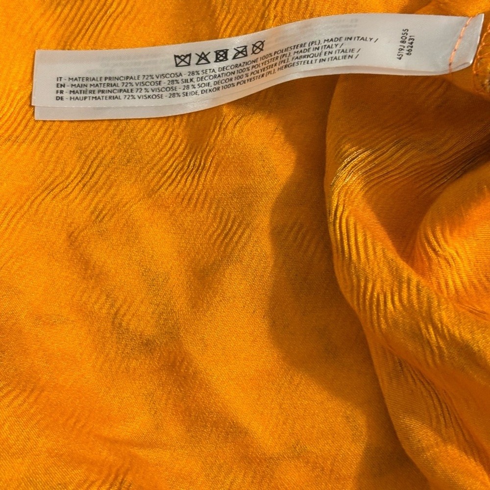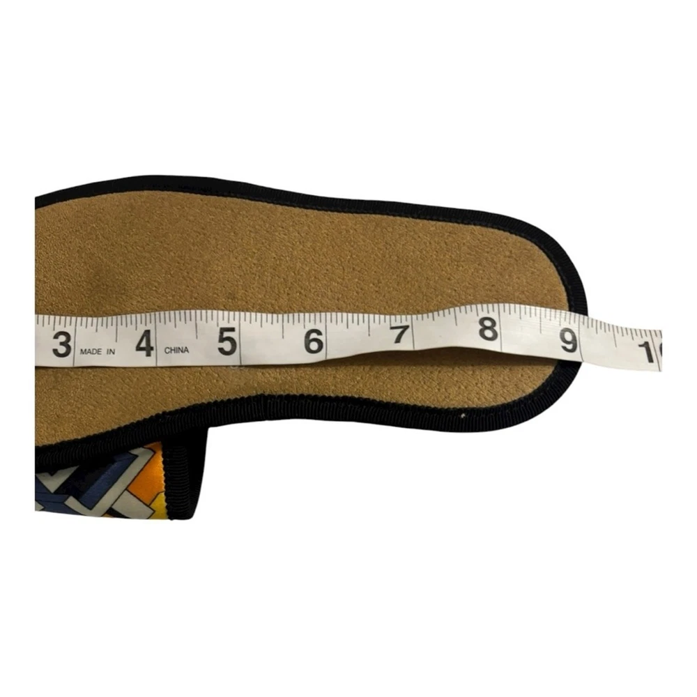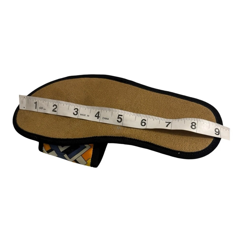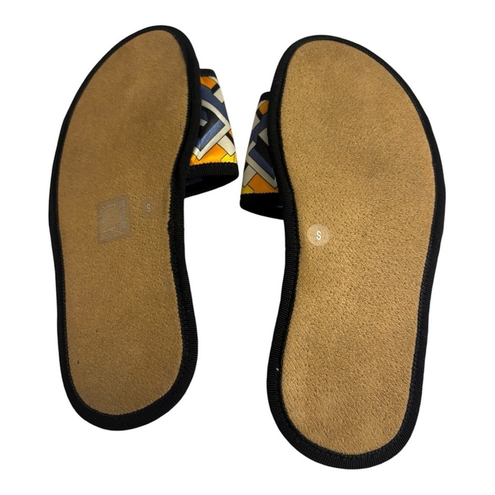 Elegant Designer Lightweight Luxurious Gucci Geometric G Print Satin Silk Blend Slippers and dust bag. These luxury house slippers feature a vibrant orange, yellow, and blue silk-satin blend with a repeating geometric "G" pattern. Material: Silk-satin blend with grosgrain ribbon trim and soft cloth soles for indoor use Design: A bold, multi-colored geometric interpretation of the classic Gucci "G" logo. Full Travel Set: The slippers come with a matching drawstring dust bag. The slippers are a size small and probably correspond to a women size 6-7. Please see pictures for measurements!!