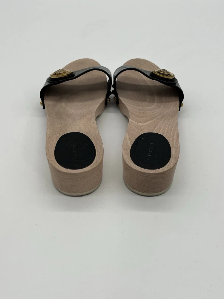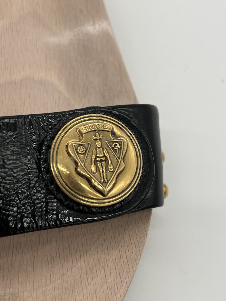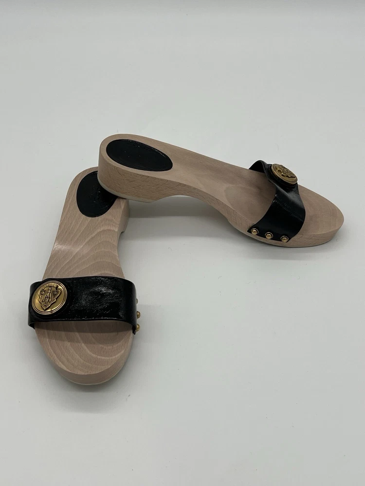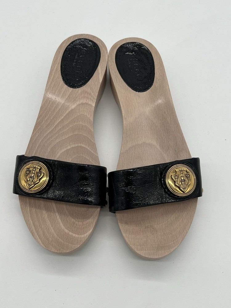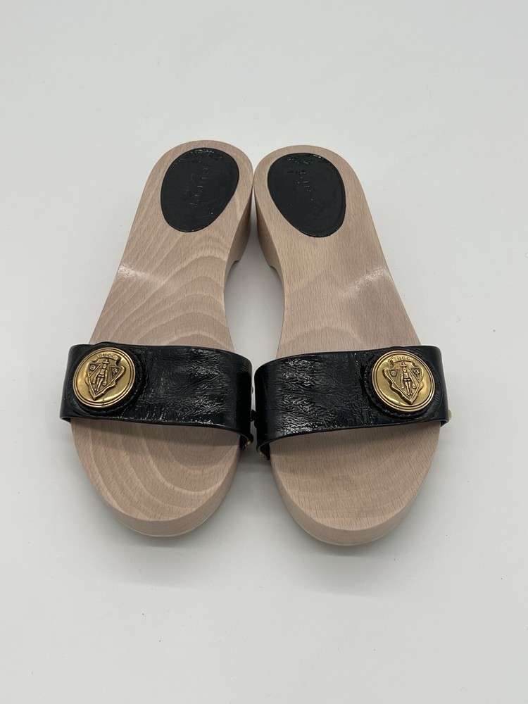Gucci Hysteria Women Sz 8B Black Patent Leather Slide Wood Soles Fashion Sandals. Shoes are in used condition and have signs of wear but shoes are still in excellent condition. Upper leather is in excellent condition and very clean , inside is clean and the soles are in great condition. Nice comfortable shoes for casual wear. Condition is pre-owned. Shipped with usps priority mail. Sold as pictures. Thank you! Feel free to message me for any questions. Thank you