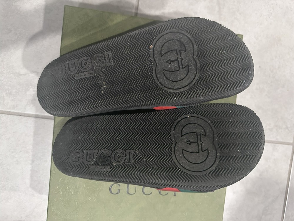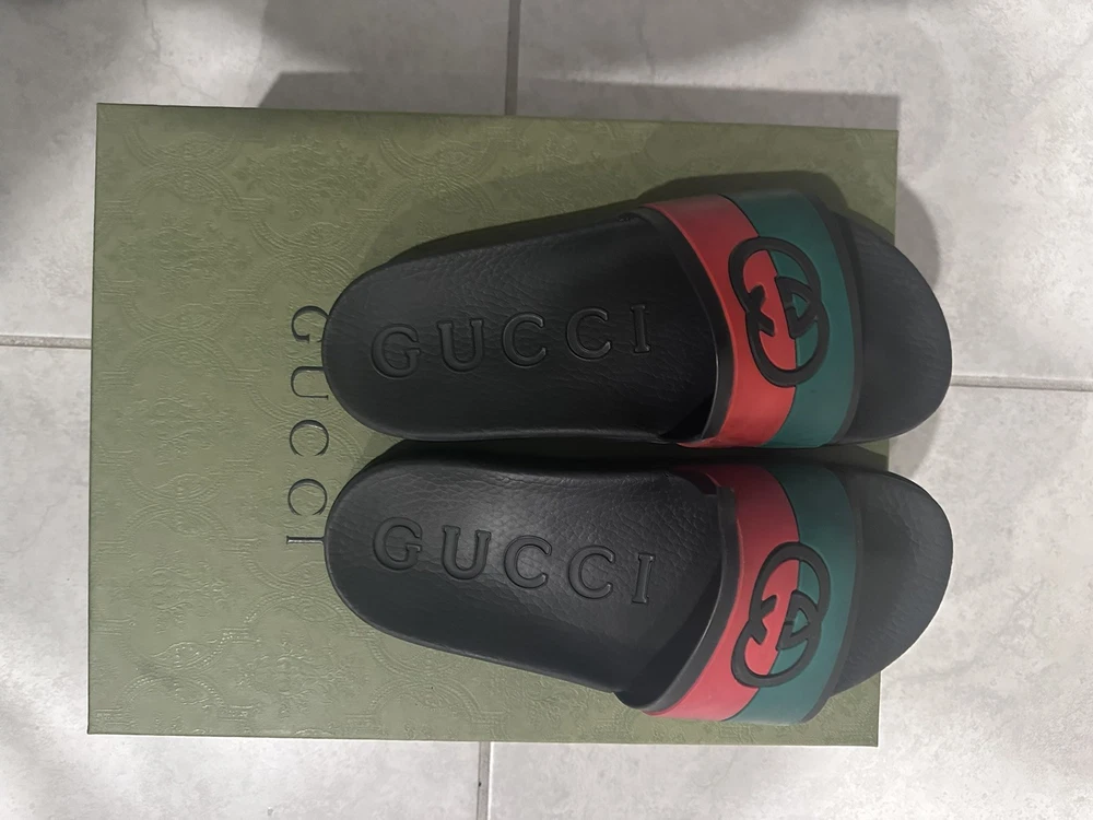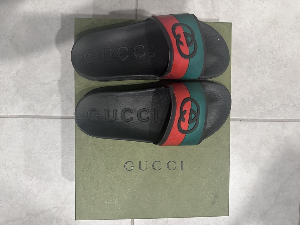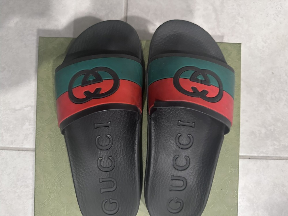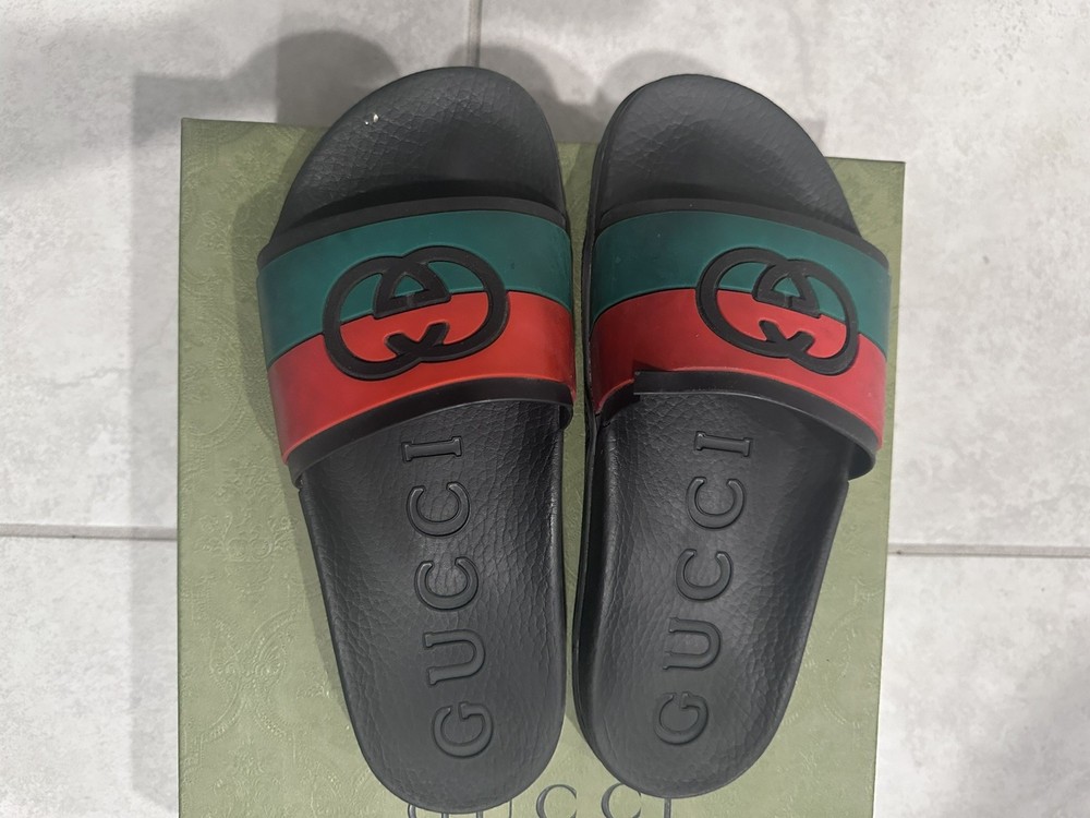 The Gucci Interlocking G Black/Red/Green Rubber Slides in men's size 8 are a stylish and comfortable option for casual wear. Made in Italy, these sandals feature a slip-on design with a durable rubber outsole and insole. The signature GG logo accents add a touch of luxury to the black, red, and green color scheme, making them perfect for travel, activewear, and everyday use. With a lightweight feel and standard shoe width, these designer slides are a versatile and trendy addition to any summer, fall, or spring wardrobe.