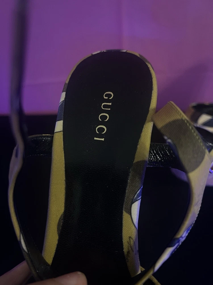 The shoes are pre-owned and have wearing on the rubber outer soles. The inner soles are in good condition, and the Gucci logo can be seen in full view.