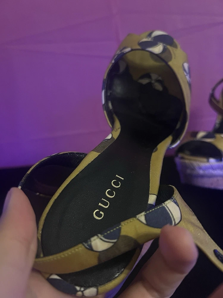 Model: Gucci Espadrille Type: Heel Season: Summer Features: Ankle Strap Lining Material: Leather Outsole Material: Leather Closure: Buckle Heel Height: Low (1-1.9 in) Personalize: No UK Shoe Size: 7 Product Line: Gucci US Shoe Size: 9 Shoe Width: Standard Character: none Theme: Logo AU Shoe Size: 9 Upper Material: Leather Accents: Logo Brand: Gucci Color: Yellow EU Shoe Size: 39 Insole Material: Leather Customized: No Style: Espadrille Occasion: Casual, Travel Country/Region of Manufacture: Spain Vintage: No Pattern: Colorblock Heel Style: Wedge Department: Women