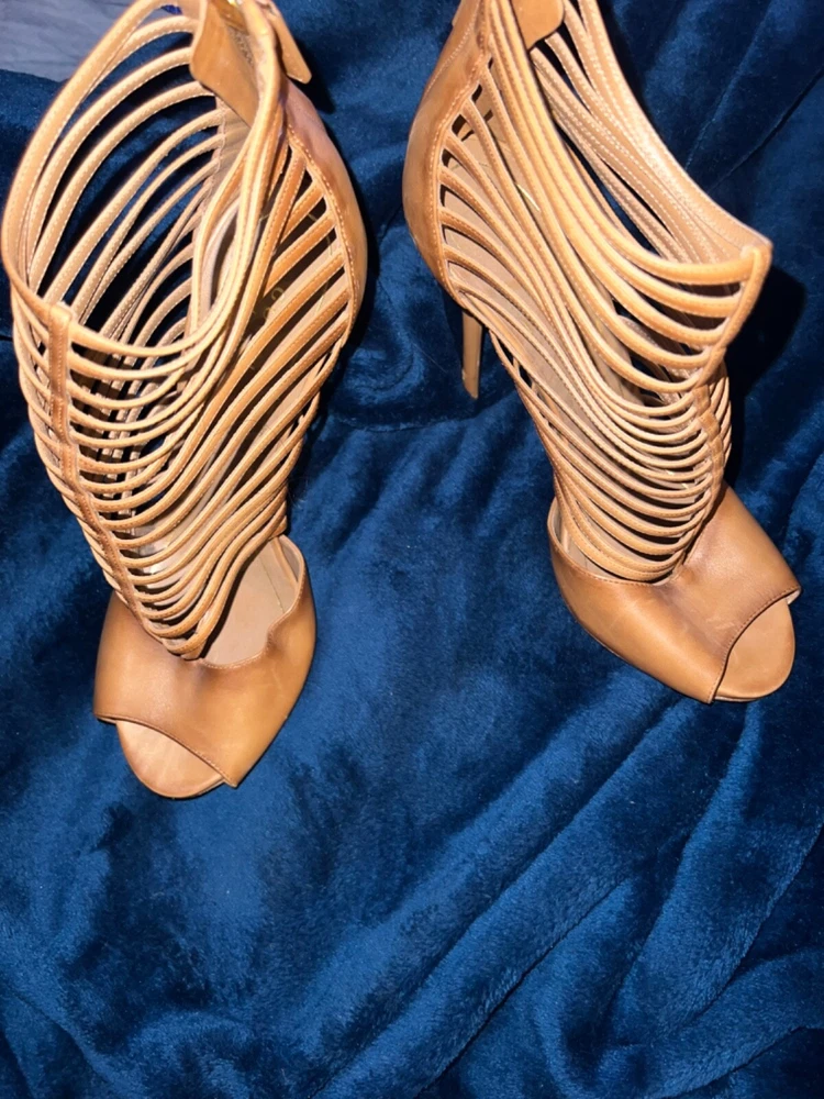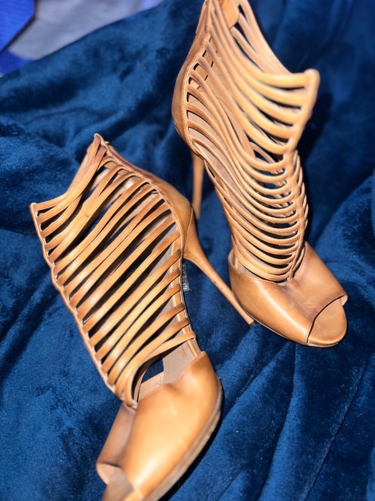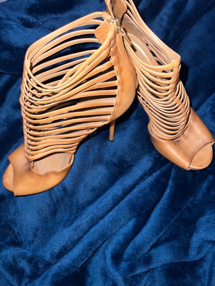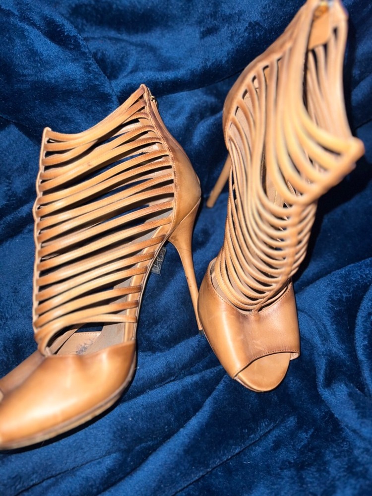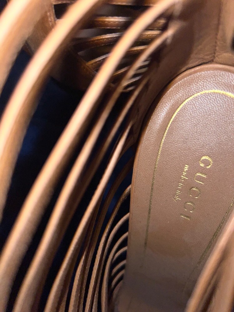 Gucci high heels in beautiful caramel leather. Made in Italy, these strappy heels with zipper on back gently used strappy shoe with peep toe size 10 3.5 inch heel these are preloved and have some wear marks on back