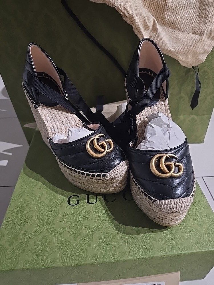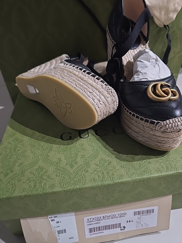 Gucci Marmont Espadrille Wedge Sandal EU36.5/6 Black Leather Ankle Wrap 533023. Condition is New with box. Shipped with USPS Priority Mail.