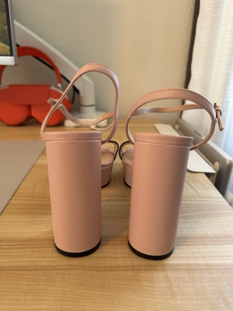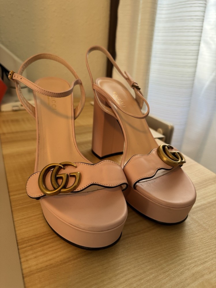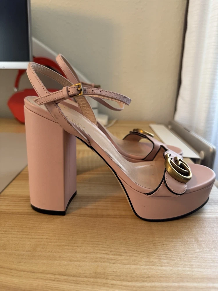 Elevate your fashion game with these stunning Gucci Marmont Platform Heel Sandals. Crafted from high-quality leather and featuring an eye-catching pink color, these sandals are the perfect addition to any stylish woman's shoe collection. The hook and loop closure ensures a comfortable and secure fit, while the wedge heel style provides a comfortable and stylish lift. These sandals are a size 7.5 US and 37.5 EU, making them a great fit for most women. They are part of the popular Gucci Marmont product line and are perfect for any occasion, from a casual day out to a formal event. Add these gorgeous platform heels to your collection today and step out in style. In like-new condition. Does not come with box.
