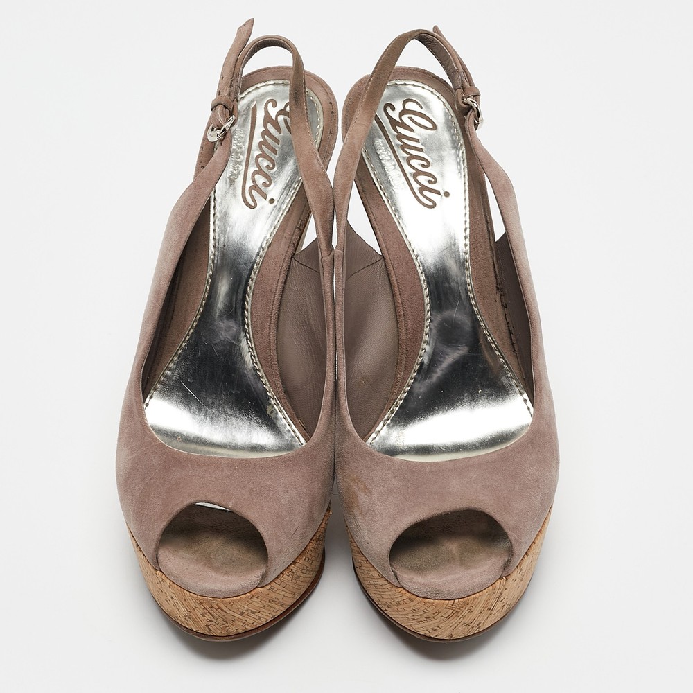 Effortlessly chic, these Gucci mauve sandals feature a cork wedge that adds height and comfort. Their soft suede straps exude understated elegance, making them a versatile addition to your summer wardrobe. Perfect for casual outings or elevating a breezy sundress.Certified by The Luxury Closet - This item has gone through a detailed authentication process overseen by our experts. We offer a lifetime guarantee of authenticity on all our items. Import duties, taxes and charges are not included in the item price. These charges are the buyers responsibility. Please check with your country’s customs office to determine what these additional cost will be prior to buying. Our eBay Store About Us Contact Us Add to Favorite Sellers Gucci Mauve Suede Cork Wedge Sandals Size 38 $163.9 Effortlessly chic, these Gucci mauve sandals feature a cork wedge that adds height and comfort. Their soft suede straps exude understated elegance, making them a versatile addition to your summer wardrobe. Perfect for casual outings or elevating a breezy sundress. Product Details Brand Color Purple Dimensions Material Suede Size 38 Outsole Width 8 cm Outsole Length 22.5 cm Heel Height 14 cm Includes Original Box Certified by The Luxury Closet This item has gone through a detailed authentication process overseen by our experts. We offer a lifetime guarantee of authenticity on all our items. How We Check The in-house team of experts at The Luxury Closet is highly trained to verify the authenticity and the condition of the luxury products. They ensure that only 100% authentic items are put on sale.The evaluation process is unique with its own mix of assessment criteria and differs according to the category. Each item is evaluated based on the following combination of hallmarks, hardware, stitching, symmetry, material, craftsmanship, stamping, codes, hologram stickers, and packaging. Our authenticators also check if the items have been modified or amended (e.g., aftermarket diamonds, replaced batteries, repaired bags, etc.) International Buyers Import duties, taxes and charges are not included in the item price. These charges are the buyers responsibility. Please check with your country’s customs office to determine what these additional cost will be prior to buying.
