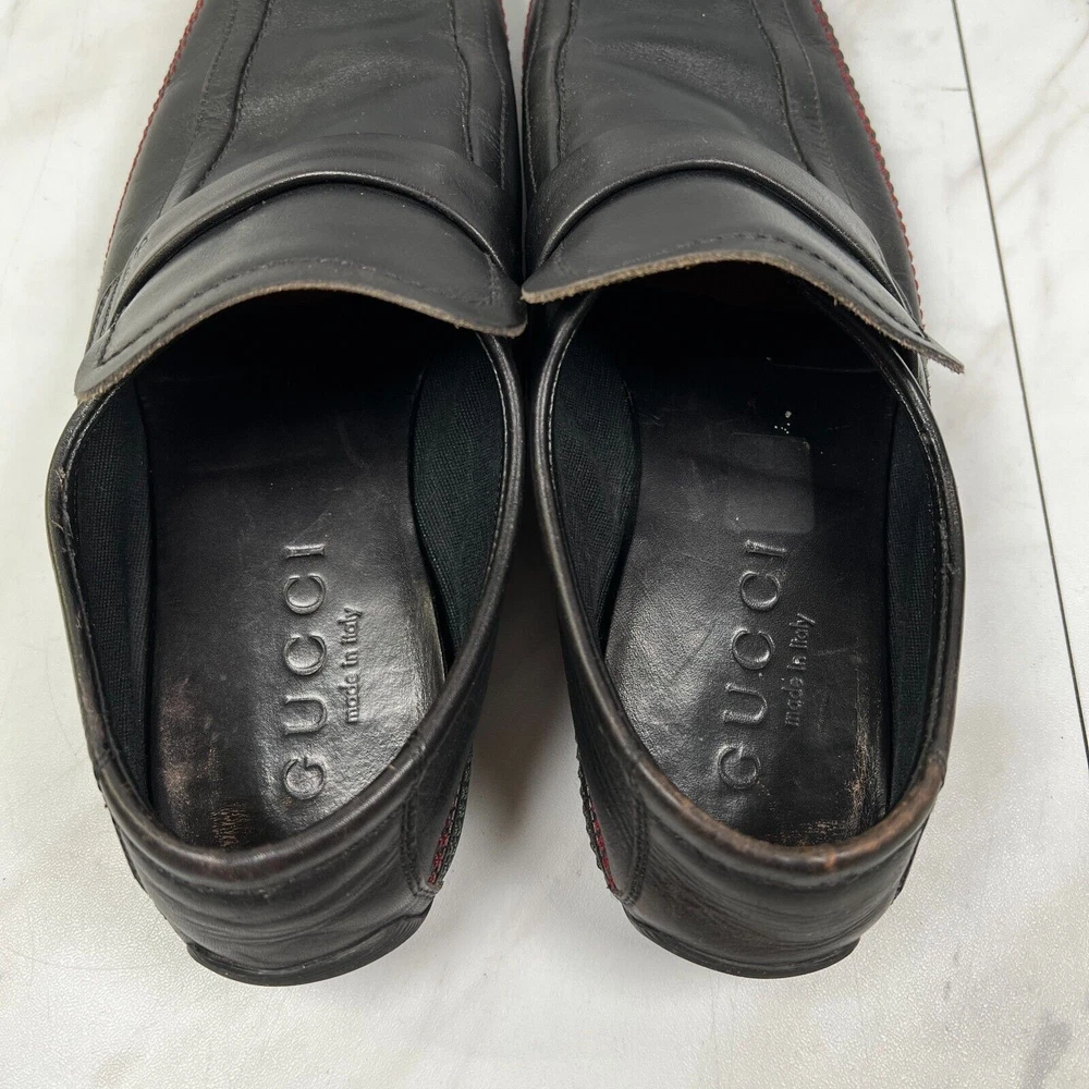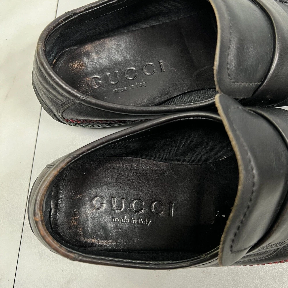 Gucci Mens Size 7 E Wide [EU 40.5] Black Contrast Stitch Leather Slip On Loafers Condition: Pre-owned No rips, holes, or tears. Smoke-free. No box. See all photos for exact condition. We ship every weekday! All orders placed Friday-Sunday will be sent out on Monday. Please be sure to reference each photo for the item's condition and message us with any questions! Thank you for checking out our product, please feel free to browse my store as well for other great deals!