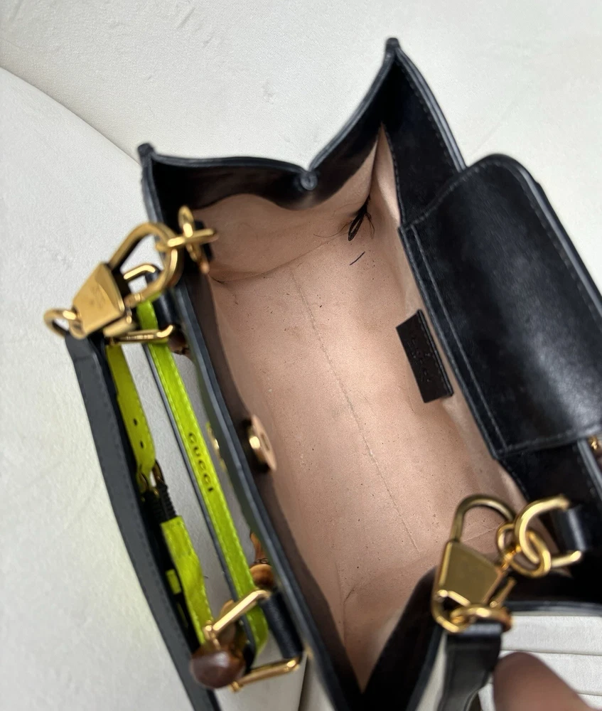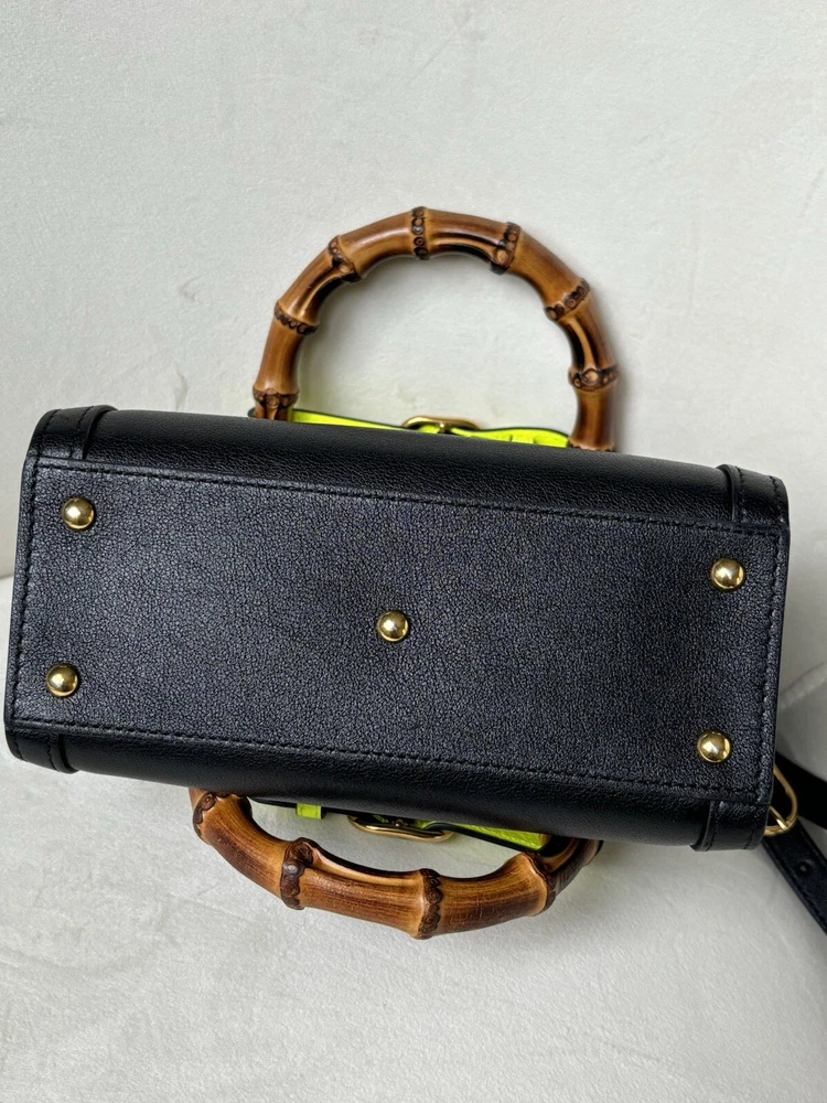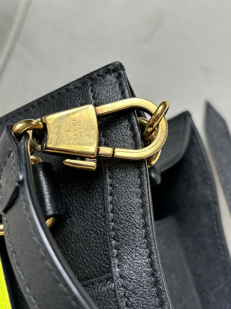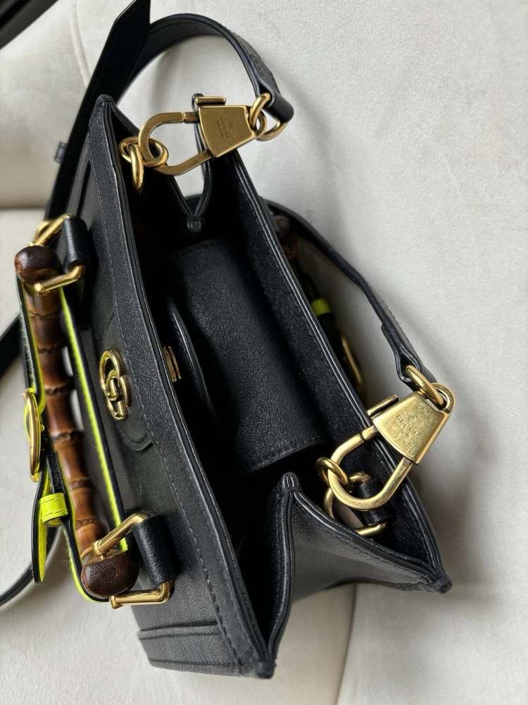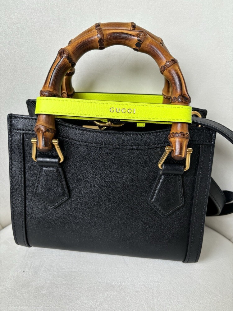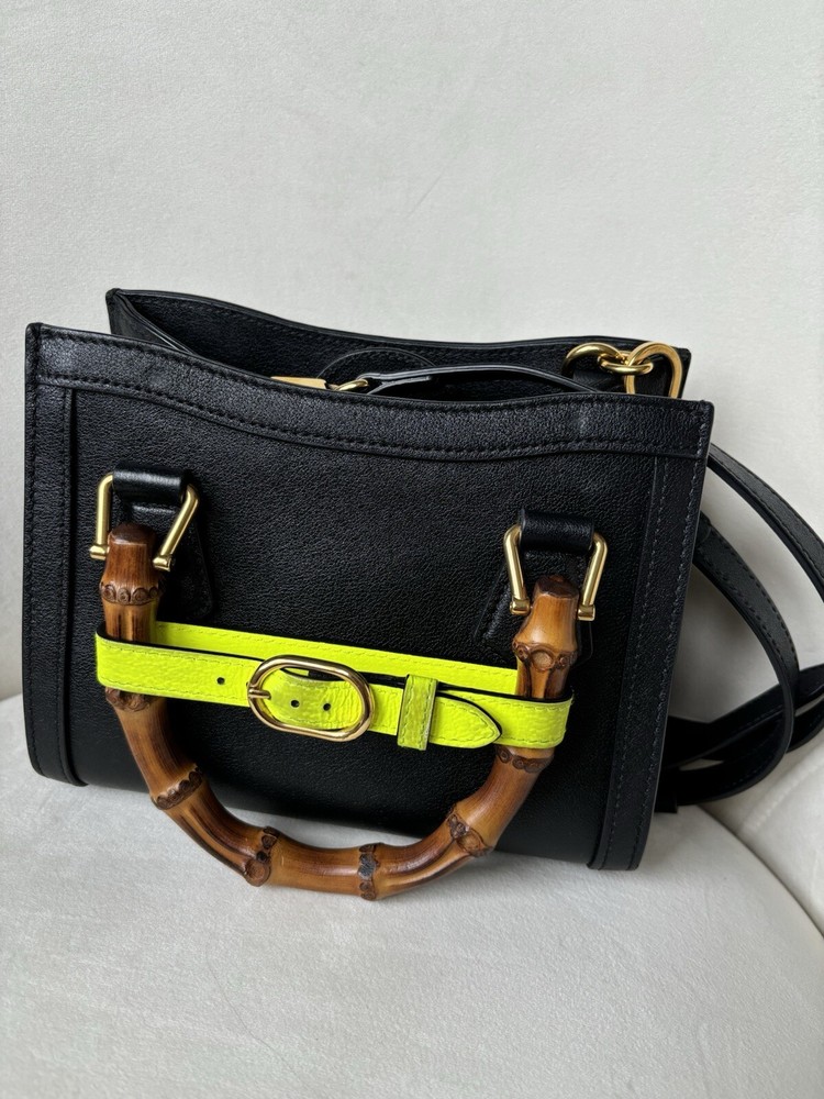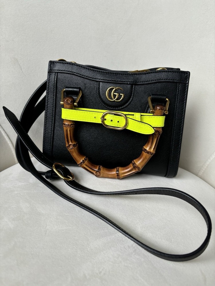 Amazing condition!!! But please read below - these are all BARELY noticeable unless looking up close: Slight small pen mark on interior (see photo - can probably be cleaned). Slight minor discoloration on the back of the bag on the yellow strap (see photo). Slight minor markings on gold hardware on the clips of the strap (see photos). Originally $3,500 from Gucci website (last photo of screenshot just to show price) Elevate your style with this stunning Gucci Wonka Grain Calfskin Mini Diana Tote Bag in Black and Yellow Fluo. This tote bag is perfect for any occasion, whether it's for travel, casual outings, or business meetings. The bag features a solid pattern and is made of high-quality leather with a suede lining. The bag has a snap closure and double handles, making it easy to carry. The cross-body strap and lightweight design add to its convenience. The tote bag comes with a canvas, leather, and bamboo handle/strap material. The hardware color is gold, which complements the overall design of the bag. This Gucci Diana product line is a must-have for women who want to make a fashion statement. Size Length: 8 in Height: 6 in Width: 3.5 in Drop: 2.75 in Drop: 22 in Comes With * Dust bag and box * Strap * 2 belt strap shapers