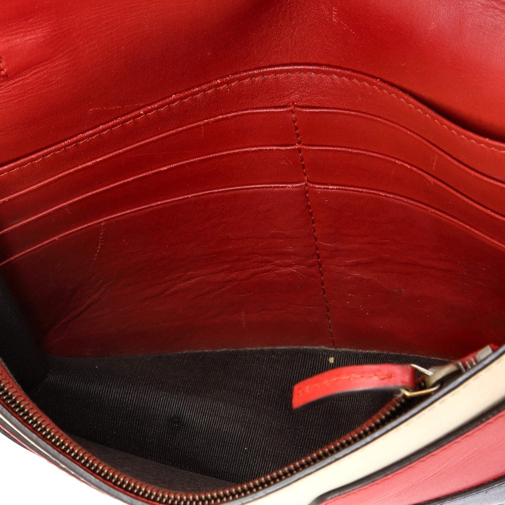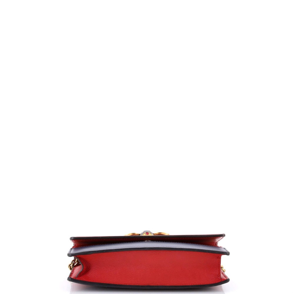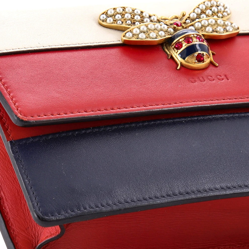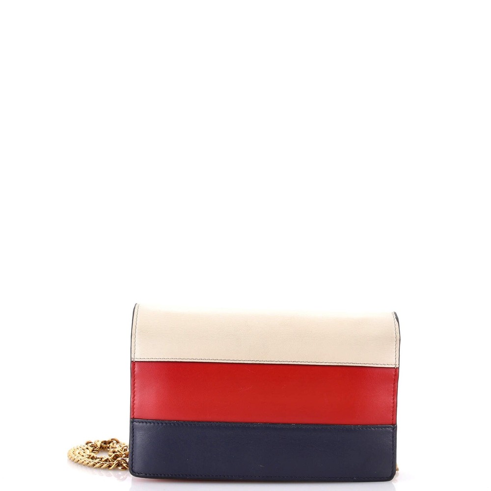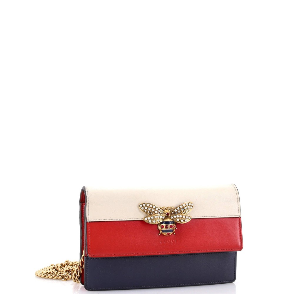 These are professional pictures of the actual item offered by Rebag. Condition: Good. Exterior: scuffs, creases, minor cracking | Interior: scuffs, discoloration | Hardware: scratches, tarnished Accessories: Dust Bag, With Strap Measurements: Height 5", Width 7.5", Depth 1.5", Strap Drop 23" Designer: Gucci Model: Queen Margaret Chain Wallet Leather Mini Exterior Material: Leather Exterior Color: Blue, Neutral, Red Interior Material: Fabric, Leather Interior Color: Black, Red Hardware Color: Aged Gold Item Number: 352497/1