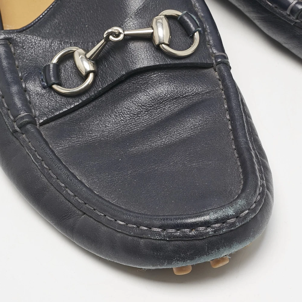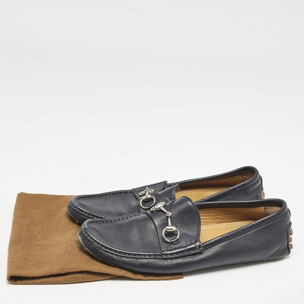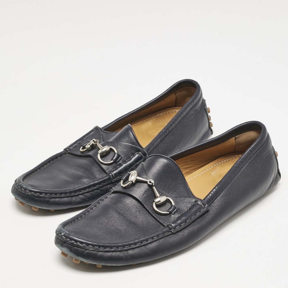 Exhibiting an iconic style and design, the Horsebit loafers from Gucci fetch the signature aesthetic of the brand effortlessly. They are designed using blue leather on the exterior with the emblematic Web strap and a gold toned Horsebit motif embellishing the vamps. Lend total class to your attire by wearing these loafers.Certified by The Luxury Closet - This item has gone through a detailed authentication process overseen by our experts. We offer a lifetime guarantee of authenticity on all our items. Import duties, taxes and charges are not included in the item price. These charges are the buyers responsibility. Please check with your country’s customs office to determine what these additional cost will be prior to buying. Our eBay Store About Us Contact Us Add to Favorite Sellers Gucci Navy Blue Leather Web Horsebit Loafers Size 42.5 $200.2 Exhibiting an iconic style and design, the Horsebit loafers from Gucci fetch the signature aesthetic of the brand effortlessly. They are designed using blue leather on the exterior with the emblematic Web strap and a gold toned Horsebit motif embellishing the vamps. Lend total class to your attire by wearing these loafers. Product Details Brand Color Navy Blue Dimensions Material Leather Size 42.5 Outsole Width Outsole Length Heel Height Includes Certified by The Luxury Closet This item has gone through a detailed authentication process overseen by our experts. We offer a lifetime guarantee of authenticity on all our items. How We Check The in-house team of experts at The Luxury Closet is highly trained to verify the authenticity and the condition of the luxury products. They ensure that only 100% authentic items are put on sale.The evaluation process is unique with its own mix of assessment criteria and differs according to the category. Each item is evaluated based on the following combination of hallmarks, hardware, stitching, symmetry, material, craftsmanship, stamping, codes, hologram stickers, and packaging. Our authenticators also check if the items have been modified or amended (e.g., aftermarket diamonds, replaced batteries, repaired bags, etc.) International Buyers Import duties, taxes and charges are not included in the item price. These charges are the buyers responsibility. Please check with your country’s customs office to determine what these additional cost will be prior to buying.