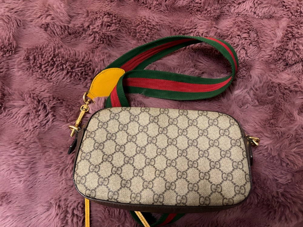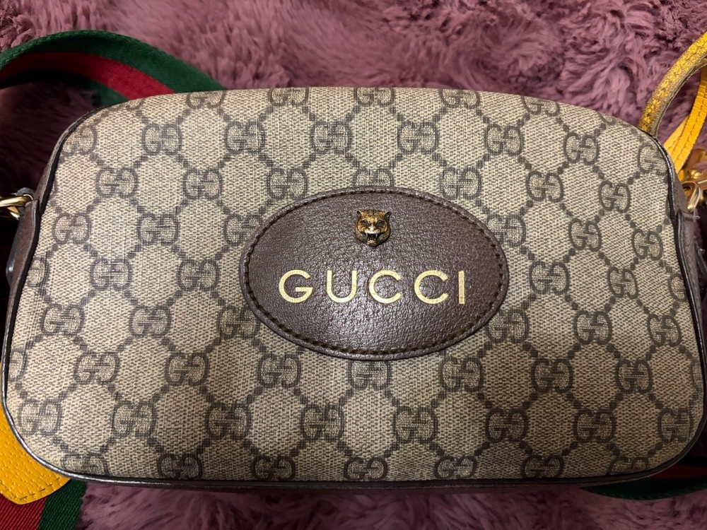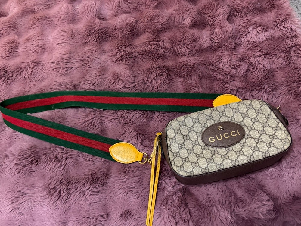 Handle/Strap Material: Leather Size: Small Features: Inner Pockets Vintage: No Accents: Strap Accent Bag Depth: 2.7 in Handle Style: Top Handle Product Line: Gucci Neo Vintage Exterior Material: Canvas, Leather Finish: Coated Brand: Gucci Shape: Rectangle Department: Women Theme: Designer Fabric Type: Rayon Customized: No Lining Material: Canvas Pattern: Gucci GG Hardware Color: Gold Model: Neo Closure: Zip Handmade: No Bag Height: 5.5 in Lining Color: Multicolor Style: Crossbody Hardware Material: Gold-Plated Handle/Strap Color: Red, Green Exterior Color: Brown, Beige Personalize: No Occasion: Crossbody Strap Drop: 19 in Accessories: Original Dust Bag