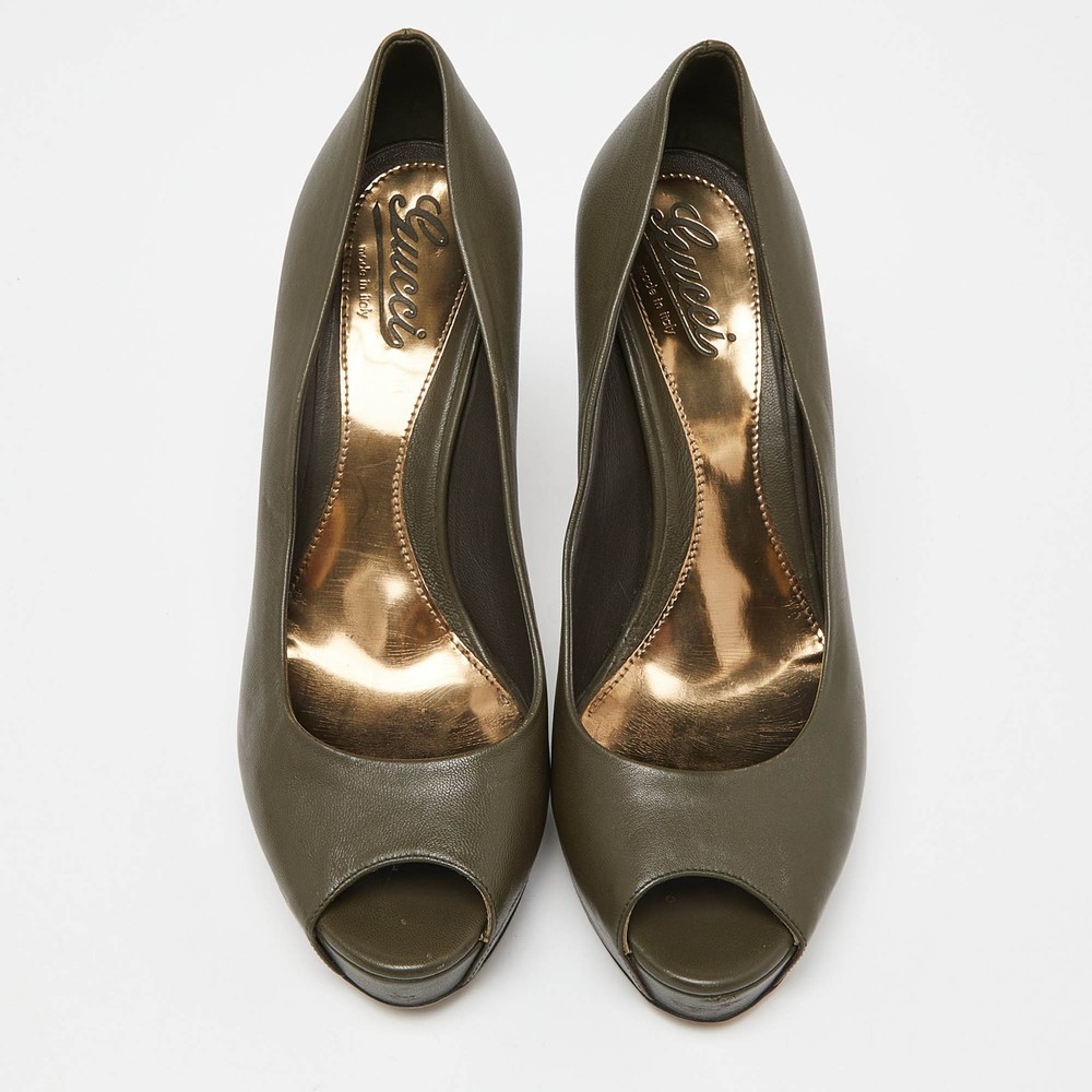 Our eBay Store About Us Contact Us Add to Favorite Sellers Gucci Olive Green Leather Peep Toe Platform Pumps Size 40.5 Discover footwear elegance with these designer women's pumps. Meticulously designed, these heels marry fashion and comfort, ensuring you shine in every setting. Product Details Brand Gucci Color Green Includes The Luxury Closet Packaging Outsole Length 25 cm Outsole Width 10 cm Size 40.5 Certified by The Luxury Closet This item has gone through a detailed authentication process overseen by our experts. We offer a lifetime guarantee of authenticity on all our items. How We Check The in-house team of experts at The Luxury Closet is highly trained to verify the authenticity and the condition of the luxury products. They ensure that only 100% authentic items are put on sale.The evaluation process is unique with its own mix of assessment criteria and differs according to the category. Each item is evaluated based on the following combination of hallmarks, hardware, stitching, symmetry, material, craftsmanship, stamping, codes, hologram stickers, and packaging. Our authenticators also check if the items have been modified or amended (e.g., aftermarket diamonds, replaced batteries, repaired bags, etc.) International Buyers Import duties, taxes and charges are not included in the item price. These charges are the buyers responsibility. Please check with your country’s customs office to determine what these additional cost will be prior to buying.