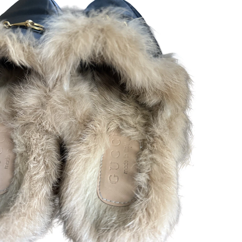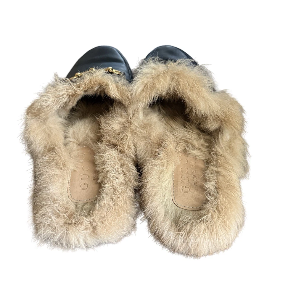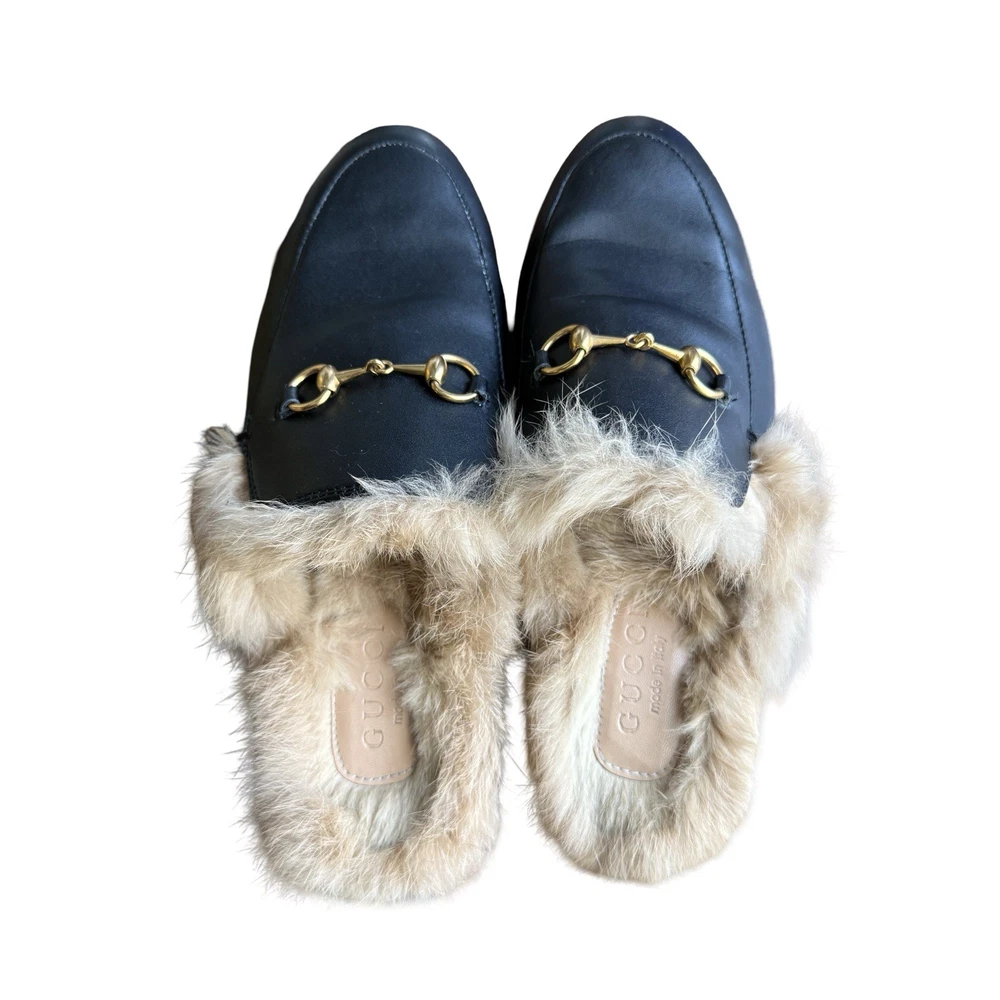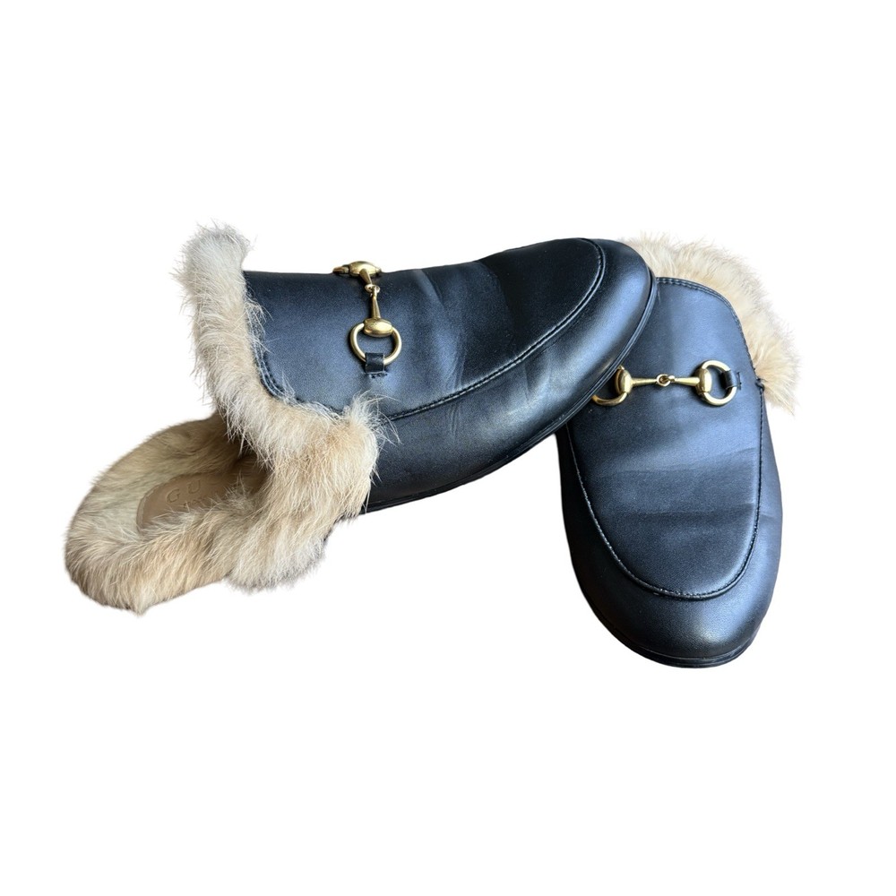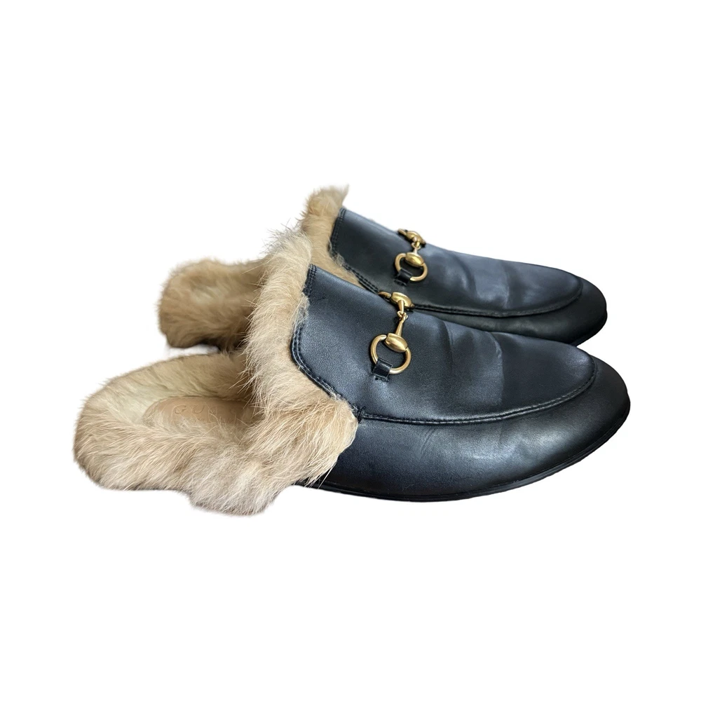 Iconic Gucci Princetown leather slippers featuring luxurious lamb fur lining and signature gold Horsebit hardware. Crafted in Italy from smooth black leather, these backless loafers are a timeless designer staple worn year-round. Originally retailed for over $1,000. A highly sought-after style that pairs effortlessly with denim, trousers, or elevated casual looks. Details: • Brand: Gucci • Style: Princetown Slippers / Mule Loafers • Upper: Black calf leather • Lining: Lamb fur / shearling • Hardware: Gold-tone Horsebit • Sole: Leather • Toe: Round • Made in Italy Condition: Pre-owned. Leather shows light creasing consistent with wear. Fur remains plush and intact. Soles show visible wear (see photos). No structural damage. Please review all photos carefully — they are part of the description. Size • Gucci size 39 • Fits approx US Women’s 8-8.5