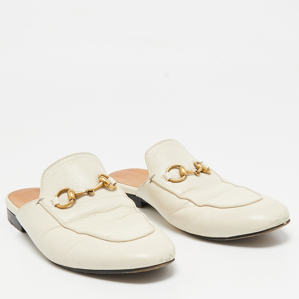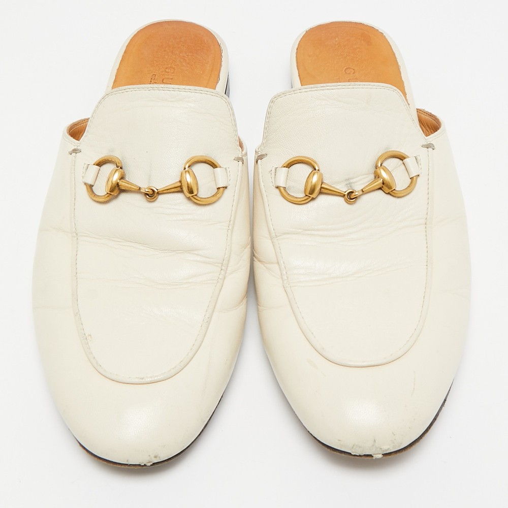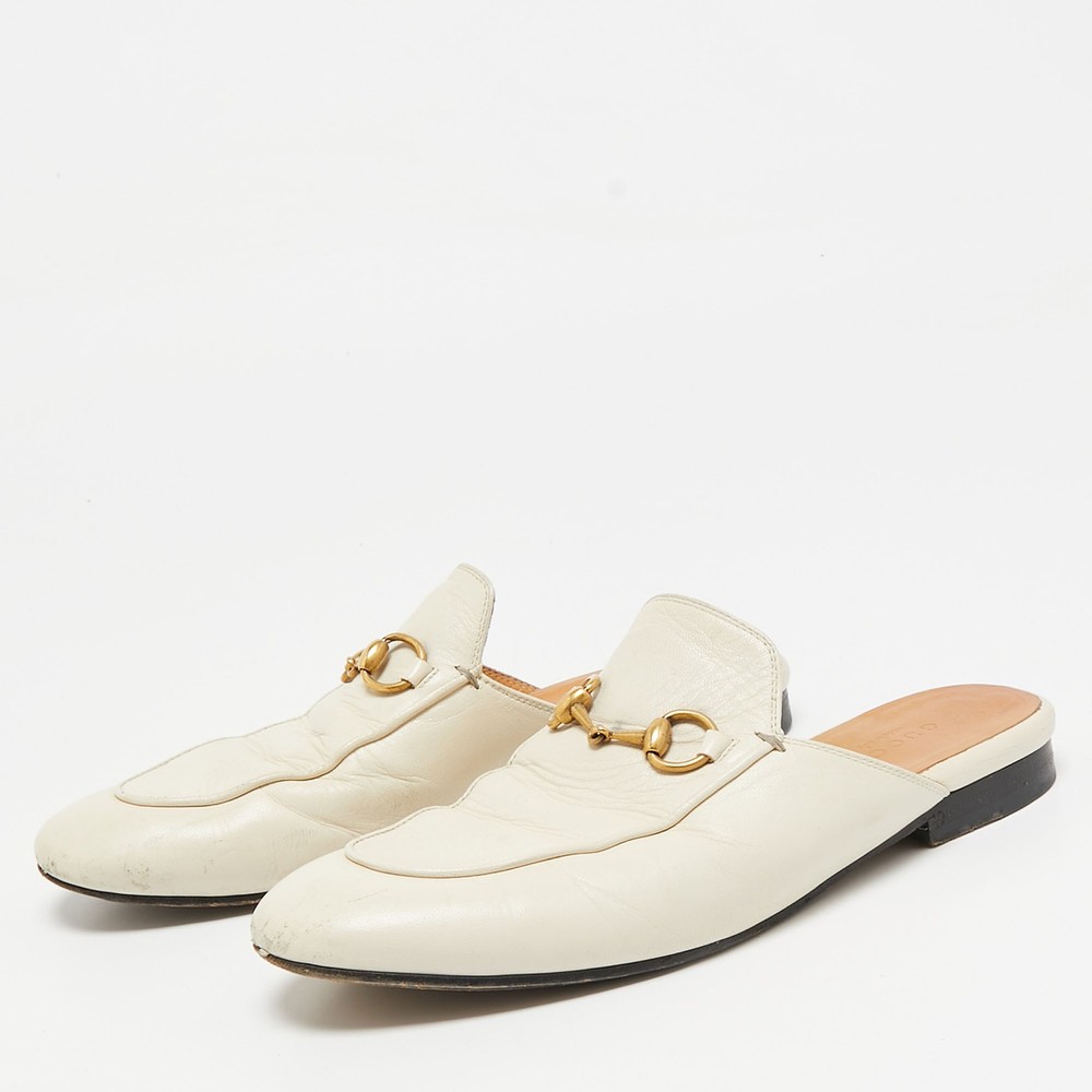 Let this comfortable pair be your first choice when youre out for a long day. These Gucci shoes have well sewn uppers beautifully set on durable soles.Certified by The Luxury Closet - This item has gone through a detailed authentication process overseen by our experts. We offer a lifetime guarantee of authenticity on all our items. Import duties, taxes and charges are not included in the item price. These charges are the buyers responsibility. Please check with your country’s customs office to determine what these additional cost will be prior to buying. Our eBay Store About Us Contact Us Add to Favorite Sellers Gucci Cream Leather Princetown Mules Size 36 $190.3 Let this comfortable pair be your first choice when youre out for a long day. These Gucci shoes have well sewn uppers beautifully set on durable soles. Product Details Brand Color Cream Dimensions Material Leather Size 36 Outsole Width 8 cm Outsole Length 25 cm Heel Height Includes The Luxury Closet Packaging Certified by The Luxury Closet This item has gone through a detailed authentication process overseen by our experts. We offer a lifetime guarantee of authenticity on all our items. How We Check The in-house team of experts at The Luxury Closet is highly trained to verify the authenticity and the condition of the luxury products. They ensure that only 100% authentic items are put on sale.The evaluation process is unique with its own mix of assessment criteria and differs according to the category. Each item is evaluated based on the following combination of hallmarks, hardware, stitching, symmetry, material, craftsmanship, stamping, codes, hologram stickers, and packaging. Our authenticators also check if the items have been modified or amended (e.g., aftermarket diamonds, replaced batteries, repaired bags, etc.) International Buyers Import duties, taxes and charges are not included in the item price. These charges are the buyers responsibility. Please check with your country’s customs office to determine what these additional cost will be prior to buying.