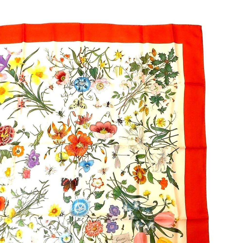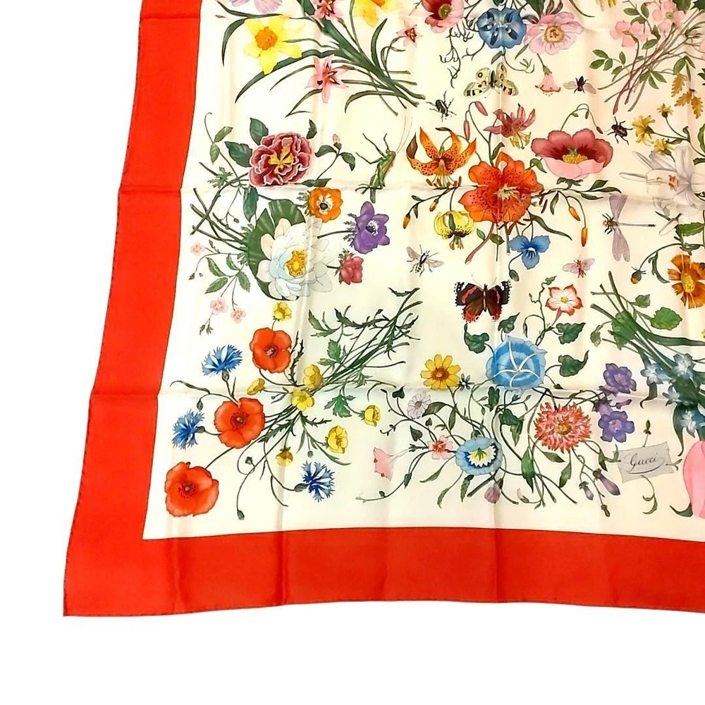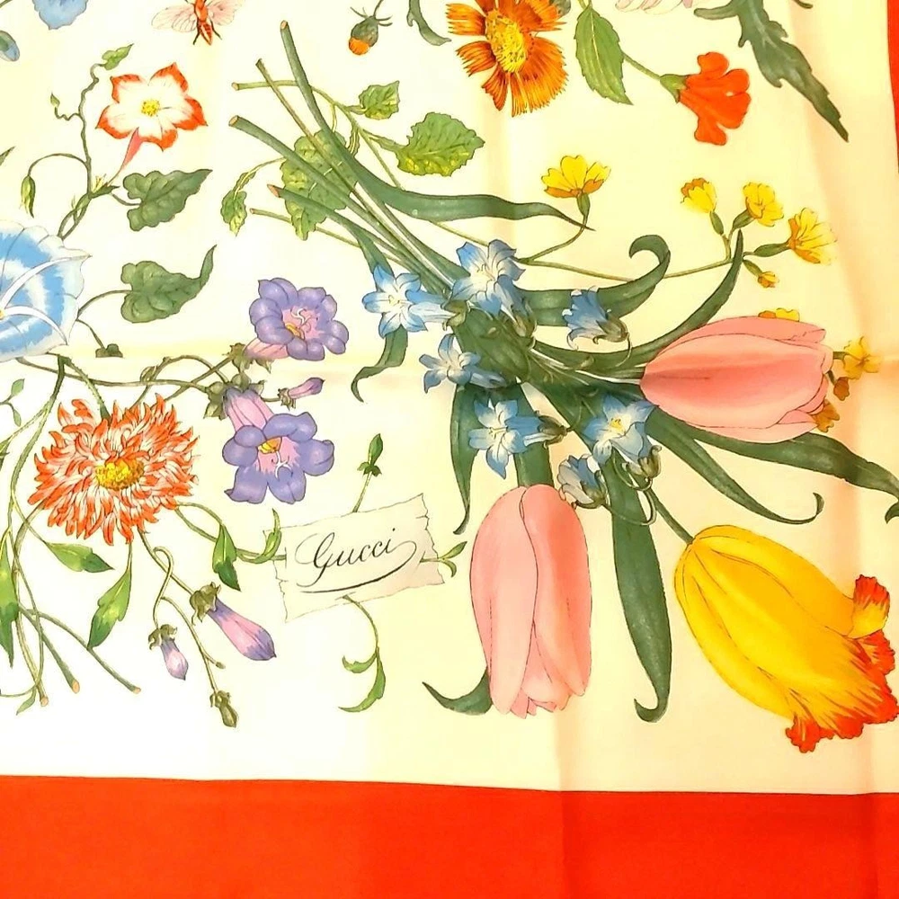 Very beautiful Gucci scarf 100% silk, floral, floral pattern, red, made in Italy, MADE IN ITALY, large size Size (approx. cm) Length: 88cm Width: 88cm Please allow for slight deviations. Color: Reddish color x white beige color x floral pattern (see image) Condition There are some creases, but overall, it is a beautiful item that does not show much signs of use. It can be used for a long time..