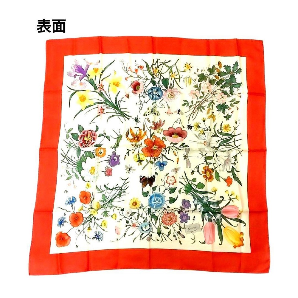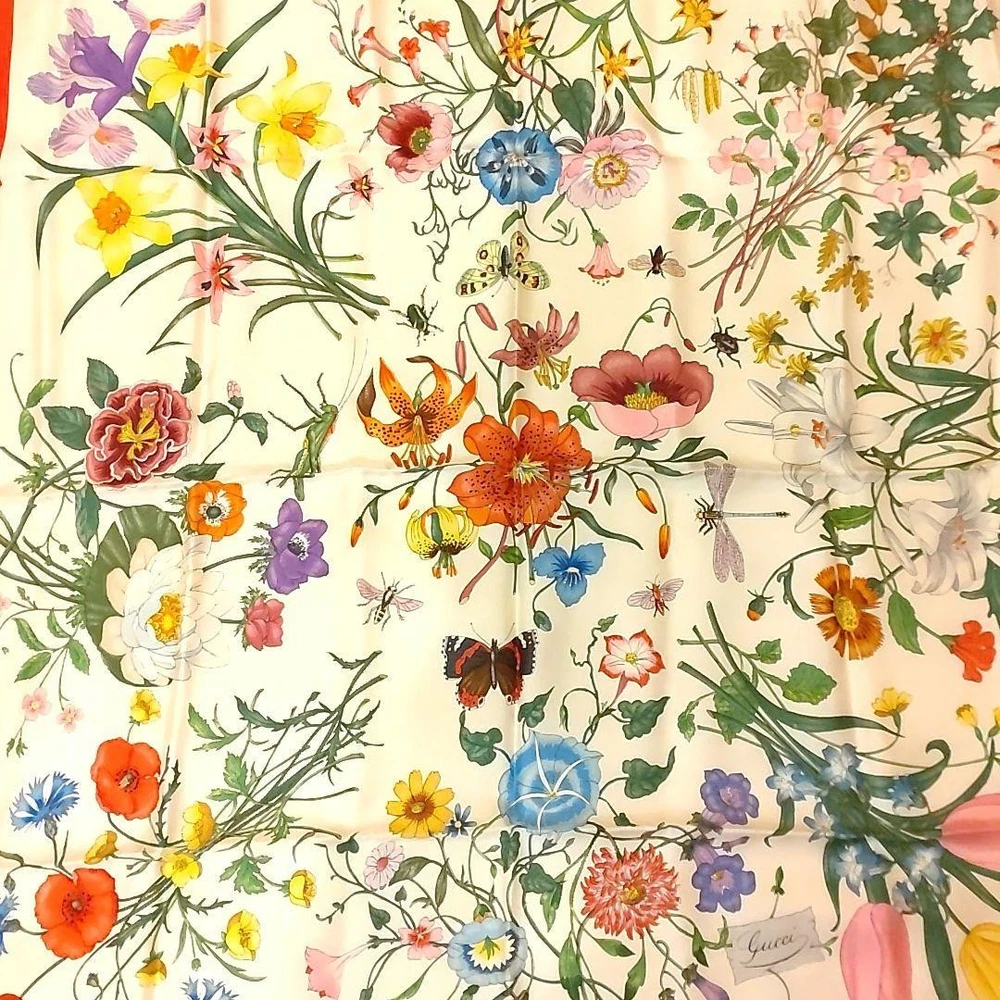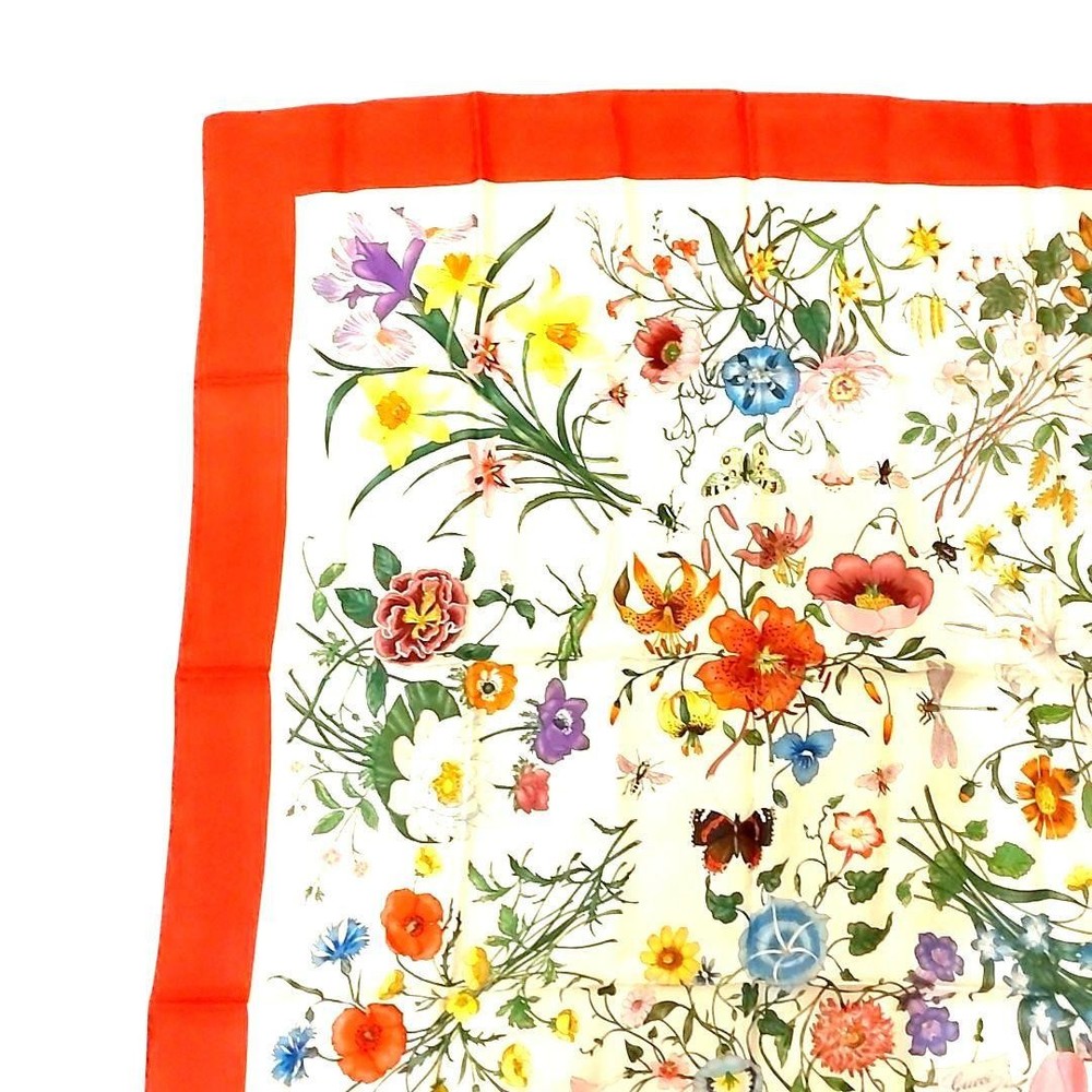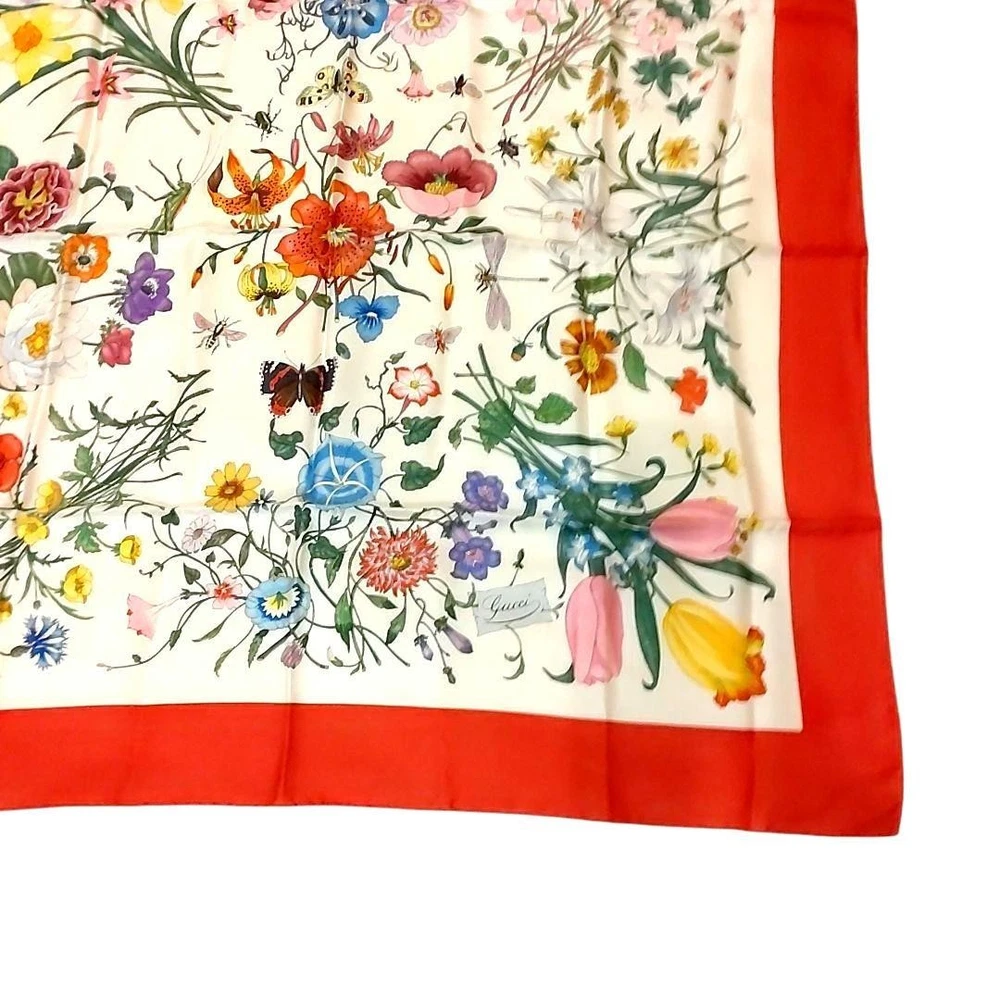 Very beautiful Gucci scarf 100% silk, floral, floral pattern, red, made in Italy, MADE IN ITALY, large size Size (approx. cm) Length: 88cm Width: 88cm Please allow for slight deviations. Color: Reddish color x white beige color x floral pattern (see image) Condition There are some creases, but overall, it is a beautiful item that does not show much signs of use. It can be used for a long time..