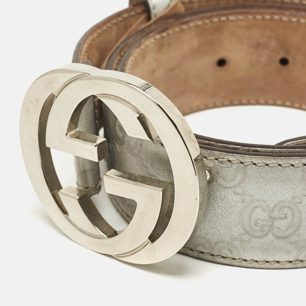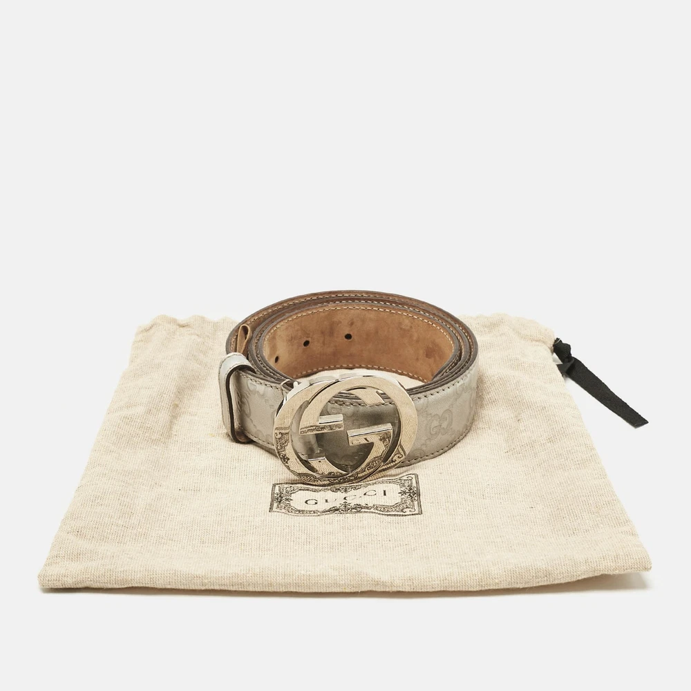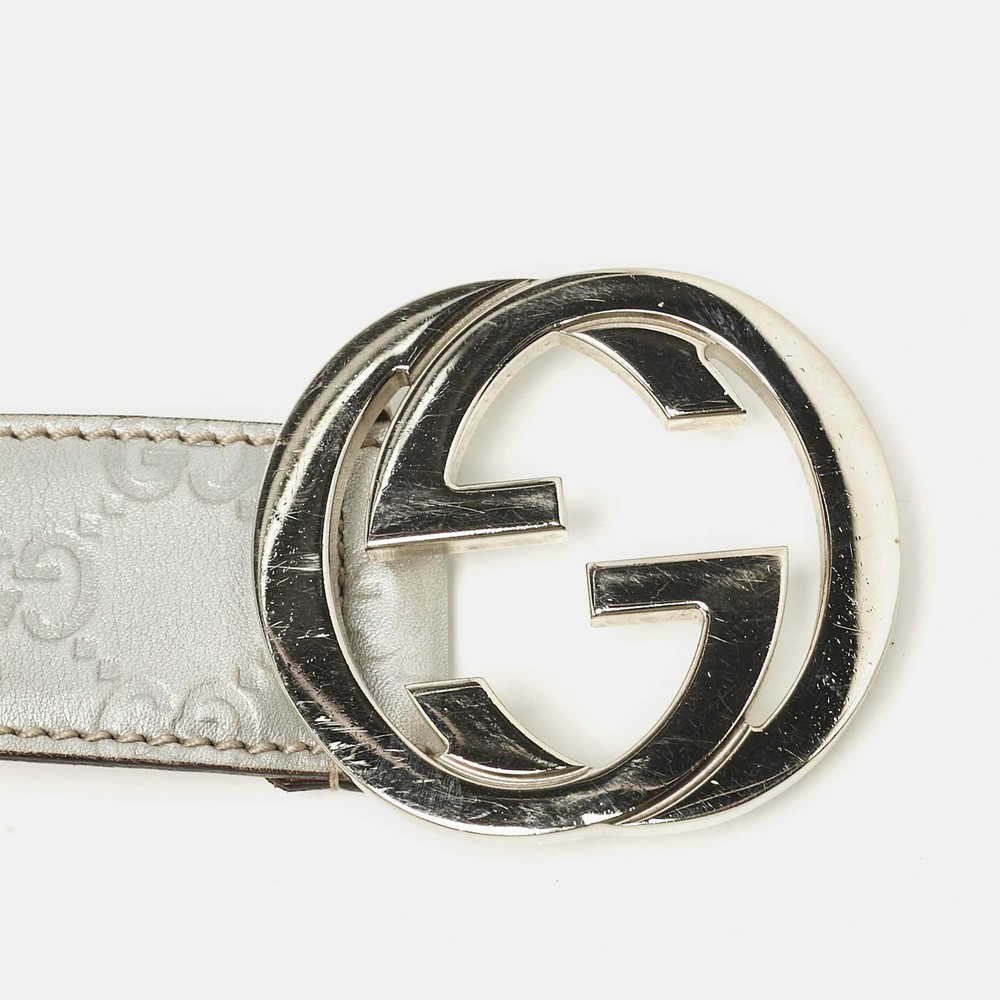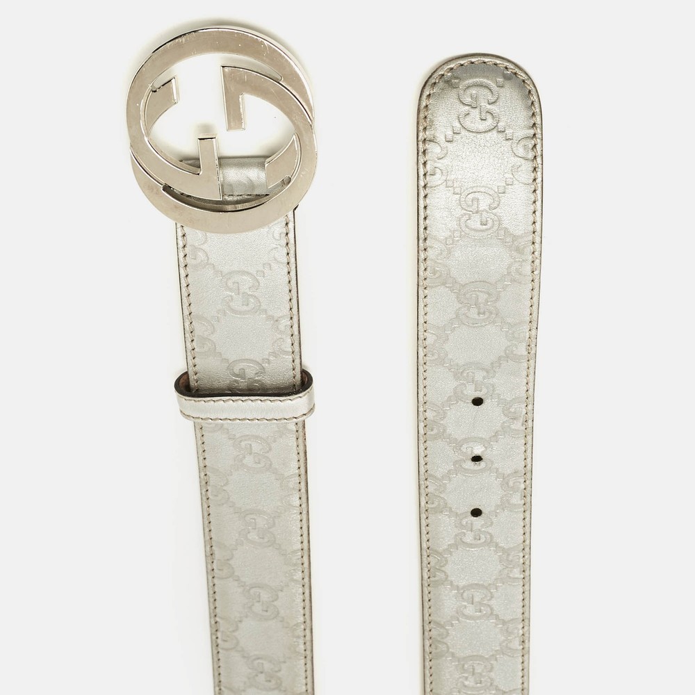 Add the luxury touch to your accessory collection with this belt from Gucci. It is made from Guccissima leather and designed with an interlocking G buckle—an iconic element from Gucci. Grab it right awayCertified by The Luxury Closet - This item has gone through a detailed authentication process overseen by our experts. We offer a lifetime guarantee of authenticity on all our items. Import duties, taxes and charges are not included in the item price. These charges are the buyers responsibility. Please check with your country’s customs office to determine what these additional cost will be prior to buying. Our eBay Store About Us Contact Us Add to Favorite Sellers Gucci Silver Guccissima Leather Interlocking G Buckle Belt 85 CM $200.2 Add the luxury touch to your accessory collection with this belt from Gucci. It is made from Guccissima leather and designed with an interlocking G buckle—an iconic element from Gucci. Grab it right away Product Details Brand Color Silver Dimensions Width: 4 cm, Length: 85 cm Material Leather Size 85 CM Outsole Width Outsole Length Heel Height Includes Original Dustbag Certified by The Luxury Closet This item has gone through a detailed authentication process overseen by our experts. We offer a lifetime guarantee of authenticity on all our items. How We Check The in-house team of experts at The Luxury Closet is highly trained to verify the authenticity and the condition of the luxury products. They ensure that only 100% authentic items are put on sale.The evaluation process is unique with its own mix of assessment criteria and differs according to the category. Each item is evaluated based on the following combination of hallmarks, hardware, stitching, symmetry, material, craftsmanship, stamping, codes, hologram stickers, and packaging. Our authenticators also check if the items have been modified or amended (e.g., aftermarket diamonds, replaced batteries, repaired bags, etc.) International Buyers Import duties, taxes and charges are not included in the item price. These charges are the buyers responsibility. Please check with your country’s customs office to determine what these additional cost will be prior to buying.