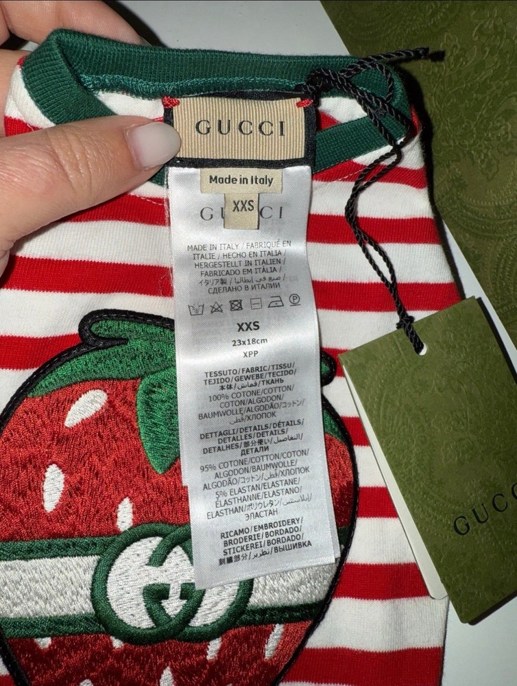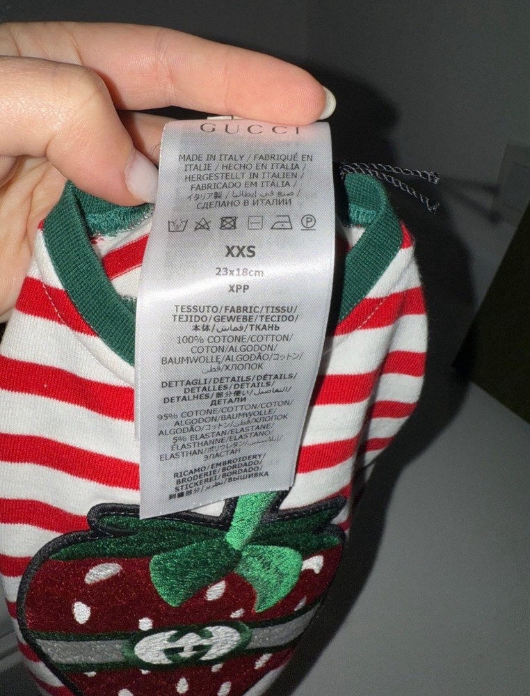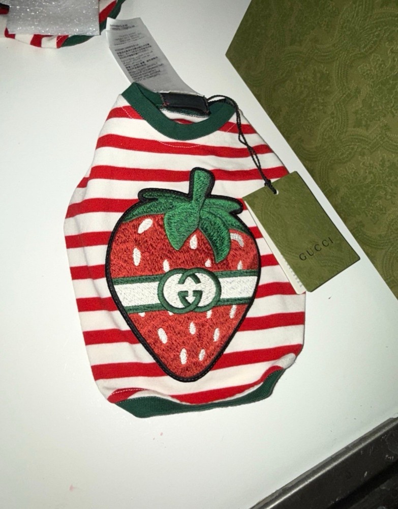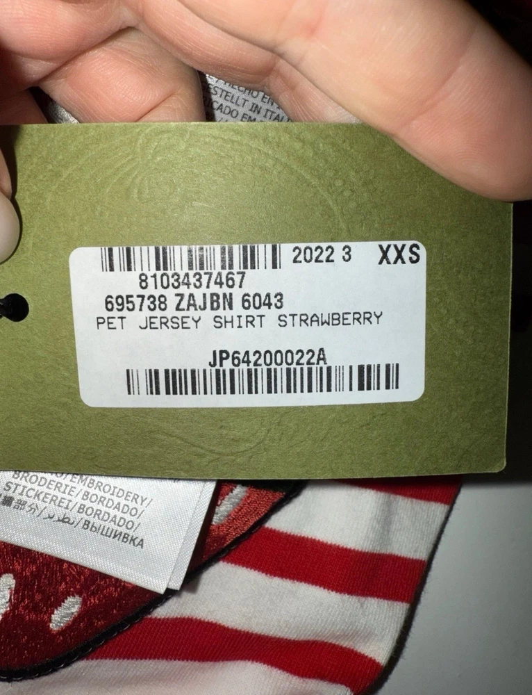 Red, white and green cotton Gucci pet shirt in size XXS with embroidered strawberry and brand signature Interlocking GG motif at top and brand label at neckline. Made in Italy. NWT 23 X 18 CM 9” x 7” Please see attached photos and feel free to reach out to me with any questions you may have. Thank you! I have two available, bundle and save!