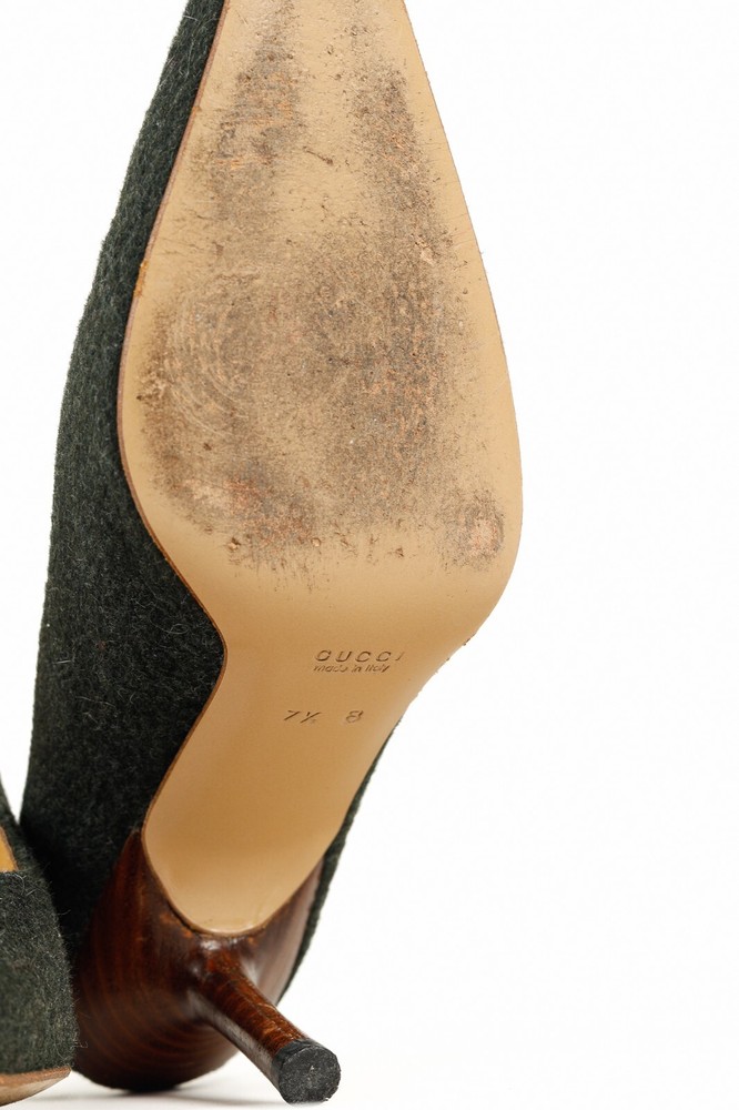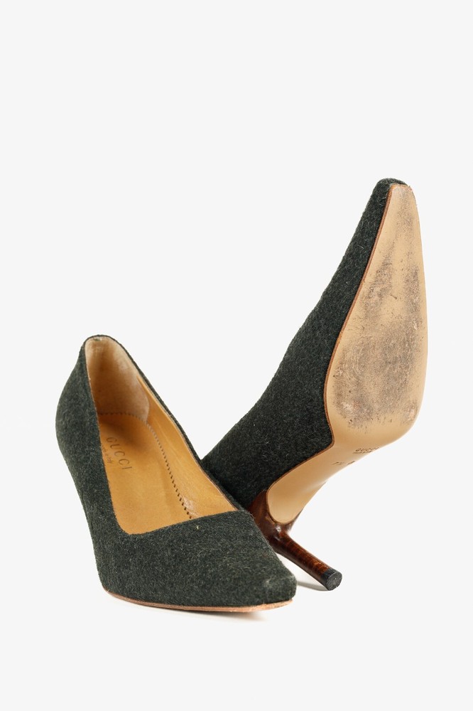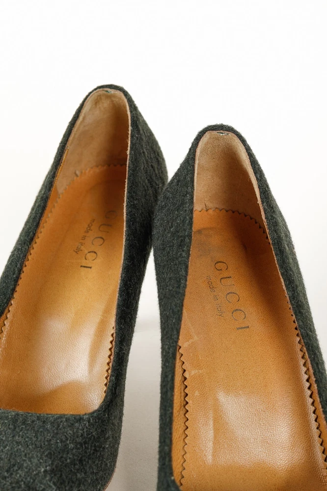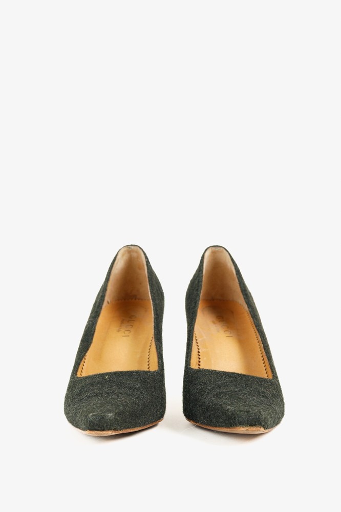 Department: Women Brand: Gucci US Shoe Size: 7.5 Type: Heel Seller Notes: “Excellent; some scratching and wear on insoles, light wear on heels, moderate wear on outsoles.” Toe Shape: Pointed Toe Style: Pump Upper Material: Wool Color: Green