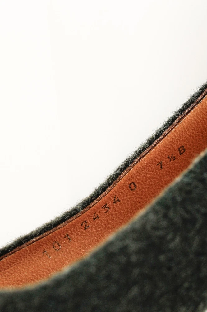 These pumps from Gucci circa Tom Ford era are crafted in a green wool, and feature stacked low heels, closed pointed toes, and leather lining and soles. Size: 7.5B Condition: Excellent; some scratching and wear on insoles, light wear on heels, moderate wear on outsoles. Approximate Measurements: Insole Length: 9.5” (24 cm) Heel Height: 3” (7.5 cm) Composition: Wool upper, leather lining and soles.