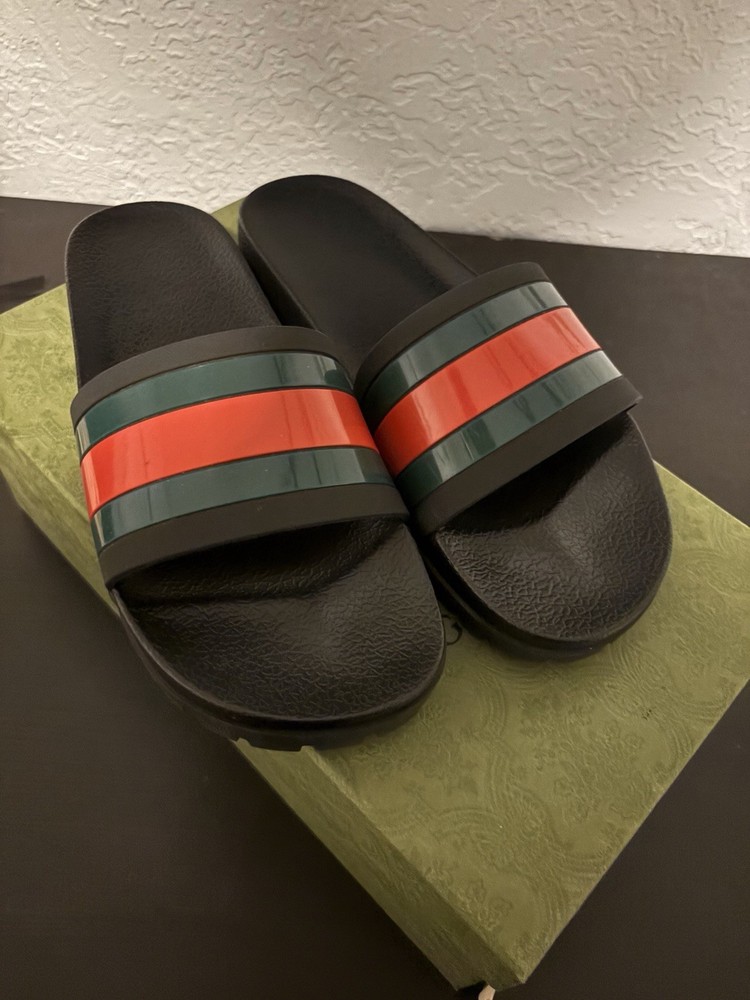 The Gucci Web Men's Rubber Slide Sandal in black rubber is a stylish designer sandal perfect for casual occasions during the summer, fall, and spring seasons. Featuring a striped pattern and the iconic Gucci Web design, these sandals are comfortable and fashionable for men who appreciate high-quality footwear. The rubber outsole and insole provide durability and support, making these sandals a practical yet luxurious choice for everyday wear.