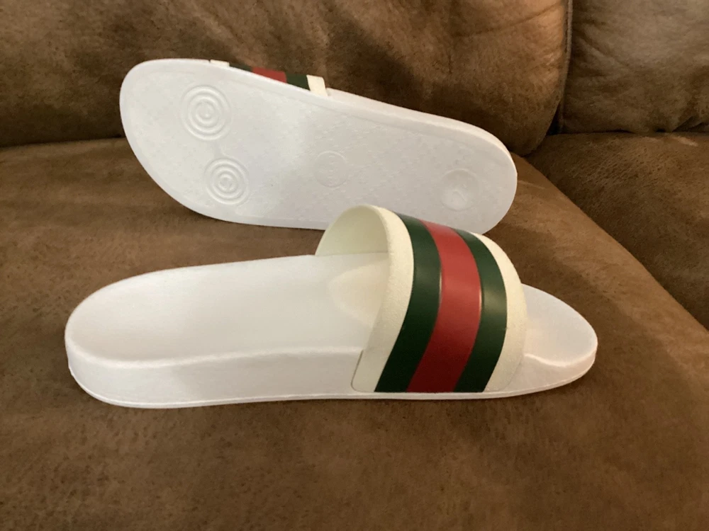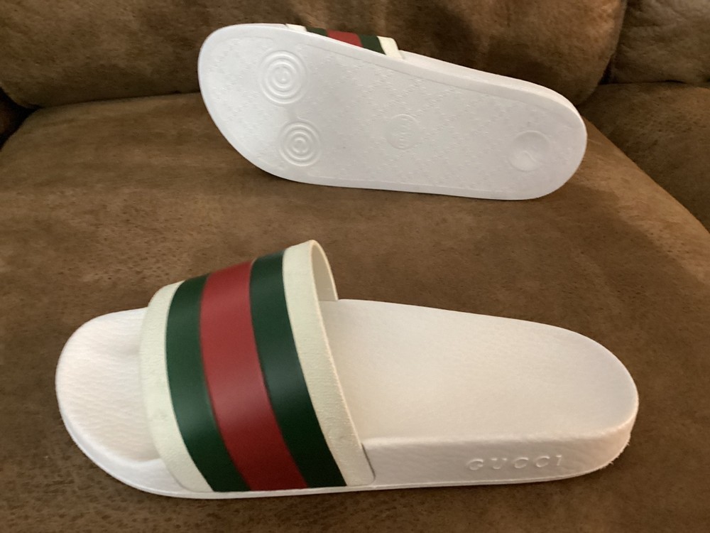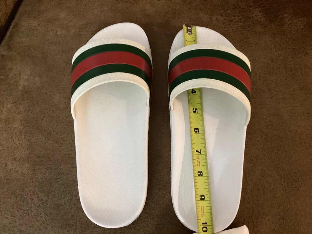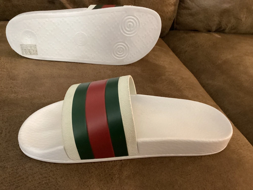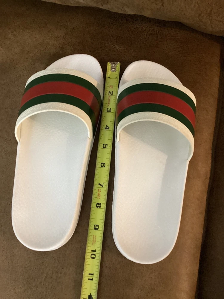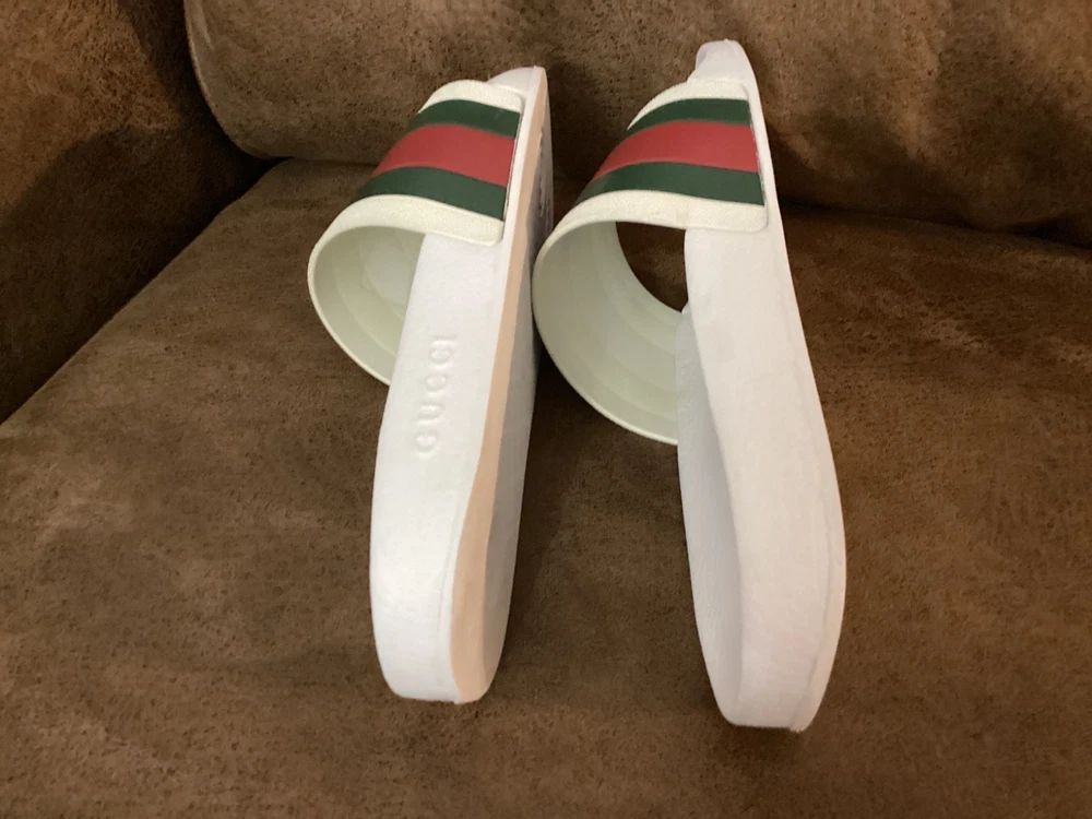 Gucci Men’s Web Stripe White Rubber Pool Slides Size US 7 / EU 40 – Pre-Owned w/ Dust Bag Item Description: Step into luxury with these authentic Gucci men's rubber pool slides , featuring the iconic red and green web stripe across the front. These slides are pre-owned in very good condition , showing only light wear. The original box is not included, but a Gucci dust bag is included for storage and travel. Brand: Gucci Color: White with Signature Red & Green Stripe Material: Rubber Estimated Size: US Men’s 7 / EU 40 (based on outsole measurement of approx. 10 inches – see photo) Condition: Pre-owned – very good condition, no major scuffs, soles in great shape Includes: Gucci dust bag only (no box) 📏 Note: Size is not printed on the slides. Measurement is approx. 10 inches (25.4 cm) in length. Please check your sizing accordingly.