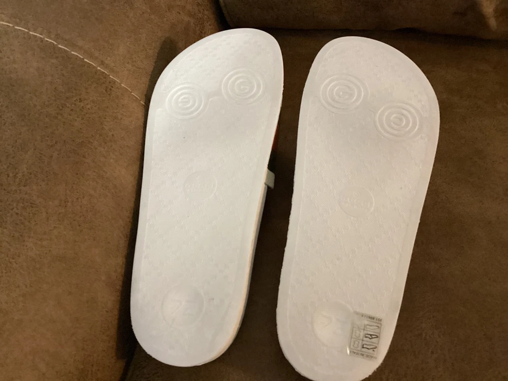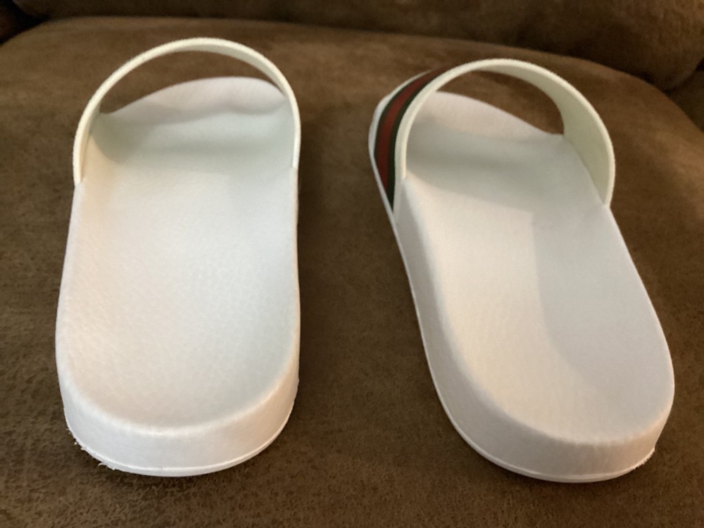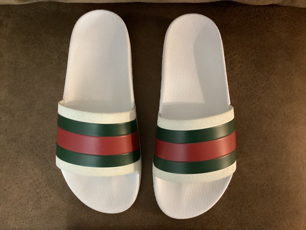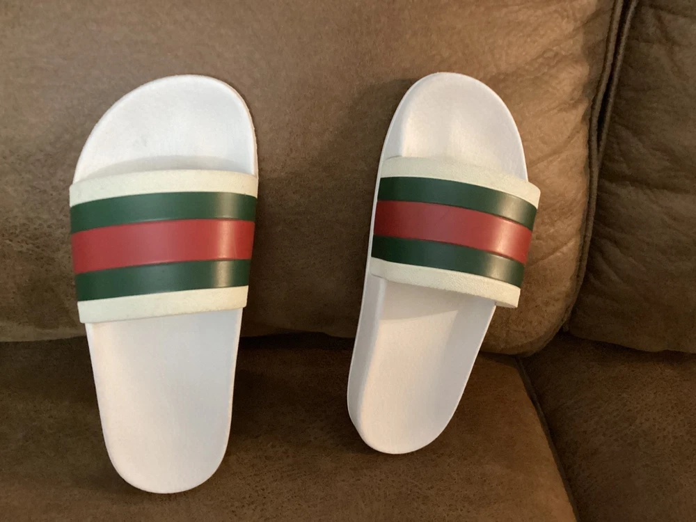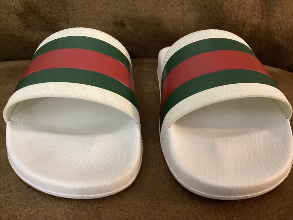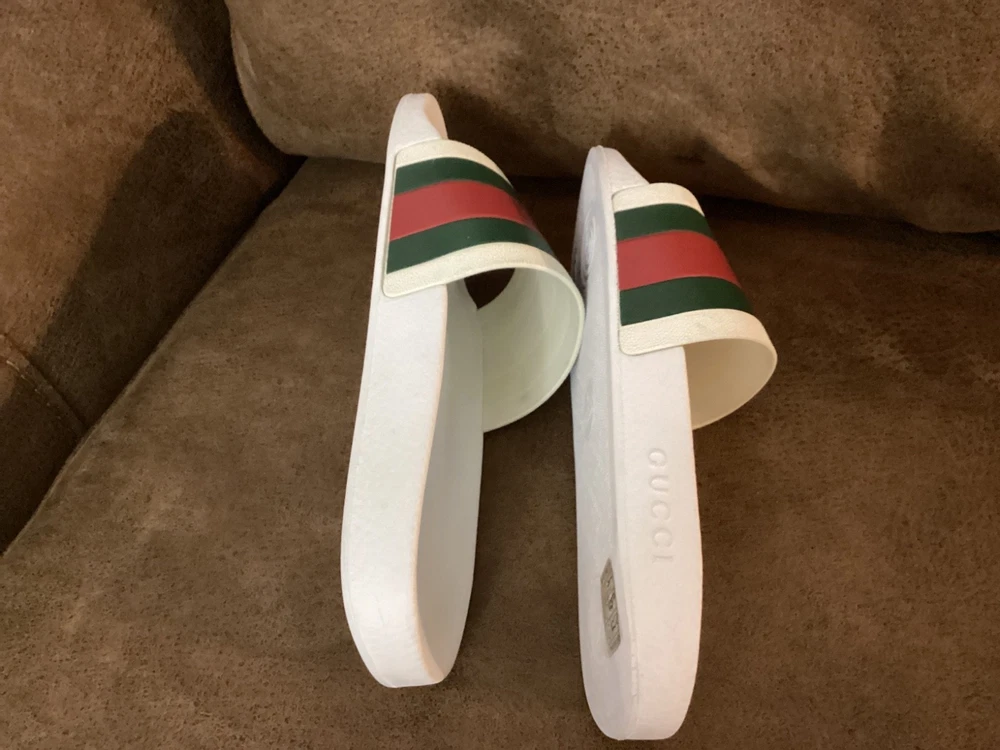 Gucci Men’s Web Stripe White Rubber Pool Slides Size US 7 / EU 40 – Pre-Owned w/ Dust Bag Item Description: Step into luxury with these authentic Gucci men's rubber pool slides , featuring the iconic red and green web stripe across the front. These slides are pre-owned in very good condition , showing only light wear. The original box is not included, but a Gucci dust bag is included for storage and travel. Brand: Gucci Color: White with Signature Red & Green Stripe Material: Rubber Estimated Size: US Men’s 7 / EU 40 (based on outsole measurement of approx. 10 inches – see photo) Condition: Pre-owned – very good condition, no major scuffs, soles in great shape Includes: Gucci dust bag only (no box) 📏 Note: Size is not printed on the slides. Measurement is approx. 10 inches (25.4 cm) in length. Please check your sizing accordingly.