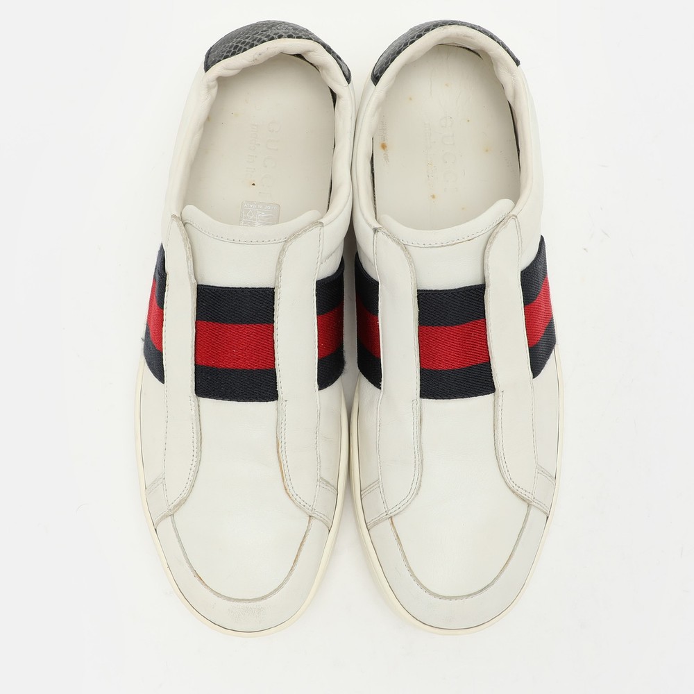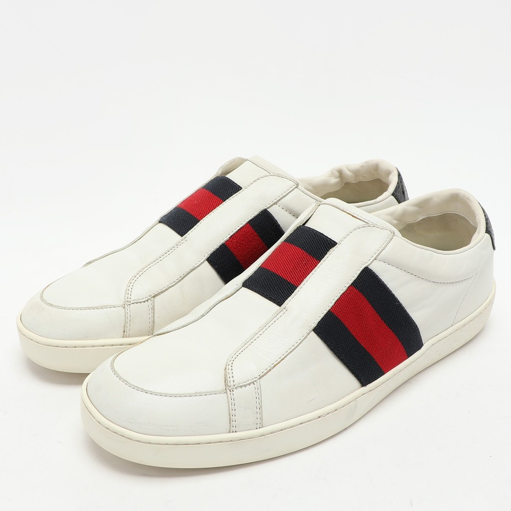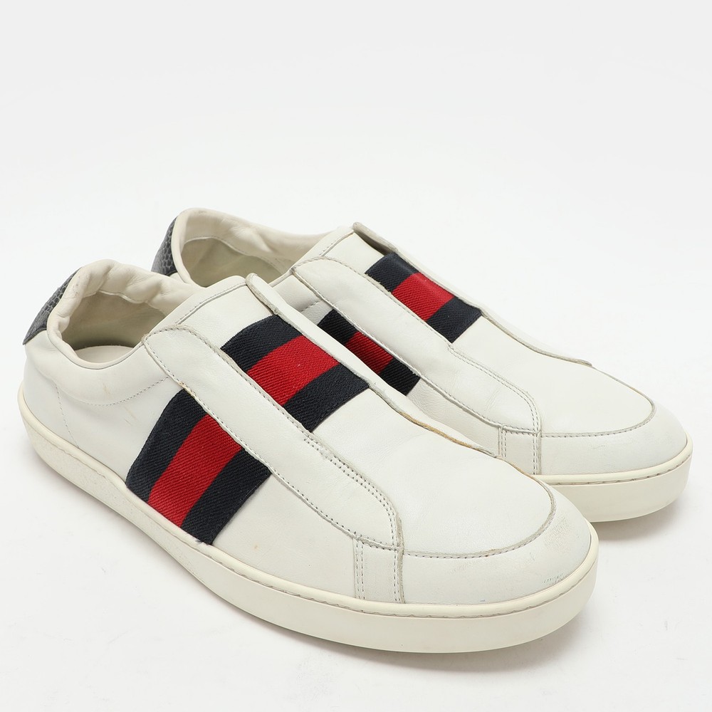 Add a statement appeal to your outfit with these sneakers. Made from premium materials, they feature lace up vamps and relaxing footbeds. The durable sole of this pair aims to provide you with everyday ease.Certified by The Luxury Closet - This item has gone through a detailed authentication process overseen by our experts. We offer a lifetime guarantee of authenticity on all our items. Import duties, taxes and charges are not included in the item price. These charges are the buyers responsibility. Please check with your country’s customs office to determine what these additional cost will be prior to buying. Our eBay Store About Us Contact Us Add to Favorite Sellers Gucci White Leather Web Slip On Sneakers Size 43 $314.6 Add a statement appeal to your outfit with these sneakers. Made from premium materials, they feature lace up vamps and relaxing footbeds. The durable sole of this pair aims to provide you with everyday ease. Product Details Brand Color White Dimensions Material Leather Size 43 Outsole Width 10 cm Outsole Length 29.5 cm Heel Height Includes The Luxury Closet Packaging Certified by The Luxury Closet This item has gone through a detailed authentication process overseen by our experts. We offer a lifetime guarantee of authenticity on all our items. How We Check The in-house team of experts at The Luxury Closet is highly trained to verify the authenticity and the condition of the luxury products. They ensure that only 100% authentic items are put on sale.The evaluation process is unique with its own mix of assessment criteria and differs according to the category. Each item is evaluated based on the following combination of hallmarks, hardware, stitching, symmetry, material, craftsmanship, stamping, codes, hologram stickers, and packaging. Our authenticators also check if the items have been modified or amended (e.g., aftermarket diamonds, replaced batteries, repaired bags, etc.) International Buyers Import duties, taxes and charges are not included in the item price. These charges are the buyers responsibility. Please check with your country’s customs office to determine what these additional cost will be prior to buying.
