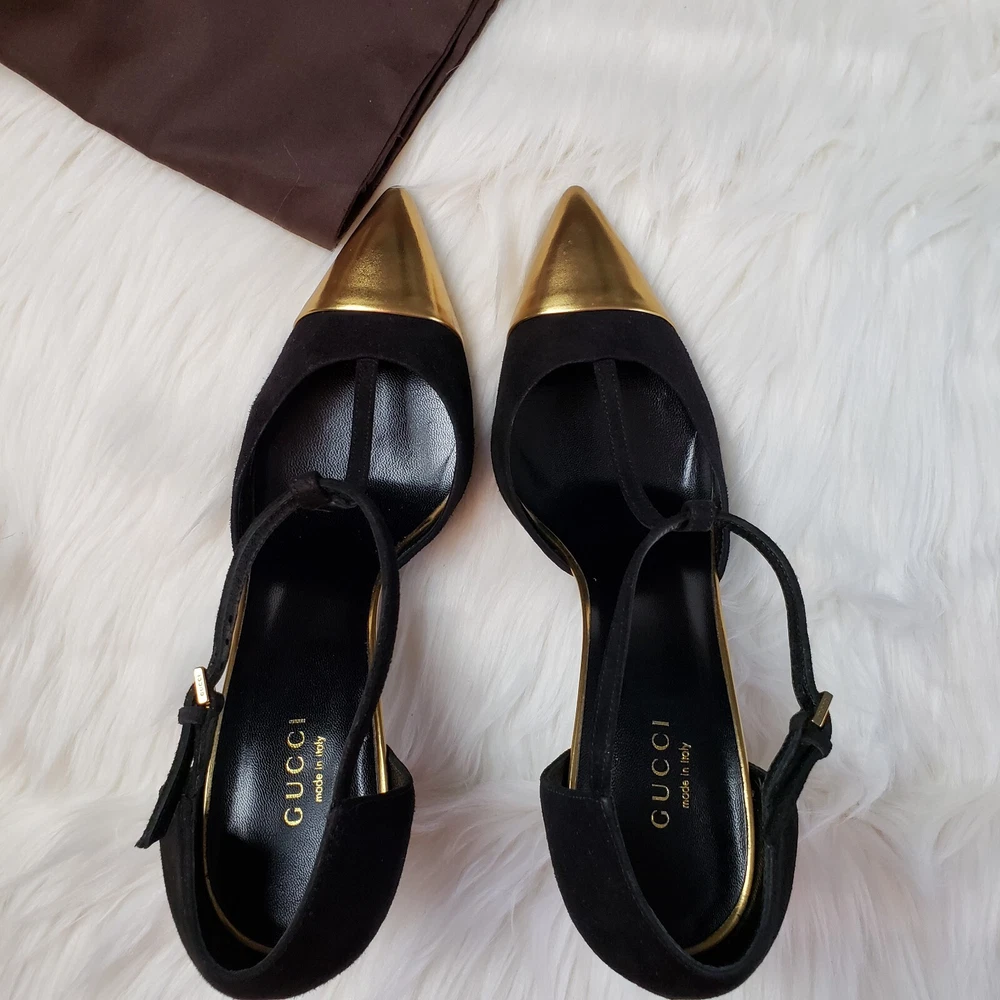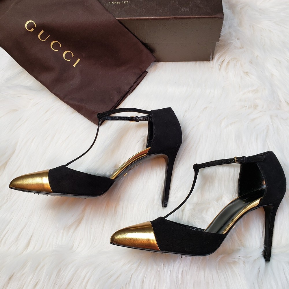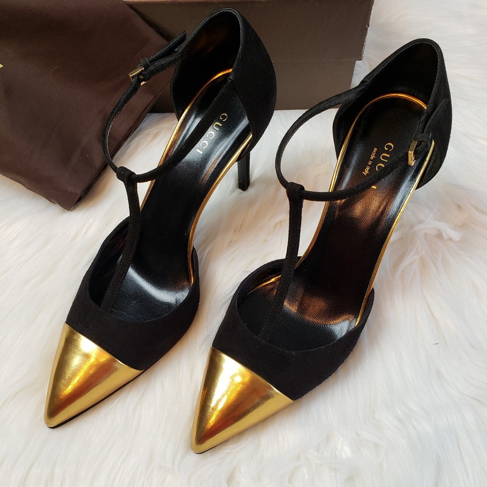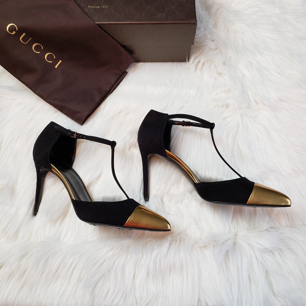 Gucci Womens Suede/Kidskin Strappy Gold Toe T-Strap Heels Black Size 37. 3" heel. Normal Wear, Great condition. Free Priority Mail Shipping Please email for additional photos/info