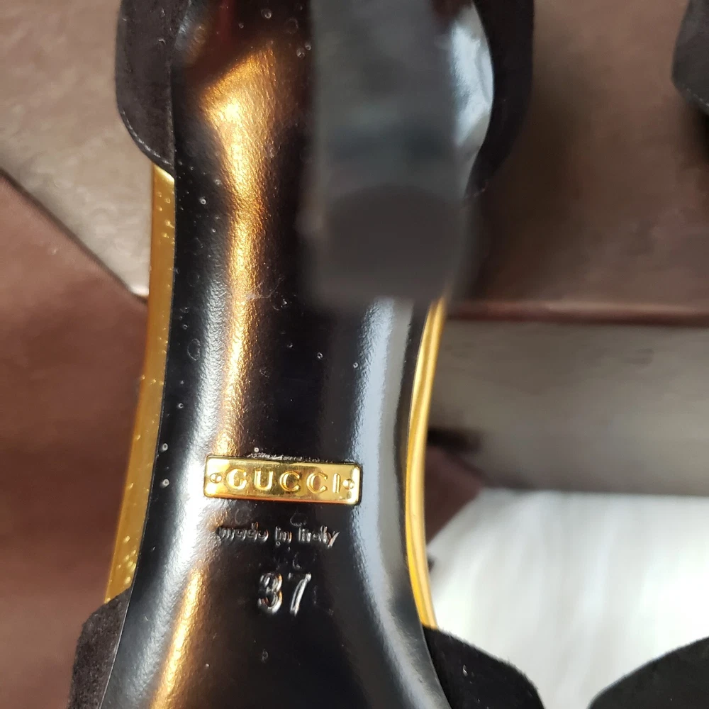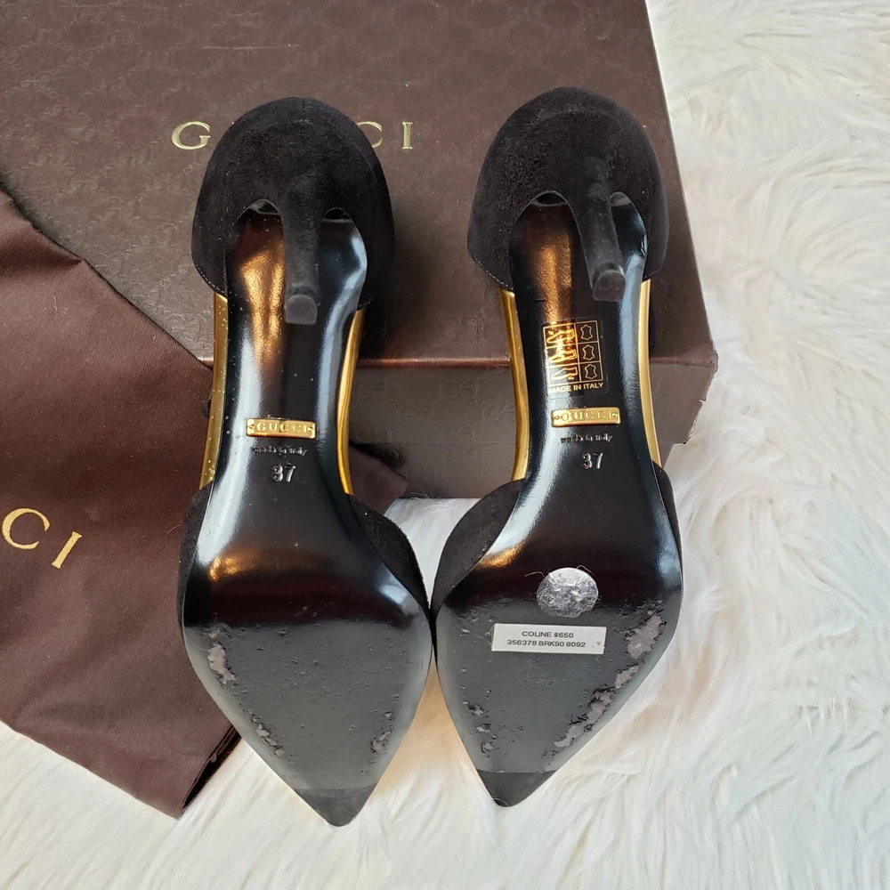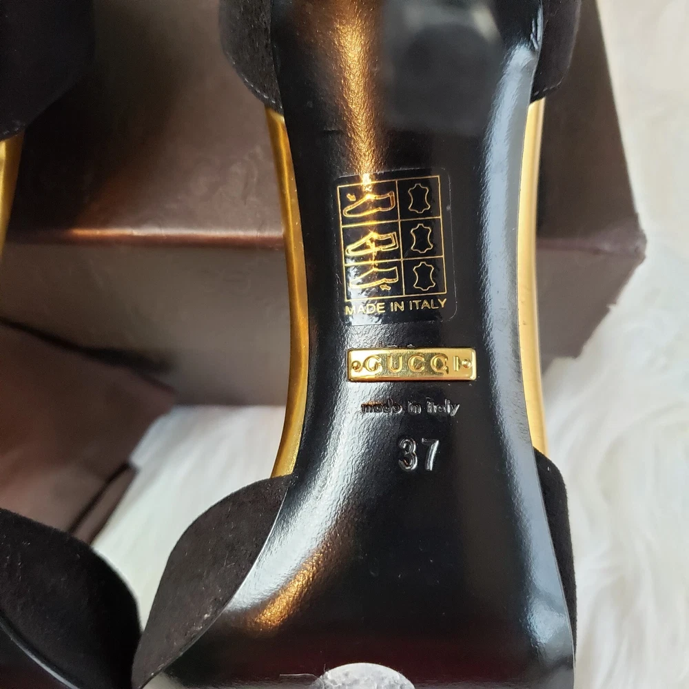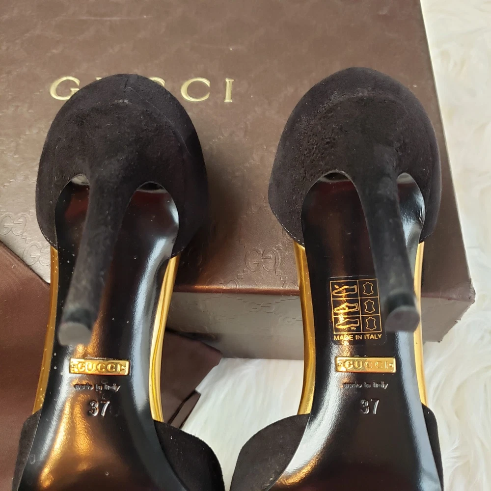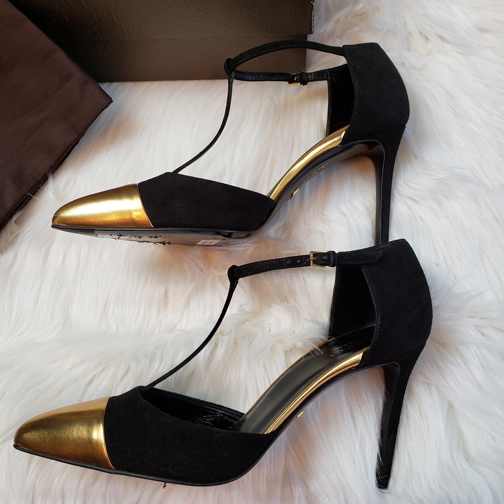 Gucci Womens Suede/Kidskin Strappy Gold Toe T-Strap Heels Black Size 37. 3" heel. Normal Wear, Great condition. Free Priority Mail Shipping Please email for additional photos/info